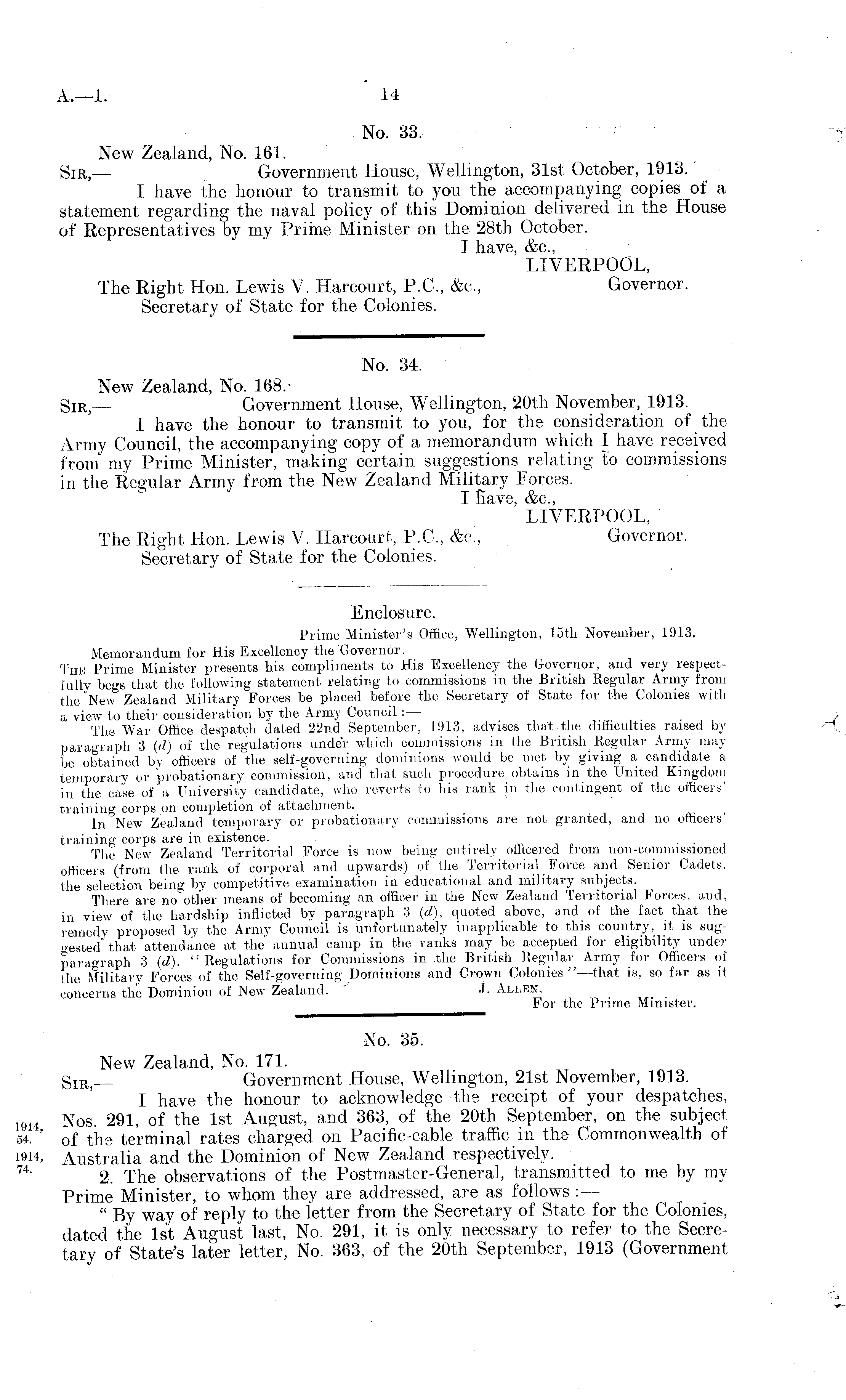 No. 34. New Zealand, No. 168.Sir, Government House, Wellington, 20th November, 1913. I have the honour to transmit to you, for the consideration of the Army Council, the accompanying copy of a memorandum which I have received from my Prime Minister, making certain suggestions relating to commissions in the Regular Army from the New Zealand Military Forces. I Gave, &c, LIVERPOOL, The Right Hon. Lewis V. Harcourt, P.G, &c. Governor. Secretary of State for the Colonies.