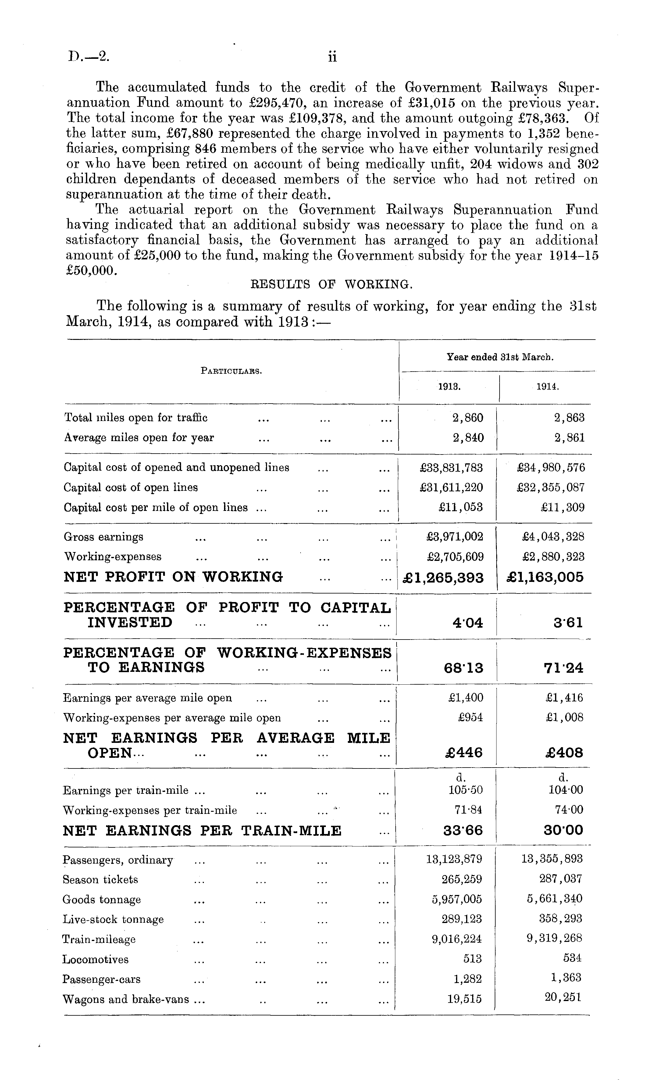 The accumulated funds to the credit of the Government Railways Superannuation Fund amount to £295,470, an increase of £31,015 on the previous year. The total income for the year was £109,378, and the amount outgoing £78,363. Of the latter sum, £67,880 represented the charge involved in payments to 1,352 beneficiaries, comprising 846 members of the service who have either voluntarily resigned or who have been retired on account of being medically unfit, 204 widows and 302 children dependants of deceased members of the service who had not retired on superannuation at the time of their death. The actuarial report on the Government Railways Superannuation Fund having indicated that an additional subsidy was necessary to place the fund on a satisfactory financial basis, the Government has arranged to pay an additional amount of £25,000 to the fund, making the Government subsidy for the year 1914-15 £50,000. RESULTS OF WORKING. The following is a summary of results of working, for year ending the 31st March, 1914, as compared with 1913 : —