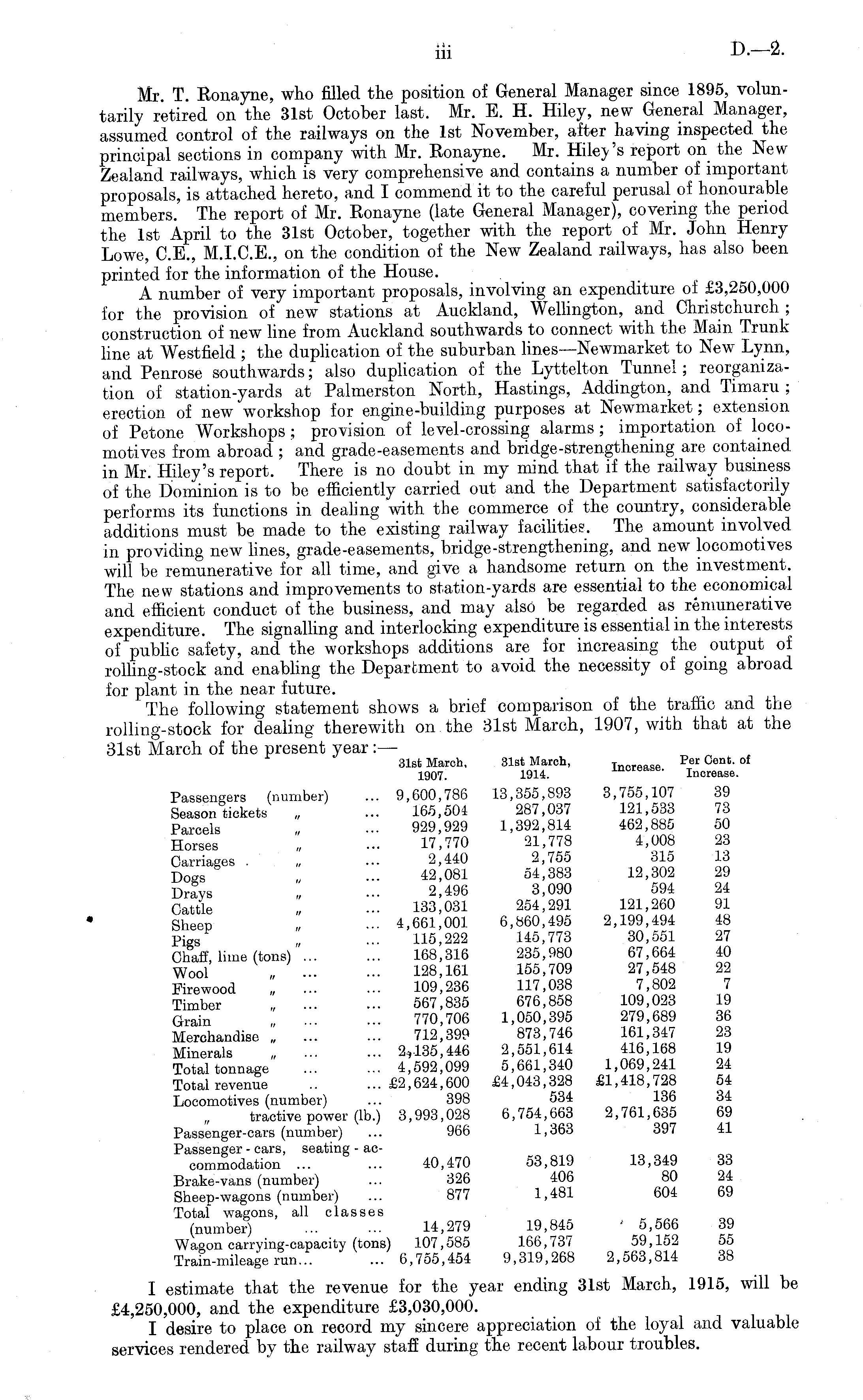 Mr. T. Ronayne, who filled the position of General Manager since 1895, voluntarily retired on the 31st October last. Mr. E. H. Hiley, new General Manager, assumed control of the railways on the Ist November, after having inspected the principal sections in company with Mr. Ronayne. Mr. Hike's report on the New Zealand railways, which is very comprehensive and contains a number of important proposals, is attached hereto, and I commend it to the careful perusal of honourable members. The report of Mr. Ronayne (late General Manager), covering the period the Ist April to the 31st October, together with the report of Mr. John Henry Lowe, C.E., M.1.C.E., on the condition of the New Zealand railways, has also been printed for the information of the House. A number of very important proposals, involving an expenditure of £3,250,000 for the provision of new stations at Auckland, Wellington, and Christchurch ; construction of new line from Auckland southwards to connect with the Main Trunk line at Westfield ; the duplication of the suburban lines—Newmarket to New Lynn, and Penrose southwards; also duplication of the Lyttelton Tunnel ; reorganization of station-yards at Palmerston North, Hastings, Addington, and Timaru ; erection of new workshop for engine-building purposes at Newmarket; extension of Petone Workshops ; provision of level-crossing alarms ; importation of locomotives from abroad ; and grade-easements and bridge-strengthening are contained in Mr. Hiley's report. There is no doubt in my mind that if the railway business of the Dominion is to be efficiently carried out and the Department satisfactorily performs its functions in dealing with the commerce of the country, considerable additions must be made to the existing railway facilities. The amount involved in providing new lines, grade-easements, bridge-strengthening, and new locomotives will be remunerative for all time, and give a handsome return on the investment. The new stations and improvements to station-yards are essential to the economical and efficient conduct of the business, and may also be regarded as remunerative expenditure. The signalling and interlocking expenditure is essential in the interests of public safety, and the workshops additions are for increasing the output of rolling-stock and enabling the Department to avoid the necessity of going abroad for plant in the near future. The following statement shows a brief comparison of the traffic and the rolling-stock for dealing therewith on the 31st March, 1907, with that at the 31st March of the present year : — 31st March, 31st March, increase Per Oent - of 1907. 19H. increase. Inorease _ Passengers (number) ... 9,600,786 13,355,893 3,755,107 39 Season tickets „ ... 165,504 287,037 121,533 73 Parcels „ ... 929,929 1,392,814 462,885 50 Horses „ ... 17,770 21,778 4,008 23 Carriages . „ ... 2,440 2,755 315 13 Dogs „ ... 42,081 54,383 12,302 29 Drays „ ... 2,496 3,090 594 24 Cattle „ - 133,031 254,291 121,260 91 Sheep „ ... 4,661,001 6,860,495 2,199,494 48 Pigs ... 115,222 145,773 30,551 27 Chaff, lime (tons)" 168,316 235,980 67,664 40 Wool 128,161 155,709 27,548 22 Firewood „ 109,236 117,038 7,802 7 Timber „ 567,835 676,858 109,023 19 Grain 770,706 1,050,395 279,689 36 Merchandise „ 712,399 873,746 161,347 23 Minerals „ 2,135,446 2,551,614 416,168 19 Total tonnage 4,592,099 5,661,340 1,069,241 24 Total revenue £2,624,600 £4,043,328 £1,418,728 54 Locomotives (number) ... 398 534 136 34 tractive power (lb.) 3,993,028 6,754,663 2,761,635 69 Passenger-cars (number) ... 966 1,363 397 41 Passenger - cars, seating - accommodation ... ... 40,470 53,819 13,349 33 Brake-vans (number) ... 326 406 80 24 Sheep-wagons (number) ... 877 1,481 604 69 Total wagons, all classes (number) 14,279 19,845 5,566 39 Waeon carrying-capacity (tons) 107,585 166,737 59,152 55 Train-mileage run... ... 6,755,454 9,319,268 2,563,814 38 I estimate that the revenue for the year ending 31st March, 1915, will be £4,250,000, and the expenditure £3,030,000. I desire to place on record my sincere appreciation of the loyal and valuable services rendered by the railway staff during the recent labour troubles.