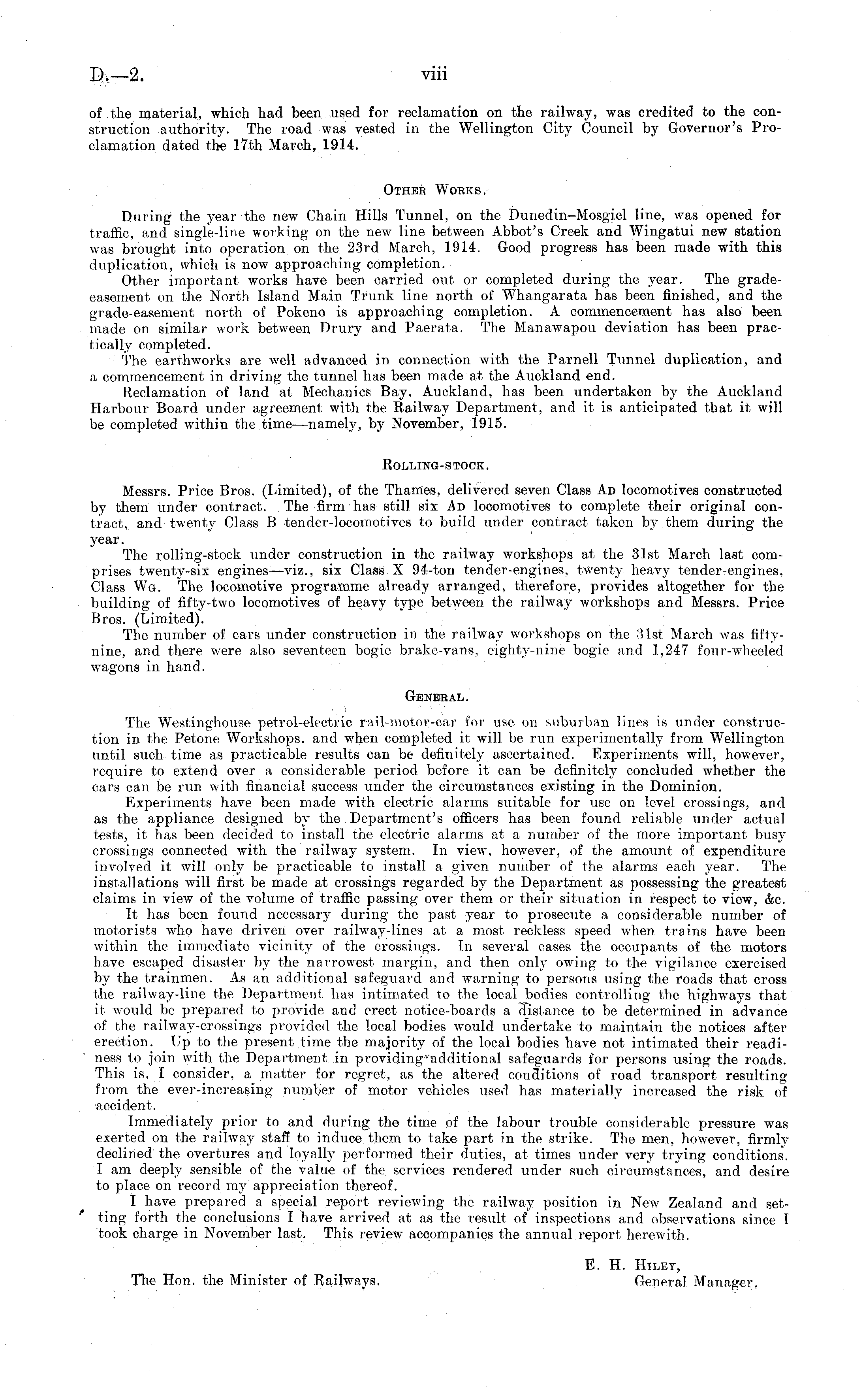 of the material, which had been used for reclamation on the railway, was credited to the construction authority. The road was vested in the Wellington City Council by Governor's Proclamation dated the 17th March, 1914. Other Works. During the year the new Chain Hills Tunnel, on the Dunedin-Mosgiel line, was opened for traffic, and single-line working on the new line between Abbot's Creek and Wingatui new station was brought into operation on the 23rd March, 1914. Good progress has been made with this duplication, which is now approaching completion. Other impoi-tant works have been carried out or completed during the year. The gradeeasement on the North Island Main Trunk line north of Whangarata has been finished, and the grade-easement north of Pokeno is approaching completion. A commencement has also been made on similar work between Drury and Paerata. The Manawapou deviation has been practically completed. The earthworks are well advanced in connection with the Parnell Tunnel duplication, and a commencement in driving the tunnel has been made at the Auckland end. Reclamation of land at Mechanics Bay, Auckland, has been undertaken by the Auckland Harbour Board under agreement with the Railway Department, and it is anticipated that it will be completed within the time—namely, by November, 1915. Rolling-stock. Messrs. Price Bros. (Limited), of the Thames, delivered seven Class Ad locomotives constructed by them under contract. The firm has still six Ad locomotives to complete their original contract, and twenty Class B tender-locomotives to build under contract taken by them during the year. The rolling-stock under construction in the railway workshops at the 31st March last comprises twenty-six engines-—viz., six Class X 94-ton tender-engines, twenty heavy tender-engines, Class Wβ. The locomotive programme already arranged, therefore, provides altogether for the building of fifty-two locomotives of heavy type between the railway workshops and Messrs. Price Bros. (Limited). The number of cars under construction in the railway workshops on the 31st March was fiftynine, and there were also seventeen bogie brake-vans, eighty-nine bogie and 1,247 four-wheeled wagons in hand. General. The Westinghouse petrol-electric rail-motor-car for use on suburban lines is under construction in the Petone Workshops, and when completed it will be run experimentally from Wellington until such time as practicable results can be definitely ascertained. Experiments will, however, require to extend over a considerable period before it can be definitely concluded whether the cars can be run with financial success under the circumstances existing in the Dominion. Experiments have been made with electric alarms suitable for use on level crossings, and as the appliance designed by the Department's officers has been found reliable under actual tests, it has been decided to install the electric alarms at a number of the more important busy crossings connected with the railway system. In view, however, of the amount of expenditure involved it will only be practicable to install a given number of the alarms each year. The installations will first be made at crossings regarded by the Department as possessing the greatest claims in view of the volume of traffic passing over them or their situation in respect to view, &c. It lias been found necessary during the past year to prosecute a considerable number of motorists who have driven over railway-lines at a most reckless speed when trains have been within the immediate vicinity of the crossings. In several cases the occupants of the motors have escaped disaster by the narrowest margin, and then only owing to the vigilance exercised by the trainmen. As an additional safeguard and warning to persons using the roads that cross the railway-line the Department has intimated to the local _bodies controlling the highways that it would be prepared to provide and erect notice-boards a distance to be determined in advance of the railway-crossings provided the local bodies would undertake to maintain the notices after erection. Up to the present time the majority of the local bodies have not intimated their readiness to join with the Department in providing additional safeguards for persons using the roads. 'This is, I consider, a matter for regret, as the altered conditions of road transport resulting from the ever-increasing number of motor vehicles used has materially increased the risk of ■accident. Immediately prior to and during the time of the labour trouble considerable pressure was exerted on the railway staff to induce them to take part in the strike. The men, however, firmly declined the overtures and loyally performed their duties, at times under very trying conditions'. I am deeply sensible of the value of the services rendered under such circumstances, and desire to place on record my appreciation thereof. I have prepared a special report reviewing the railway position in New Zealand and setting forth the conclusions I have arrived at as the result of inspections and observations since I took charge in November last. This review accompanies the annual report herewith. E. H. HILET, The Hon. the Minister of Railways, General Manager,