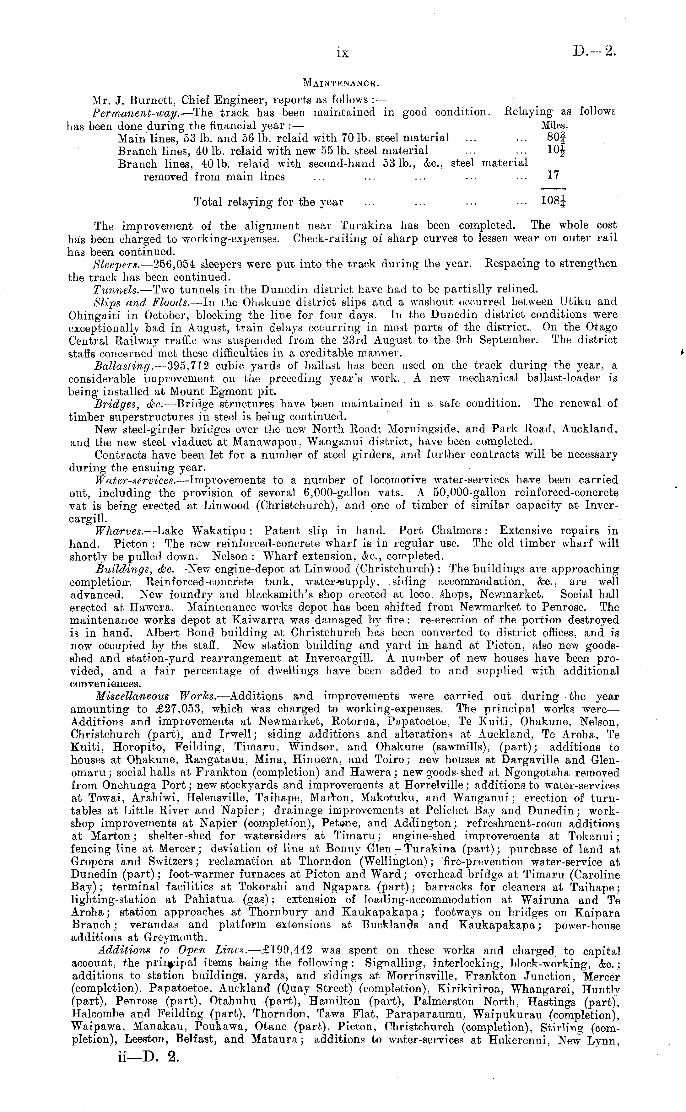 Maintenance. Mr. J. Burnett, Chief Engineer, reports as follows :— Permanent-way. —The track has been maintained in good condition. Relaying as follows has been done during the financial year : — Miles. Main lines, 53 lb. and 56 lb. relaid with 70 lb. steel material ... ... 80f Branch lines, 401b. relaid with new 551b. steel material ... ... 10J Branch lines, 401b. relaid with second-hand 53 Ib., &c, steel material removed from main lines ... ... ... ••• ••• 17 Total relaying for the year ... ... ... ••• 108J The improvement of the alignment near Turakina has been completed. The whole cost has been charged to working-expenses. Check-railing of sharp curves to lessen wear on outer rail has been continued. Sleepers. —2s6,os4 sleepers were put into the track during the year. Respacing to strengthen the track has been continued. Tunnels. —Two tunnels in the Dunedm district have had to be partially relined. Slips and Floods. —ln the Ohakune district slips and a washout occurred between Utiku and Ohingaiti in October, blocking the line for four days. In the Dunedin district conditions were exceptionally bad in August, train delays occurring in most parts of the district. On the Otago Central Railway traffic was suspended from the 23rd August to the 9th September. The district staffs concerned met these difficulties in a creditable manner. ♦ Ballasting. —39s,7l2 cubic yards of ballast has been used on the track during the year, a considerable improvement on the preceding year's work. A new mechanical ballast-loader is being installed at Mount Egmont pit. Bridges, dec. —Bridge structures have been maintained in a safe condition. The renewal of timber superstructures in steel is being continued. New steel-girder bridges over the new North Road; Morningside, and Park Road, Auckland, and the new steel viaduct at Manawapou, Wanganui district, have been completed. Contracts have been let for a number of steel girders, and further contracts will be necessary during the ensuing year. Water-services. —Improvements to a number of locomotive water-services have been carried out, including the provision of several 6,000-gallon vats. A 50,000-gallon reinforced-concrete vat is being erected at Linwood (Christchurch), and one of timber of similar capacity at Invercargill. Wharves. —Lake Wakatipu : Patent slip in hand. Port Chalmers: Extensive repairs in hand. Picton : The new reinforced-concrete wharf is in regular use. The old timber wharf will shortly be pulled down. Nelson : Wharf-extension, &c, completed. Buildings, &c. —New engine-depot at Linwood (Christchurch) : The buildings are approaching completion-. Reinforced-concrete tank, water-supply, siding accommodation, &c, are well advanced. New foundry and blacksmith's shop erected at loco, shops, Newmarket. Social hall erected at Hawera. Maintenance works depot has been shifted from Newmarket to Penrose. The maintenance works depot at Kaiwarra was damaged by fire : re-erection of the portion destroyed is in hand. Albert Bond building at Christchurch has been converted to district offices, and is now occupied by the staff. New station building and yard in hand at Picton, also new goodsshed and station-yard rearrangement at Invercargill. A number of new houses have been provided, and a fair percentage of dwellings have been added to and supplied with additional conveniences. Miscellaneous Works. —Additions and improvements were carried out during the year amounting to £27,053, which was charged to working-expenses. The principal works were— Additions and improvements at Newmarket, Rotorua, Papatoetoe, Te Kuiti, Ohakune, Nelson, Christchurch (part), and Irwell; siding additions and alterations at Auckland, Te Aroha, Te Kuiti, Horopito, Feilding, Timaru, Windsor, and Ohakune (sawmills), (part); additions to houses at Ohakune, Rangataua, Mina, Hinuera, and Toiro; new houses at Dargaville and Glenomaru; social halls at Frankton (completion) and Hawera; new goods-shed at Ngongotaha removed from Onehunga Port; new stockyards and improvements at Horrelville; additions to water-services at Towai, Arahiwi, Helensville, Taihape, Marton, Makotuku, and Wanganui; erection of turntables at Little River and Napier; drainage improvements at Pelichet Bay and Dunedin; workshop improvements at Napier (completion), Petone, and Addington; refreshment-room additions at Marton; shelter-shed for watersiders at Timaru; engine-shed improvements at Tokanui; fencing line at Mercer; deviation of line at Bonny Glen - Turakina (part); purchase of land at Gropers and Switzers; reclamation at Thorndon (Wellington); fire-prevention water-service at Dunedin (part); foot-warmer furnaces at Picton and Ward; overhead bridge at Timaru (Caroline Bay); terminal facilities at Tokorahi and Ngapara (part); barracks for cleaners at Taihape; lighting-station at Pahiatua (gas); extension of loading-accommodation at Wairuna and Te Aroha; station approaches at Thornbury and Kaukapakapa; footways on bridges on Kaipara Branch; verandas and platform extensions at Bucklands and Kaukapakapa; power-house additions at Greymouth. Additions to Open Lines. —£l99,442 was spent on these works and charged to capital account, the principal items being the following : Signalling, interlocking, block-working, &c.; additions to station buildings, yards, and sidings at Morrinsville, Frankton Junction, Mercer (completion), Papatoetoe, Auckland (Quay Street) (completion), Kirikiriroa, Whangarei, Huntly (part), Penrose (part), Otahuhu (part), Hamilton (part), Palmerston North, Hastings (part), Halcombe and Feilding (part), Thorndon, Tawa Flat, Paraparaumu, Waipukurau (completion), Waipawa, Manakau, Poukawa, Otane (part), Picton, Christchurch (completion), Stirling (completion), Leeston, Belfast, and Mataura; additions to water-services at Hukerenui, New Lynn,