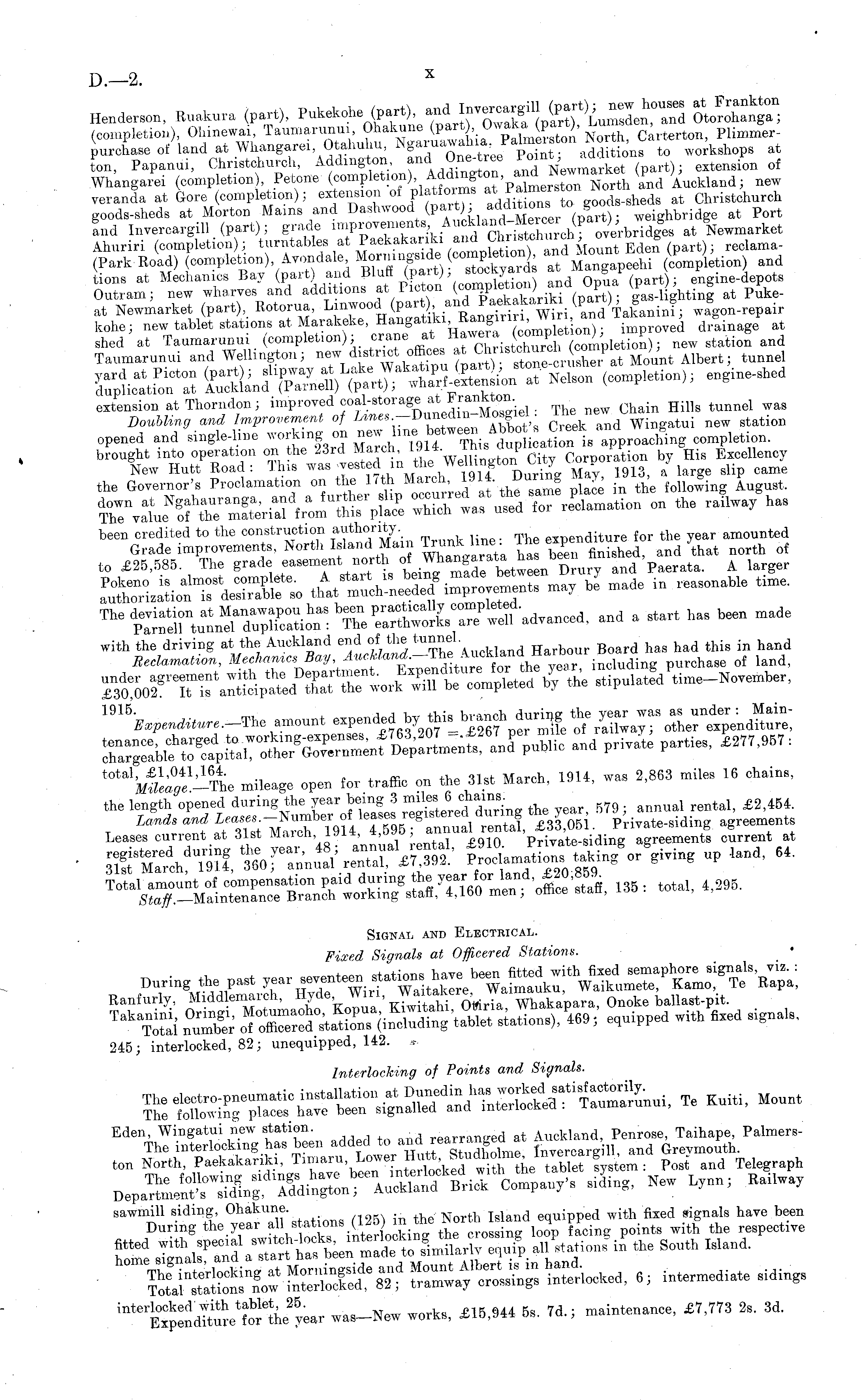 Henderson, Ruakura (part), gjS2£ (completion), Ohinewai, Taumarunui Ohakune P^'.^™ m e?ston North, Carterton, Plimmerpurchase of land at Whangarei , Otahuhu, Nganiawahia^ P «™*° n a^M to workshops at ton, Papanui, Christchurch, Aldington, and i oint^, <* extension of Whangarei (completion, PeUme (^? l^°f^^fZ'?TlLr,Z North and Auckland; new veranda at Gore (completion); extension oi ad ditions to -oods-sheds at Christchurch goods-sheds at Morton Mams and Dashwood (part), a™ l * l "™ to ( »° rt) . we ighbridge at Port and Invercargill (part); grade improvements ( par ;4 bbrides|es at Newmarket Ahuriri (completion); turntables at Paekakariki and^™^ (part); reclama(Park Road) (completion), Avondale Mo-ingside ■ &^ tions at Mechanics Bay (part) and Blutt pait) stocKjaras Op u a r ( part ); engine-depots Outram; new wharves and additions at Picton W * n . d ( T' ( g P as .l ghting at Pukeat Newmarket (part),, llotorua, Lmwood (part a I aek, kanki (part w f n _ repalr kohe; new tablet stauons at improved drainage at rfeo.io»..tThomdon; i '°P'"f d f ""%"* a[™M o °«iel ■ The ne»- Chain Hill, tuimd ™ been credited to the construction authority. expenditure for the year amounted '"'"kfC.'-lt mileage «pc« to traffic » M.roh. l»lt, » 2,863 mile. 16 eh.in.. Signal and Electrical. Fixed Signals at Officered Stations. Ranfurly, Middlemarch, Hyd e; Win , whaka Onoke ballast-pit. Taka Total nS stations), P 469 ; equipped with fixed signals, 245; interlocked, 82; unequipped, 142. Interlocking of Points and Signals. £ t£;^^^:rt^stri D sS c -r i s:rL.i, T . H ,«- Eden, Wingatui new station. rearranged at Auckland, Penrose, Taihape, PalmersJ Ssf^dVgraph sawmill siding the' North Island equipped with fixed signals have been During **» y? the crossing loop facing points with the respective nom d e to Lill equip, all stations in the South Island. ■ ' =S --eked, C; intermediate sidings inte t?;endHuL*e 2 year was-New works, £15,944 ss. 7d. ; maintenance, £7,773 2s. 3d.