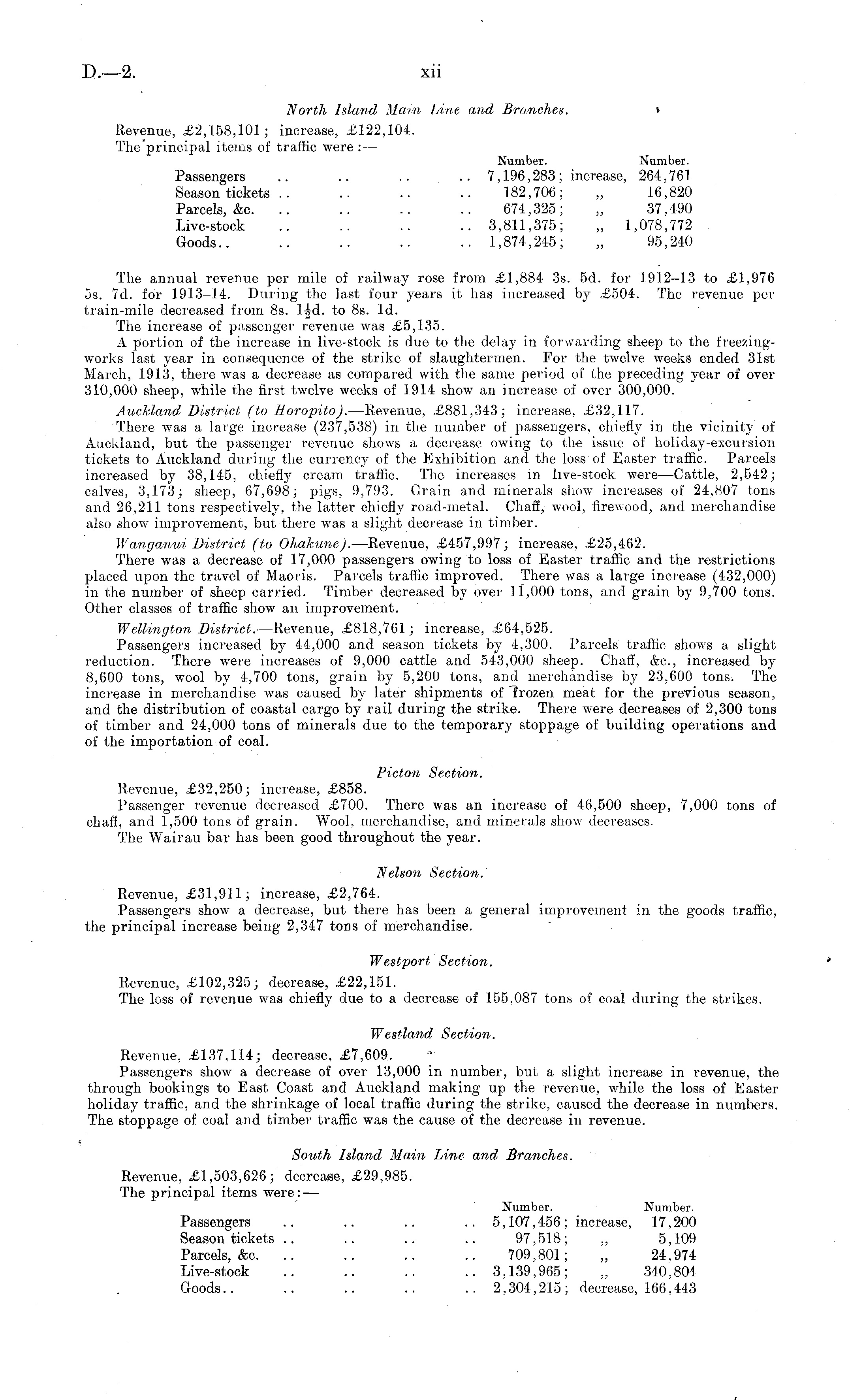 North Island Main Line and Branches. • Revenue, £2,158,101; increase, £122,104. The principal items of traffic were : — Number. Number. Passengers .. .. .. ..7,196,283; increase, 264,761 Season tickets .. .. .. .. 182,706; „ 16,820 Parcels, &c. .. .. .. .. 674,325; „ 37,490 Live-stock .. .. .. .. 3,811,375; „ 1,078,772 Goods.. .. .. .. .. 1,874,245; „ 95,240 The annual revenue per mile of railway rose from £1,884 3s. sd. for 1912-13 to £1,976 ss. 7d. for 1913-14. During the last four years it has increased by £504. The revenue per train-mile decreased from Bs. to Bs. Id. The increase of passenger revenue was £5,135. A portion of the increase in live-stock is due to the delay in forwarding sheep to the freezingworks last year in consequence of the strike of slaughtermen. For the twelve weeks ended 31st March, 1913, there was a decrease as compared with the same period of the preceding year of over 310,000 sheep, while the first twelve weeks of 1914 show an increase of over 300,000. Auckland District (to lloropito). —Revenue, £881,343; increase, £32,117. There was a large increase (237,538) in the number of passengers, chiefly in the vicinity of Auckland, but the passenger revenue shows a decrease owing to the issue of holiday-excursion tickets to Auckland during the currency of the Exhibition and the loss of Easter traffic. Parcels increased by 38,145, chiefly cream traffic. The increases in live-stock were —Cattle, 2,542; calves, 3,173; sheep, 67,698; pigs, 9,793. Grain and minerals show increases of 24,807 tons and 26,211 tons respectively, the latter chiefly road-metal. Chaff, wool, firewood, and merchandise also show improvement, but there was a slight decrease in timber. Wanganui District (to Ohakune). —Revenue, £457,997; increase, £25,462. There was a decrease of 17,000 passengers owing to loss of Easter traffic and the restrictions placed upon the travel of Maoris. Parcels traffic improved. There was a large increase (432,000) in the number of sheep carried. Timber decreased by over 11,000 tons, and grain by 9,700 tons. Other classes of traffic show an improvement. Wellington District. —Revenue, £818,761; increase, £64,525. Passengers increased by 44,000 and season tickets by 4,300. Parcels traffic shows a slight reduction. There were increases of 9,000 cattle and 543,000 sheep. Chaff, &c, increased by 8,600 tons, wool by 4,700 tons, grain by 5,200 tons, and merchandise by 23,600 tons. The increase in merchandise was caused by later shipments of frozen meat for the previous season, and the distribution of coastal cargo by rail during the strike. There were decreases of 2,300 tons of timber and 24,000 tons of minerals due to the temporary stoppage of building operations and of the importation of coal. Picton Section. Revenue, £32,250; increase, £858. Passenger revenue decreased £700. There was an increase of 46,500 sheep, 7,000 tons of chaff, and 1,500 tons of grain. Wool, merchandise, and minerals show decreases. The Wairau bar has been good throughout the year. Nelson Section. Revenue, £31,911; increase, £2,764. Passengers show a decrease, but there has been a general improvement in the goods traffic, the principal increase being 2,347 tons of merchandise. Westport Section. * Revenue, £102,325; decrease, £22,151. The loss of revenue was chiefly due to a decrease of 155,087 tons of coal during the strikes. Westland Section. Revenue, £137,114; decrease, £7,609. Passengers show a decrease of over 13,000 in number, but a slight increase in revenue, the through bookings to East Coast and Auckland making up the revenue, while the loss of Easter holiday traffic, and the shrinkage of local traffic during the strike, caused the decrease in numbers. The stoppage of coal and timber traffic was the cause of the decrease in revenue. South Island Main Line and Branches. Revenue, £1,503,626; decrease, £29,985. The principal items were: — Number. Number. Passengers .. .. .. .. 5,107,456; increase, 17,200 Season tickets .. .. .. .. 97,518; „ 5,109 Parcels, &c. .. .. .. .. 709,801; „ 24,974 Live-stock .. .. .. .. 3,139,965; „ 340,804 Goods.. .. .. .. ..2,304,215; decrease, 166,443
