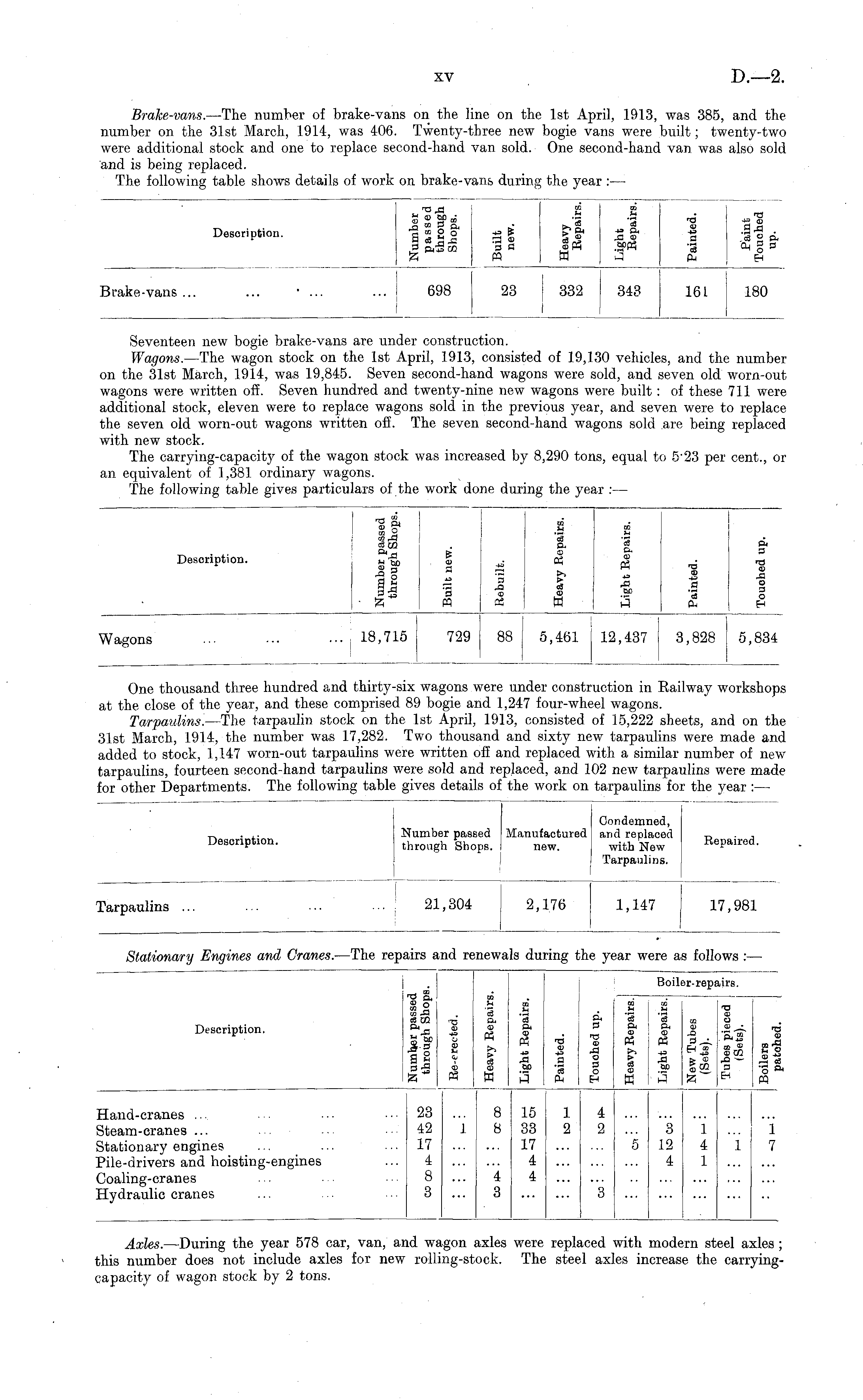 Brake-vans. —The number of brake-vans on the line on the Ist April, 1913, was 385, and the number on the 31st March, 1914, was 406. Twenty-three new bogie vans were built; twenty-two were additional stock and one to replace second-hand van sold. One second-hand van was also sold and is being replaced. The following table shows details of work on brake-vans during the year : —