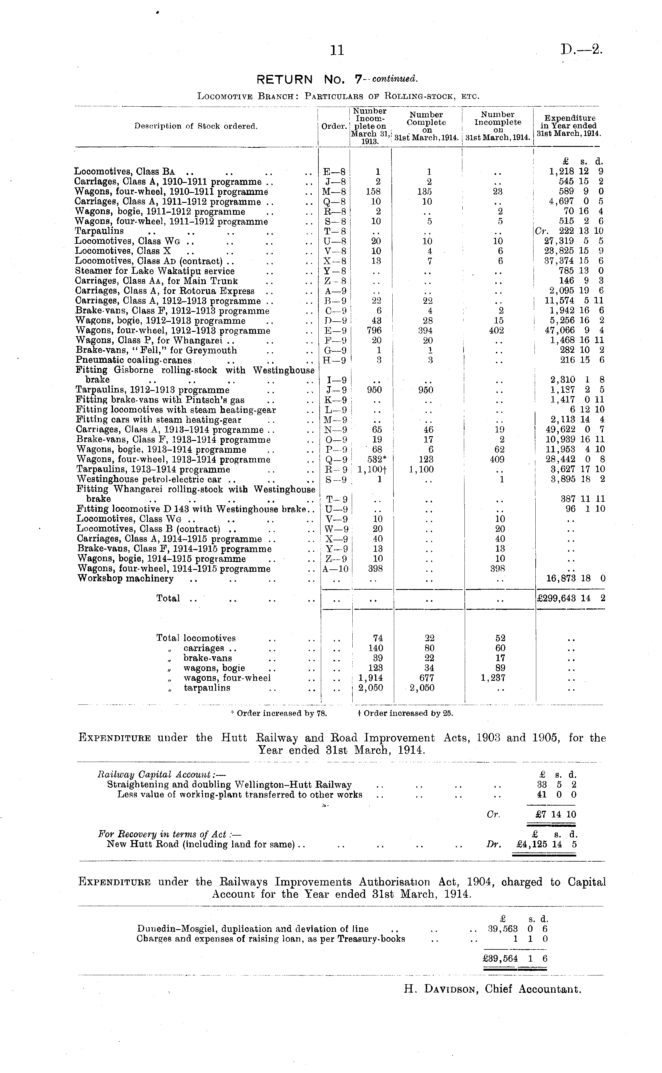 * Order increased by 78. t Order increased by 25. Expenditure under the Hutt Eailway and Eoad Improvement Acts, 1903 and 1905, for the Tear ended 31st March, 1914. Railway Capital Account: — £ s. d. Straightening and doubling V'ellington-Hutfc Railway .. .. .. .. 33 5 2 Less value of working-plant transferred to other works .. .. .. .. 41 0 0 Or. £7 14 10 For Recovery in terms of Act: — £ s. d. New Hutt Road (including land for same) .. .. .. .. .. Dr. £4,125 14 5 Expendituee under the Eailways Improvements Authorisation Act, 1904, charged to Capital Account for the Year ended 31st March, 1914. £ s. d. Dunedin-Mosgiel, duplication and deviation of line .. .. .. 39,563 0 6 Charges and expenses of raising- loan, as per Treasury-books .. .. 110 £39,564 1 6 H. Davidson, Chief Accountant.
