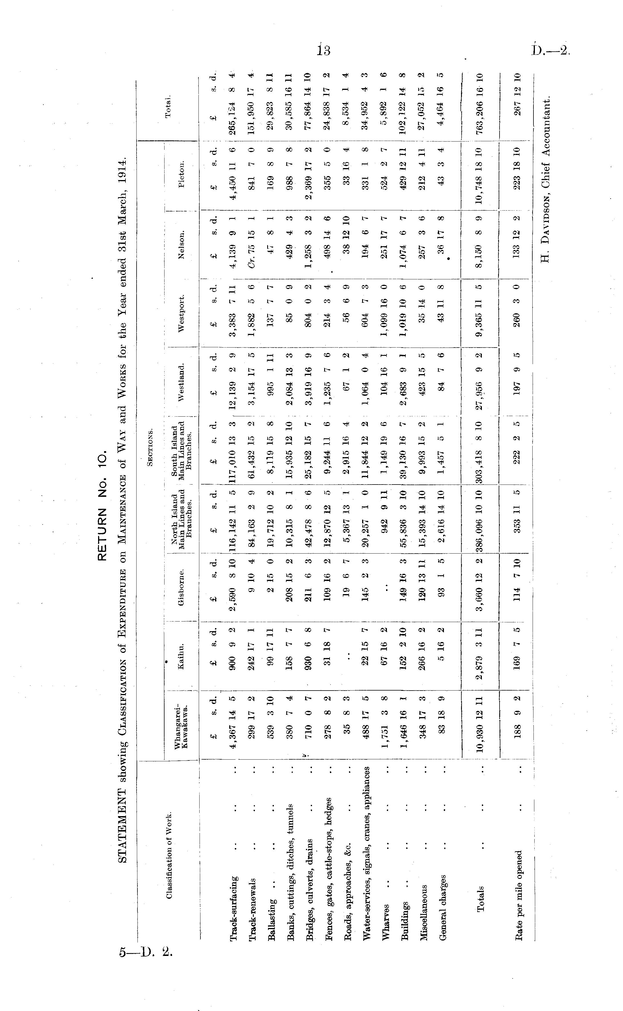 Classification of Work. WhangareiKawakawa. Kaihu. Gisborne. North Island Main Lines and Branches. Sections. South Island j Main Lines and j Branches. Westland. Westport. i i Total. Nelson. Pieton. I £ s. d. £ s. d. : £ s. d. 117,010 13 3 12,139 2 9 3,383 7 11 l 61,432 15 2 3,154 17 5 1,882 5 6 £ s. d. £ s. d. £ s. d. : 4,139 9 1 4,450 11 6 j 265,124 8 4 Or. 75 15 1 841 7 0 151,950 17 4 £ s. d. £ s. d. £ s. d. £ s. d. Track-surfacing .. .. ..I 4,367 14 5 900 9 2 2,590 8 10 116,142 11 5 Track-renewals .. .. .. 299 17 2 242 17 1 9 10 4 84,163 2 9 ! Ballasting .. .. .. .. 539 3 10 99 17 11 2 15 0 19,712 10 2 8,119 15 8 995 1 11 137 7 7 15,935 12 10 2,084 13 3 I 85 0 9 47 8 1 169 8 9 29,823 8 11 429 4 3 988 7 8 | 30,585 16 11 Banks, cuttings, ditches, tunnels .. 380 7 4 158 7 7 208 15 2 10,315 8 1 Bridges, culverts, drains .. .. * 710 0 7 930 6 8 211 6 3 42,478 8 6 25,182 15 7 3,919 16 9 804 0 2 1,258 3 2 2,369 17 2 ' 77,864 14 10 Fences, gates, cattle-stops, hedges .. 278 8 2 31 18 7 109 16 2 12,870 12 5 9,244 11 6 1,235 7 6 214 3 4 498 14 6 355 5 0 24,838 17 2 Roads, approaches, &c. .. .. 35 8 3 19 6 7 5,367 13 1 2,915 16 4 67 1 2 56 6 9 38 12 10 33 16 4 8,534 1 4 Water-aervices, signals, cranes, appliances 488 17 5 22 15 7 145 2 3 20,257 1 0 11,844 12 2 1,064 0 4 I 604 7 3 1,149 19 6 104 16 1 1,099 16 0 j i 39,130 16 7 2,683 9 1 I 1,019 10 6 9,993 15 2 423 15 5 35 14 0 1,457 5 1 J 84 7 6 43 11 8 194 6 7 331 1 8 34,952 4 3 251 17 7 524 2 7 5,892 1 6 1,074 6 7 429 12 11 ; 102,122 14 8 257 3 6 212 4 11 27,052 15 2 36 17 8 43 3 4 4,464 16 5 Wharves .. .. .. .. 1,751 3 8 67 16 2 942 9 11 ! Buildings .. .. .. .. 1,646 16 1 152 2 10 149 16 3 55,836 3 10 Miscellaneous .. .. .. 348 17 3 266 16 2 120 13 11 15,393 14 10 General charges .. .. .. 83 18 9 5 16 2 93 1 5 2,616 14 10 j ! Totals .. .. .. 10,930 12 11 2,879 3 11 3,660 12 2 386,096 10 10 303,418 8 10 27,956 9 2 9,365 11 5 8,150 8 9 10,748 18 10 763,206 16 10 Rate per mile opened .. .. 188 9 2 169 7 5 114 7 10 353 11 5 222 2 5 197 9 5 260 3 0 133 12 2 223 18 10 267 12 10