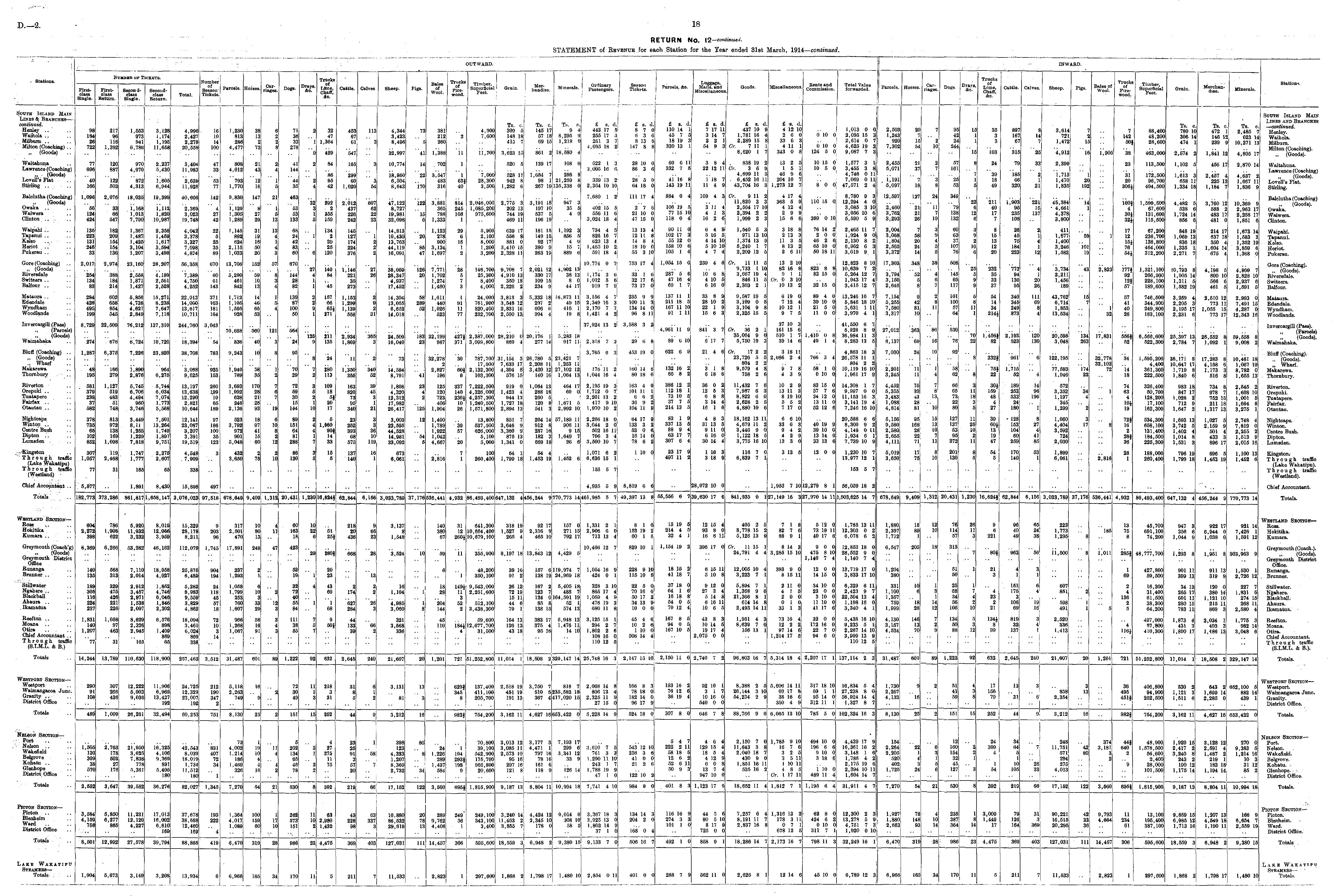 OUTWARD. INWARD. ■ Stations. Second- Secondclass clues Total. Sluglo. Return. X umber Carriage. Dmys Trucks of Liino, CliaJf, Ac. Cattle. Calves Sheep. —.— . B&lee I'igs. of Wool. Trucks of Fivewood. Timber, ■.. .. Grain, ; ,™ a e £ B0 . Ordinary L'aKKuiigers. Sen so i> Parcels, ftc. I Miscellaneous.] Goodn. Rents and CoillllliSBioM. Totnl Value forwarded. „..„- Carno us, riagoe. Drays, &c. TruoliB of Chats', I Calves. Sheep. Bui OH Of Wool. Trwriu Tjmb wood. lueL Stations. Parcels. lloVM.'S Dogs. Minerals, MiEuollaneous. Parcels, Dors Cattle. Pigs. Grain. .Merchandise. Minerals. FirstnliisH Firstli>iii'iji. Sooth Islaub Main Links ife BeanohBS- - continued. Henley .. Waiholn Mil burn Milton (Coaching) . .. (Goode) Wttitatmna Lawrence (Coaching) „ (Goods) Lovoll's Flat Stirling .. 722 9J is 217 9j6 116 1,392 1,553 973 941 8,1786 " i ! 3.128 ; 1.174 I. I9E 1 11,668 i 1.991 2,427 2,278 2O.r)fiN 16 10 14 100 1,230 813 286 4,477 73 31 ii •2 71 36 33 278 I 32 47 1.304 429 153 547 113 4.344 3.423 8,496 32,997 73 :, 41 381 212 21 in l^388 "2 ii 4,900 11,700 Ta. 0. 309 6 148 IS, 415 7 3,623 15 Tβ. c. 146 17 57 181 69 15 861 2 Ts. 0. 9 4 ! 8.295 !! I 1,218 0 IS.580 4 443 17 6 255 17 6 261 3 7 4,095 18 2l £ B. A. 8 7 0 fi 3 Ii 8 13 9 147 8 8 £ a. d. 110 14 1 45 7 5 18 19 3 330 13 1 £ a. d. I 7 17 11 i 3 14 7 t 2 2 1 [ i>4 9 3 £ a. ti. 437 10 9 1,781 16 4 2,289 Iβ 8 Or. 7 11 1 8,620 1 7 £ a. a, 4 12 10 2 6 0! 33 6 3 4 It 1 348 0 8 1 I 0 10 0 0 10 0 124 5 0 1,013 0 0 2,095 15 3 2,614 0 7 4.625 19 2 9,087 7 3 2,503 1,243 920 7,302 20 15 7 "J 10 12 21 1 lj "J 35 3 3 103 897 167 67 315 8 II 7 25 3,014 721 1,472 '4,912 1.1 16 M05 7 142 60} 38 88,400 48,200 28,600 463,000 Tβ. c. 780 10 306 14 474 1| 2,574 2| Ts. c. 472 1 146 12' 239 9! 1,841 12 Tβ. c. 2,485 7 623 14 10,271 13 4,805 17 South Island Main Lines and Branches — continued. Henley. Waihola, Milburn. Milton (Coauhing). .. (Goods). 77 696 40 106 120 887 122 503 1 970 4. i>70 "872. 4,313 1 II 2,237 1 5.4:)( ! J.U05 ! 6,944 3,404 11,983 2,681 11,926 47 33 SOS 4,012 "793 1,770 21 43 "l2 li 2! 4 41 III 44 35 2 84 80 95 42 165 3 10,774 is,860 6,504 8,643 I I . 702 3,547 483 316 1 1 031 40 7,000 2«.:i(Ki 3.500 528 11 942 8 1,282 6 189 17! 1,684 7 98 1 267 1!) 108 0 C22 I :i 8,006 Iβ ii 28 10 0 8fi 3 6 60 6 Hi 332 7 5 1 41 1(5 Si 143 19 11 i| :t 8 4 >' 22 12 11; il 1 18 7 11 4 9 838 ly 2 Or. 3 (i 9 4,60!) II 5 . 6,452 16 11 43,704 16 3 13 2 5 1 5 1 46 9 6 204 10 7 1,273 12 7 10 15 0 10 5 0 1,577 3 I 3,455 3 8 4,746 0 11 7,069 0 11 47,571 2 4 2,455 5,071 i,191 5,097 21 37 2 161 "25 53 24 79 38 2.399 i,713 1,470: l,835i 23 31 20 300) 113,500 172,500 96,700 494,500 1,102 5, 456 17 2,870 14 4,637 2 1,667 11 1.836 9 Waitahuna. Lawrence (Coaching) (Goods). Lovoll's Flat. Stirling. 53 77 1 1 299 60 1.020 54 22 1711 .. 298 8 21,259 8 135,338 0 339 18 2 2.364 10 10 28 5 0 l>4 18 0 8 0 0 18 s I 5 39 18 49 185 66 320 2 ]! 2!| 1 20 192 1,613 3 658 11 1,334 IS 2,467 4 225 13 1,184 7 4 Balclutha (Cowhing) (Goods) Owaka Waiwora Clinton ... .. 1,090 .-.li 1241 424 2,076 33 66 547 18,035 1,198 1,018 7,790 I 19.399 ; ijl2 1,820 10,987 ID.lilli 2.369 3,023 I!).7.1S 142 ■'4 27 42 a,830 L12I1 1,305 1,289 147 8 A 1 13 463 53 133 32 3 1 5 292 2 355 150 2.012 437 226; 242 ! 607 62 22 23 47,122 8,727 19,931 32,098 'i22J 3.881 305 788 1,333 si I 2-1 r> 108 1 2,046,000 1,085,200 975,6001 2,776 3 202 13 744 19 469 11 3,191 18 197 10 537 5 196 19 947 3 35 5 4 0 7,680 I 2 402 15 5 556 11 6 3,024 18 4 111 17 4 2 7 0 21 10 0 47 15 0 884 0 4J 106 19 51 77 15 10 118 0 4 lj 109 4 3 i :t 11 4 4 1 3 16 2 6 Cr. 9 11 2 11,820 3 3 2,564 17 10 2,394 2 2 1,999 2 3 4 17 4 363 5 9 4 12 4 2 9 9 15 6 6 110 15 0 369 0 10 8,780 9 3 12,294 4 0 3,085 3 10 8,056 10 6 5,590 5 9 12,597 I i 2,460 3,762 3,293 127 21 26 24 11 19 349 79 I3M 132 "22 6 I 211 40 17 7 l.itn:i 95 235 108 221 161 137 45,384 ■ 4,661| 4,378, 3,800 -14 1 ll» 4 311 32j [,699,600 67,600 131,600 115,500 4,482 5 538 6 1,724 14 856 6 3,760 12' 588 2! 483 17 481 0 10,369 I 2,963 17 2,258 17 1,851 6 Balclutha (Cmvcliing) (Goods). Owakft. Waiwera. Clinton. 8 27 29 "I Waipahi .. Tapnnui .. KelHO Horiot Pukorau 13si 223 131 240' 33 182 209 154 154 136 1,867 1.487 1.425 3,104 1.207 2,358 1,459 I 1,617 3.694 3,498 4.042 3,378 3,327 7,098 4,874 22 5 25 35 89 1,145 892 624 2,115 1.033 31 19 16 50 20 13J i 68 24 42 K lil I 6 134 2 20 25 120 146 127 174 224 376 14,813 10.430 13,763 44,119 16,091 20 1.123 278 900 3,134] 1,697 29 6 16 1 2 5,9Ool 2.IO0! 8,000, 1,200 3,200 l>39 17 556 8 881 0 3,410 15 2,328 II 181 15 149 15 92 17 380 9 263 19 I, l!)2 3 856 5 4 0 16 7 889 (i 734 4 5 826 16 7 623 13 4 1,465 10 2 591 18 41 13 13 4 12 11 8 14 8 I 18 10 0 55 3 10 90 II 0 102 17 3 55 12 0 158 10 6 1.05 1 4 6 4 9i 5 16 5 4 14 10 5 10 10 4 7 4 1,540 5 3 971 13 10 1,874 13 9 5,240 1 7 2,209 12 6 3 18 8 2 13 3 11 3 5 8 13 2 2 6 11 76 14 2 2 0 0 46 2 6. 65 10 0 50 18 11 2.405 11 7 1,924 9 0,i 2,130 8 2 6,962 6 3 3,019 9 1 2,004 ', 3,008 1,804 2,565 3,372 68 20 24 14 3 S 4 5 6 60 63 :;: 107 76 3 1, 2 10 1-i 8 15 13 12 20 26 1.3 75 184; 2231 2 1 411 1.677 1,4001 3,246j 1,582 59 101 19 1 17 12 15 76 54J 67,200 236,700 138,800 404,000 312,200 848 19 1,069 13 836 18 1,335 1 2,271 7 214 17 637 18 350 4 1,004 14 075 4 1.673 14 1,583 3 1,352 19 3,859 (i 1,368 0 Waipahi. Tapanui. Keleo. Horiot. Pukorau. 85 47 ' Goro (Coaching) .. „ (Goods) Rivoredftle SwitKors .. Bftlfour .. 2,017 2:. I l::i 83 2,974 "388 184 214 88,16(M 2,668 1.871 1.427 I 28,207 r.,s, 2,561 2,528 56.358 :.;;s:> 4,750 4,252 670 60 61 143 I3.70B r.'.aiHj 461 842 152 '' .V.I 10 13 070 144 28 82 27 4 140 84 '46 IJ4K 221 35 273 26 38,059 28,347 4,937 17,452 I2(i 2u 7;77l! 1,702j 1,274 1,460 28 ."> 3 146,700; 25,3001 8,400 4,000 9,708 7 4,910 13 350 18 2,226 2 2,021 12 330 17 109 15 234 9 4,902 13 38 13 8 0 44 17! 10.774 0 7 I 1,174 3 6 1,012 5 6 919 7 il 753 17 4 33 1 6 32 17 6 73 17 0 1,064 15 0 287 5 6 47 16 4 6!) 1 7 239 4 6 io' 6 8 4 10 5 6 16 0 Cr. 11 II 6 9,733 1 10