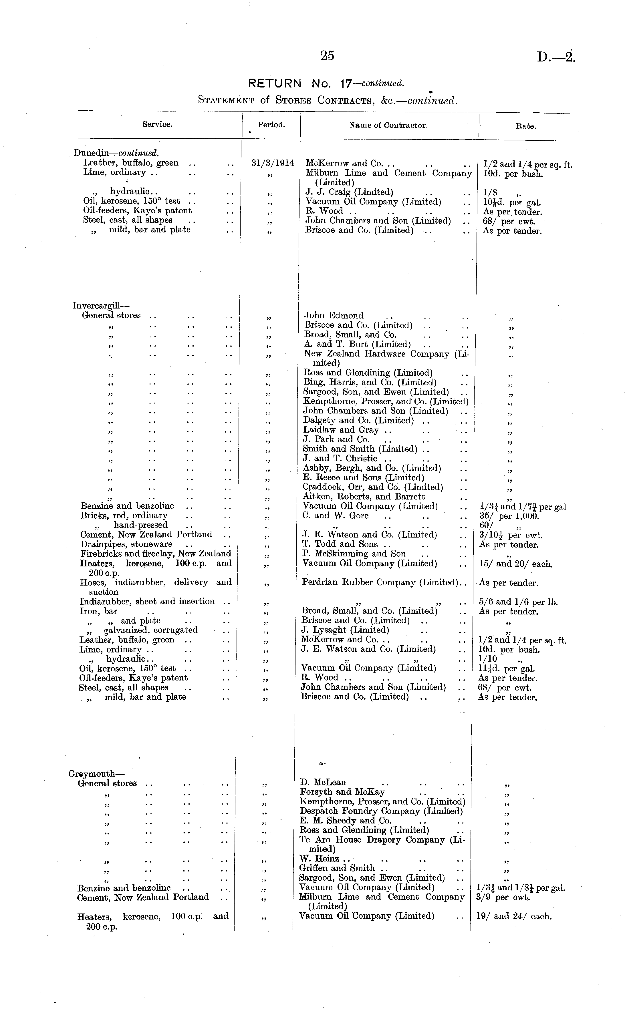 Service. Period. Name of Contractor. Bate. Dunedin.—continued. Leather, buffalo, green Lime, ordinary .. 31/3/1914 McKerrow and Co. Milburn Lime and Cement Company (Limited) J. J. Craig (Limited) Vacuum Oil Company (Limited) R. Wood John Chambers and Son (Limited) Briscoe and Co. (Limited) 1/2 and 1/4 per sq. ft, IOd. per bush. >1 „ hydraulic. Oil, kerosene, 150° test Oil-feeders, Kaye's patent Steel, cast, all shapes „ mild, bar and plate 1/8 lOJ-d. per gal. As per tender. 68/ per cwt. As per tender. Invercargill— General stores .. John Edmond .. Briscoe and Co. (Limited) Broad, Small, and Co. A. and T. Burt (Limited) . . New Zealand Hardware Company (Limited) Ross and Glendining (Limited) Bing, Harris, and Co. (Limited) Sargood, Son, and Ewen (Limited) Kempthome, Prosser, and Co. (Limited) John Chambers and Son (Limited) Dalgety and Co. (Limited) Laidlaw and Gray .. J. Park and Co. Smith and Smith (Limited) i J. and T. Christie Ashby, Bergh, and Co. (Limited) E. Reece and Sons (Limited) Craddock, Orr, and Co. (Limited) Aitken, Roberts, and Barrett Vacuum Oil Company (Limited) C. and W. Gore » )> " [ J( ,, Benzine and benzoline Bricks, red, ordinary ,, hand-pressed Cement, New Zealand Portland Drainpipes, stoneware Firebricks and fireclay, New Zealand Heaters, kerosene, 100 o.p. and 200 c.p. Hoses, indiarubber, delivery and suction Indiarubber, sheet and insertion .. Iron, bar „ „ and plate ,, galvanized, corrugated Leather, buffalo, green Lime, ordinary .. „ hydraulic Oil, kerosene, 150° test Oil-feeders, Kaye's patent Steel, cast, all shapes „ mild, bar and plate J. E. Watson and Co. (Limited) T. Todd and Sons P. McSkimming and Son Vacuum Oil Company (Limited) Perdrian Rubber Company (Limited).. Broad, Small, and Co. (Limited) Briscoe and Co. (Limited) J. Lysaght (Limited) McKerrow and Co. .. J. E. Watson and Co. (Limited) l/3Jandl/7f pergal 35/ per 1,000. 60/ 3/10J per cwt. Aβ per tender. 15/ and 20/ each. As per tender. 5/6 and 1/6 per lb. As per tender. >> 5> Vacuum Oil Company (Limited) R. Wood John Chambers and Son (Limited) Briscoe and Co. (Limited) 1/2 and 1/4 per sq. ft. IOd. per bush. 1/10 lljd. per gal. As per tender. 68/ per cwt. As per tender. if Sreymouth— General stores .. D. McLean Forsyth and McKay Kempthorne, Prosser, and Co. (Limited) Despatch Foundry Company (Limited) E. M. Sheedy and Co. Ross and Glendining (Limited) Te Aro House Drapery Company (Limited) W. Heinz Griffon and Smith Sargood, Son, and Ewen (Limited) Vacuum Oil Company (Limited) Milburn Lime and Cement Company (Limited) Vacuum Oil Company (Limited) ,, .. j> Benzine and benzoline Cement, New Zealand Portland .. l/3f and 1/8J per gal. 3/9 per ewt. Heaters, kerosene, 100 c.p. and 200 c.p. t! 19/ and 24/ each.
