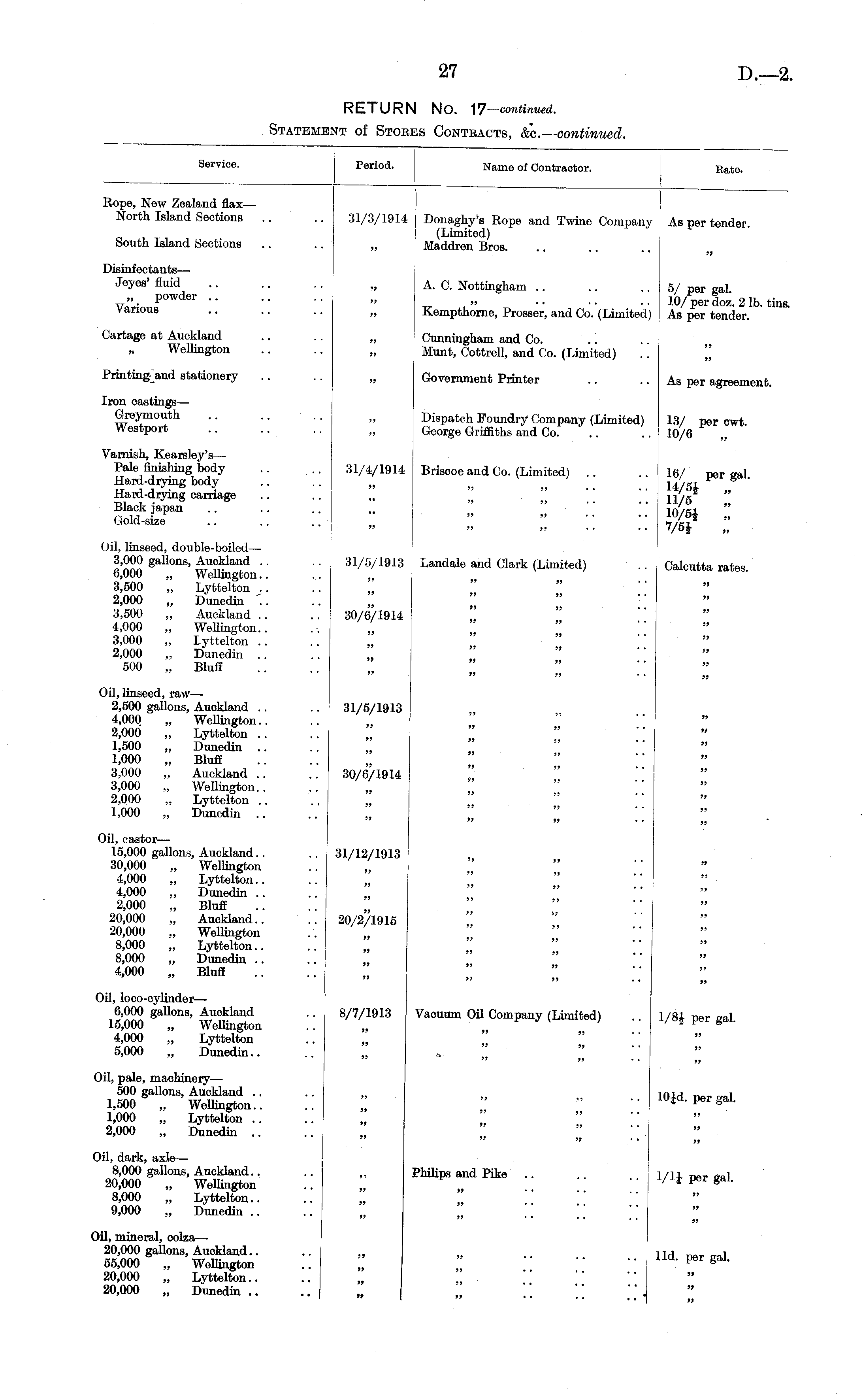Service. Period. Name of Contractor. Rate. Rope, New Zealand flax— North Island Sections South Island Sections 31/3/1914 )j j Donaghy's Rope and Twine Company (Limited) Maddren Bros. As per tender. jj Disinfectants— Jeyes' fluid „ powder Various A. C. Nottingham .. 5/ per gal. 10/ per doz. 2 lb. tins. Aβ per tender. Kempthorne, Prosser, and Co. (Limited) Cartage at Auckland ,, Wellington jj Cunningham and Co. Munt, Cottrell, and Co. (Limited) >> )) >y Printing and stationery Government Printer As per agreement. Iron castings— Greymouth Westport Dispatch Foundry Company (Limited) George Griffiths and Co. 13/ per owt. 10/6 Varnish, Kearsley's— Pale finishing body Hard-drying body Hard-drying carriage Black japan Gold-size 31/4/1914 Briscoe and Co. (Limited) .. 16/ per gal. 1V5J „ 11/5 10/6J „ 7/5J » » 5» ,, i> Oil, linseed, double-boiled— 3,000 gallons, Auckland .. 6,000 „ Wellington.. 3,500 „ Lyttelton .. 2,000 „ Dunedin '. 3,500 „ Auckland .. 4,000 „ Wellington.. 3,000 „ lyttelton .. 2,000 „ Dunedin . . 500 „ Bluff 31/5/1913 30/6/1914 Landale and Clark (Limited) >> ,, » „ Calcutta rates. » „ » » „ it ii >> >> • • Oil, linseed, raw— 2,500 gallons, Auckland .. 4,000 „ Wellington.. 2,000 „ Lyttelton .. 1,500 „ Dunedin .. 1,000 „ Bluff 3,000 „ Auckland .. 3,000 „ Wellington.. 2,000 „ Lyttelton .. 1,000 „ Dunedin .. >> jj is 31/5/1913 w J» it n j) 30/6/1914 " >> f> >> J» jj J» " ,, >j Oil, castor— 15,000 gallons, Auckland.. 30,000 „ Wellington 4,000 „ Lyttelton.. 4,000 „ Dunedin .. 2,000 „ Bluff 20,000 „ Auckland.. 20,000 „ Wellington 8,000 „ Lyttelton.. 8,000 „ Dunedin .. 4,000 „ Bluff >> l> » 31/12/1913 t> 9, »J ); 5> 20/2/1916 ;» :' >> 5) >> >> . . »J >i )J 9t Oil, loco-cylinder— 6,000 gallons, Auckland 15,000 „ Wellington 4,000 „ Lyttelton 5,000 „ Dunedin.. 8/7/1913 i> Vacuum Oil Company (Limited) 1/8| per gal. t> ft >> ,, .. Oil, pale, machinery— 500 gallons, Auckland .. 1,500 „ Wellington.. 1,000 „ Lyttelton .. 2,000 „ Dunedin .. it „ .. 10|d. per gal. JJ tt it " „ .. »> » j> .. Oil, dark, axle— 8,000 gallons, Auckland.. 20,000 „ Wellington 8,000 „ Lyttelton.. 9,000 „ Dunedin .. I Philips and Pike .. 1/lJ per gal. )} Oil, mineral, colza— 20,000 gallons, Auckland.. 55,000 „ Wellington 20,000 „ Lyttelton.. 20,000 „ Dunedin .. n lid. per gal. t> it if ft *t • • . . , . * a