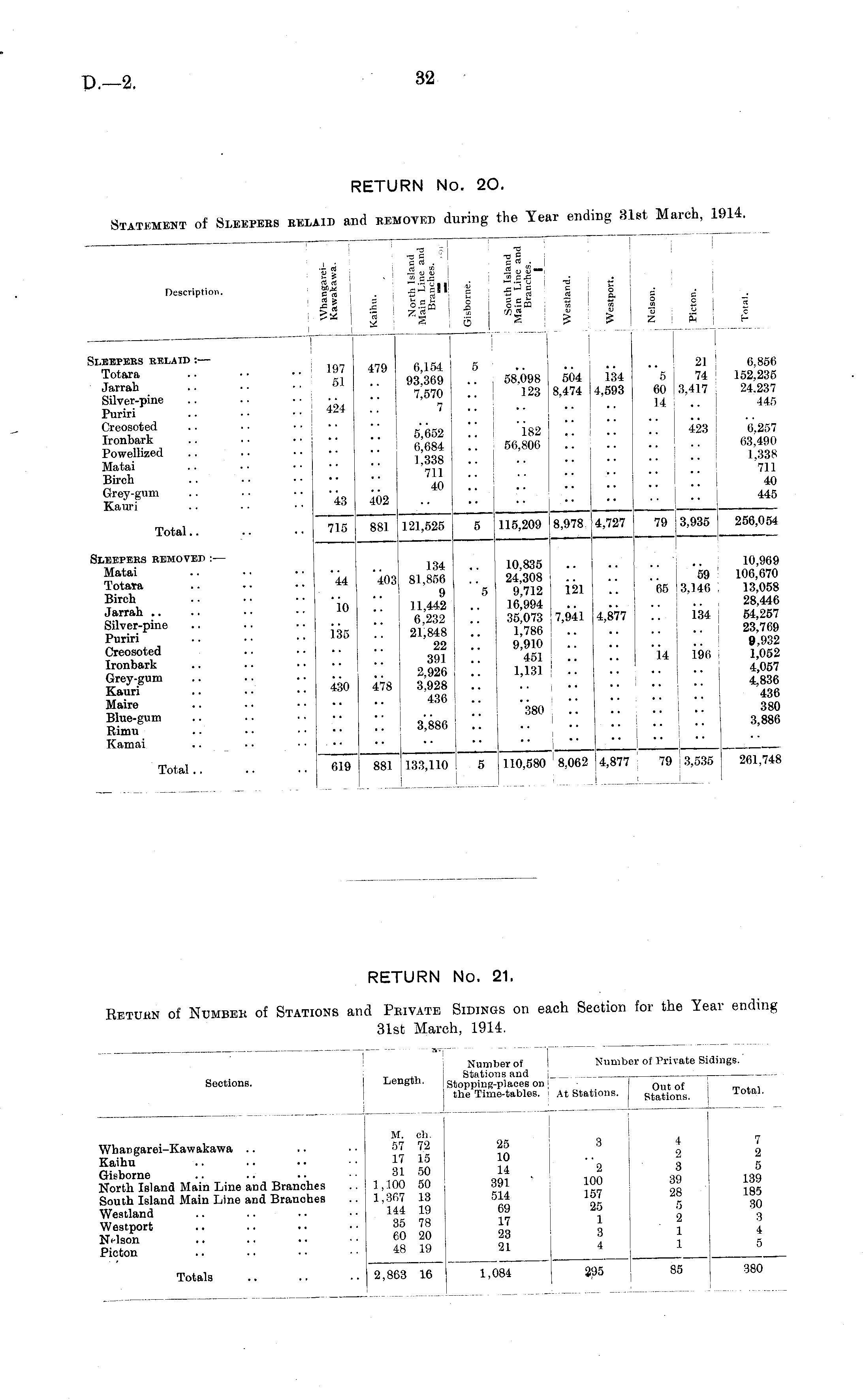RETURN No. 20. Statement of Sleepers relaid and removed during the Year ending 31st March, 1914.
