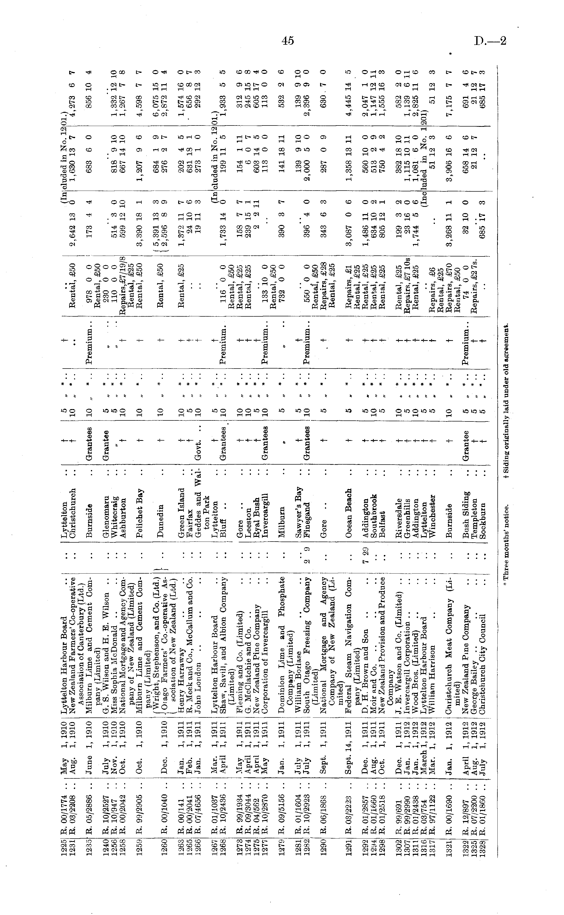 1231 UU/J. I l<± R. 03/2208 .. May 1, 1910 Aug. 1, 1910 Lyttelton Harbour Board .. [ New Zealand Farmers' Co-operative ! Association of Canterbury (Ltd.) Milburn Lime and Cement Company (Limited) G. S. Wilson and H. B. Wilson .. Miss Sopbia McDonald National Mortgage and Agency Company of New Zealand (Limited) Milburn Lime and Cement Company (Limited) [Wright, Stephenson, and Co. (Ltd.) 1 j Otago Farmers' Co.-operative As- ( soeiation of New Zealand (Ltd.) Henry Harraway R. Meek and Co., McCallum and Co. John London I - Lyttelton Christchurch t o „ .. 10 „ * .. Rentai, £50 In| 2,642 13 0 eluded in No. 12 1,630 13 7 4,273 6 7 1235 B. 05/2886 .. June 1, 1910 Burnside Grantees 10 „ Premium.. 978 0 0 i Rental, £50 230 0 0 110 0 0 Repairs,£7/19/8 Rental, £25 Rental, £50 173 4 4 683 6 0 856 10 4 1240 1256 1258 R. 10/2527 .. R. 10/947 .. R. 00/2042 .. July 1, 1910 Nov. 1, 1910 Oct. 1, 1910 Glenomaru Whiteeraig Ashburton Grantee "t 5 „ * .. 5 „ ' .. 10 „ * .. 514 3 0 599 12 10 818 9 10 667 14 10 1,332 12 10 1,267 7 8 t 1259 R. 99/2905 .. Oct. 1, 1910 Pelichet Bay t 10 „ * .. t 3,390 18 1 1,207 9 6 4,598 7 7 R. 00/1040 .. Dec. 1, 1910 Dunedin t 10 „ * .. t Rental, £50 j 5,391 13 3 I 2,596 8 9 684 1 9 276 2 7 6,075 15 0 2,872 11 4 1260 1263 1265 1266 R. 00/141 .. R. 00/2041 .. R. 07/4656 .. Jan. 1, 1911 Feb. 1, 1911 Jan. 1, 1911 Green Island Fairfax Geddes and Walton Park Lyttelton Blufi t t Govt. .. 10 . * .. 5 „ * .. 10 „ * .. t t Rental, £25 1,372 11 7 24 10 6 19 11 3 202 4 5 , 631 18 1 273 1 0 I 1,574 16 0 • 656 8 7 292 12 3 1267 1268 R. 01/1037 .. R. 10/2436 .. Mar. 1, 1911 April 1, 1911 Lyttelton Harbour Board Shaw, Savill, and Albion Company (Limited) Fleming and Co. (Limited) G. McClatchie and Co. .. New Zealand Pine Company Corporation of Invercargill t Grantees 5 „ * .. 10 „ * .. t Premium. 116 0 0 Rental, £50 Rental, £25 Rental, £25 (In 1,733 14 0 eluded in No. 12 199 11 5 01.) 1,933 5 5 1273 1274 1275 1277 R. 99/1934 .. R. 09/3044 .. R. 04/562 .. R. 10/2870 .. May 1, 1911 April 1, 1911 April 1, 1911 May 1, 1911 Gore Leeston Ryal Bush Inveroargill t t t Grantees 10 „ ' .. 10 „ 5 „ * .. 10 „ * .. t t t Premium.. 158 7 7 239 15 1 2 2 11 154 1 11 6 0 7 603 14 5 113 0 0 312 9 6 245 15 8 605 17 4 113 0 0 1279 133 10 0 Rental, £50 732 0 0 390 3 7 141 18 11 532 2 6 R. 09/5156 .. Jan. 1, 1911 Dominion Lime and Phosphate Company (Limited) William Borlase South Otago Freezing Company (Limited) National Mortgage and Agency Company of New Zealand (Limited) Federal Steam Navigation Company (Limited) D. H. Brown and Son Moir and Co. .. .. New Zealand Provision and Produce \ Company J. E. Watson and Co. (Limited) .. Invercargill Corporation .. Wood Bros. (Limited) Lyttelton Harbour Board William Harrison 2'"9 7 29 Milburn 5 „ * .. 1281 1282 R. 01/1604 .. R. 10/2923 .. July 1, 1911 July 1, 1911 Sawyer's Bay Finegand t Grantees 5 „ * .. 10 „ * .. t Premium.. 550 0 0 Rental, £50 Repairs, £28 Rental, £25 396"4 0 139 9 10 2,000 5 0 139 9 10 2,396 9 0 I 1290 R. 06/1868 .. Sept. 1, 1911 Gore t 5 „ * .. t 343 6 3 287 0 9 630 .7 0 1291 R. 03/22 2a .. Sept. 14, 1911 Ocean Beach 5 „ * .. t Repairs, £1 Rental, £25 Rental, £25 Rental, £25 Rental, £25 3,087 0 6 1,358 13 11 4,445 14 5 1292 1294 1298 R. 01/2857 .. R. 01/1660 .. R. 01/2518 .. Dec. 1, 1911 Aug. 1, 1911 Oct. 1, 1911 Addington South brook Belfast t t t 5 „ * .. 10 „ * .. 5 „ * .. t t t 1,486 11 0 634 10 2 805 12 1 560 10 0 513 2 9 750 4 2 2,047 1 0 1,147 12 11 1,555 16 3 1302 1307 1311 1316 1317 R. 99/691 .. R. 99/2990 .. R. 01/2438 .. R. 03/754 .. R. 97/1122 .. Dec. 1, 1911 Jan. 1, 1912 Jan. 1, 1912 March 1, 1912 Mar. 1, 1912 Riversdale Greenhills Addington Lyttelton Winchester t t t t t 10 „ •.. 5 „ ' .. 10 „ • .. 5 „ * .. 5 , *.. t t t t t Rental, £25 Repairs, £7 10s Rental, £25 199 3 2 23 16 0 1,744 5 6 (Inc 382 18 10 1,115 10 11 1,081 6 0 luded in No. 1 51 12 3 582 2 0 1,139 6 11 2,825 11 6 201) 1321 R. 00/1690 .. Jan. 1, 1912 Ghristchurch Meat Company (Limited) New Zealand Pine Company George Bailey Christchurch City Council Burnside t 10 „ * .. t Repairs, £6 Rental, £25 Repairs, £70 Rental, £50 74 0 0 Repairs, £2 7s. 3,268 11 1 3,906 16 6 51 12 3 7,175 7 7 1322 1325 1328 R. 12/897 .. R. 07/2200 .. R. 01/1860 .. April 1, 1912 Aug. 1, 1912 July 1, 1912 Bush Siding Templeton Sockburn Grantee t t 5 „ * .. 5 5 » * .. Premium.. t t 32 10 0 685 17 3 658 14 6 21 12 7 691 4 6 21 12 7 685 17 3 .. * Three months' notice. t Siding originally laid under old agreement.