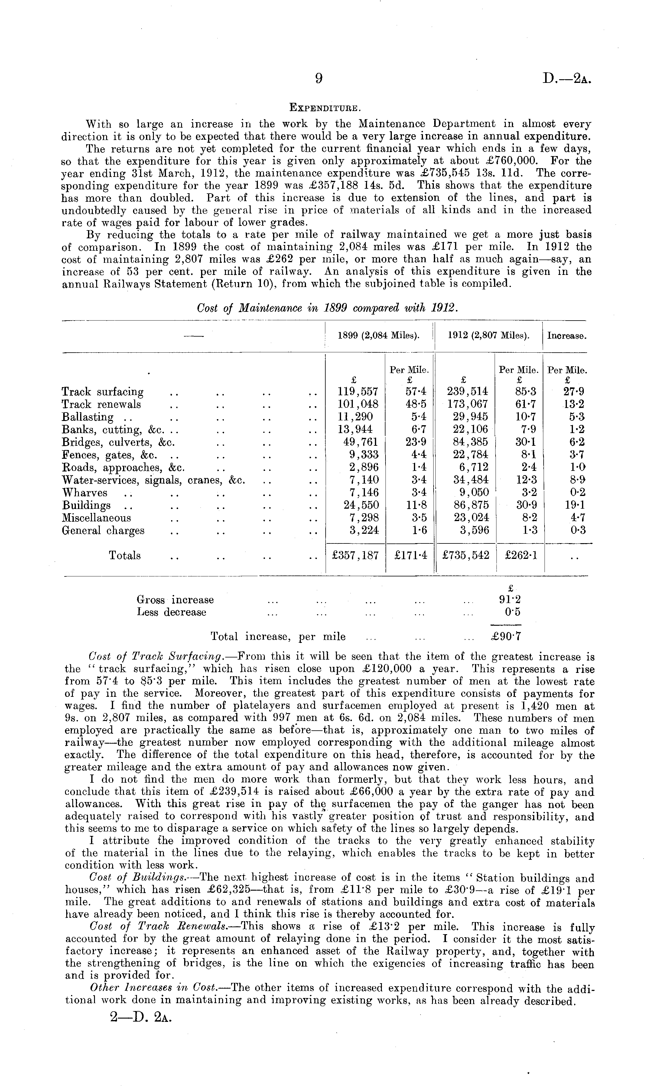 1899 (2,08Miles). 1912 (2,80' Miles). Increase. 'rack surfacing 'rack renewals iallasting tanks, cutting, &c. Jridges, culverts, &c. 'ences, gates, &c. toads, approaches, &c. signals, cranes, &c. Wharves Juildings liscellaneous reneral charges £ 119,557 101,048 11,290 13,944 49,761 9,333 2,896 7,140 7,146 24,550 7,298 3,224 Per Mile. £ 574 48-5 54 6-7 23-9 44 14 34 34 11-8 3-5 1-6 £ 239,514 173,067 29,945 22,106 84,385 22,784 6,712 34,484 9,050 86,875 23,024 3,596 Per Mile. £ 85-3 61-7 10-7 7-9 30-1 8-1 24 12-3 3-2 30-9 8-2 1-3 Per Mile. £ 27-9 13-2 5-3 1-2 6-2 3-7 1-0 8-9 0-2 19-1 4-7 0-3 Totals £357,187 £1714 £735,542 £262-1