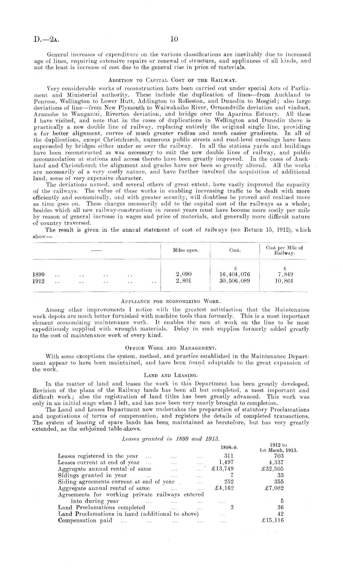 Appliance for economizing Work. Among other improvements I notice with the greatest satisfaction that the Maintenance work depots are much better furnished with machine tools than formerly. This is a most important ■element economizing maintenance work. It enables the men at work on the line to be most ■expeditiously supplied with wrought materials. Delay in such supplies formerly added greatly to the cost of maintenance work of every kind. Office Work and Management. With some exceptions the system, method, and practice established in the Maintenance Department appear to have been maintained, and have been found adaptable to the great expansion of the work. Land and Leasing. In the matter of land and leases the work in this Department has been greatly developed. Revision of the plans of the Railway lands has been all but completed, a most important and difficult work; also the registration of land titles has been greatly advanced. This work was only in an initial stage when I left, and has now been very nearly brought to completion. The Land and Leases Department now undertakes the preparation of statutory Proclamations and negotiations of terms of compensation, and registers the details of completed transactions. The system of leasing of spare lands has been maintained as heretofore, but has very greatly extended, as the subjoined table-shows. Leases granted in 1899 and 1913. 18q8 _q 1912 to ±e»8-y. lgt March> 1913 Leases registered in the year ... ... ... 311 703 Leases current at end of year ... ... ... 1,497 4,337 Aggregate annual rental of same ... ... £13,749 £32,505 Sidings granted in year ... ... ... 7 33 Siding agreements current at end of year . ... 252 355 Aggregate annual rental of same ... ... £4,162 £7,082 Agreements for working private railways entered into during year ... ... ... ... 5 Land Proclamations completed ... ... 3 36 Land Proclamations in hand (additional to above) ... 42 Compensation paid ... ... ... ... ... £15,116