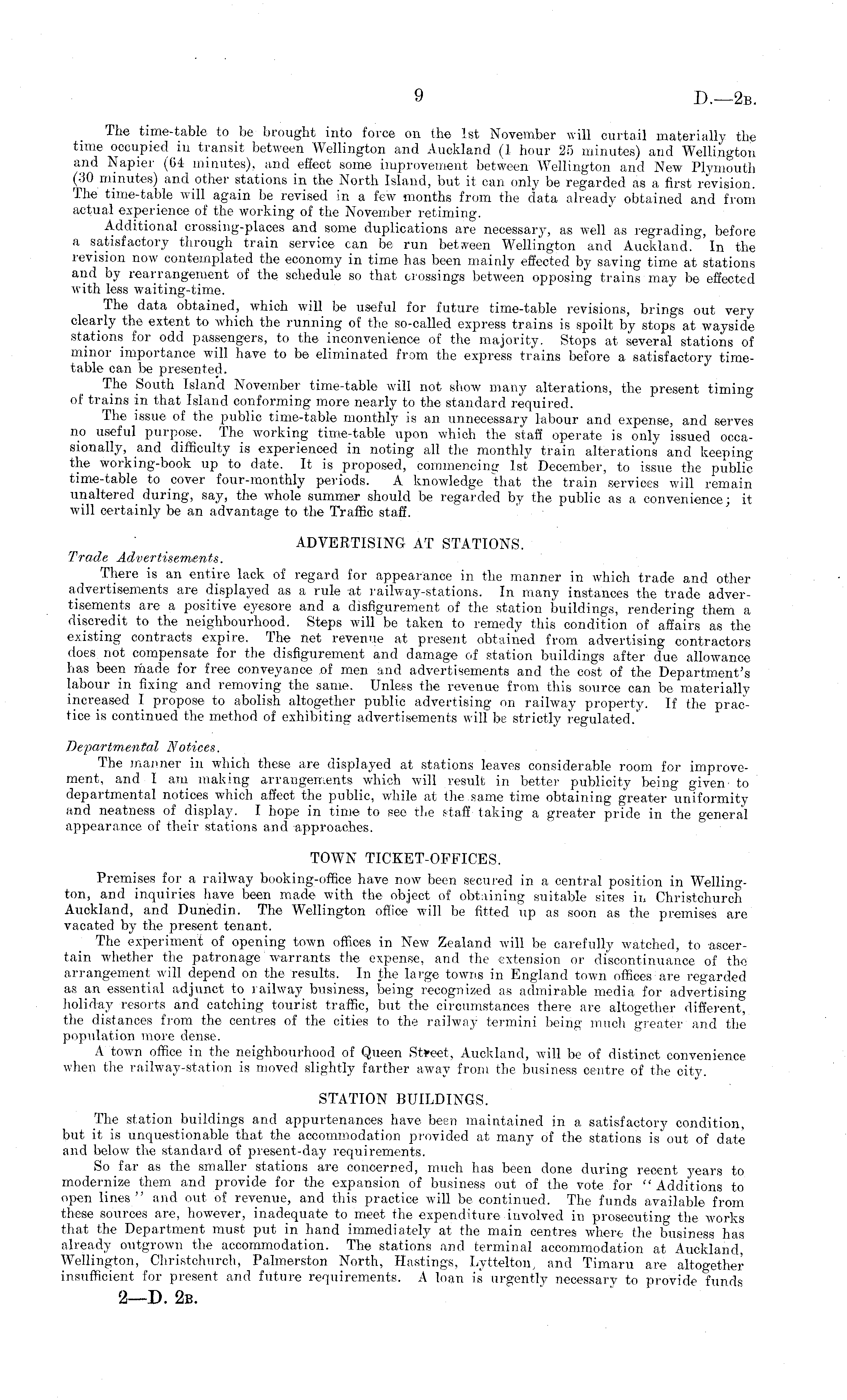 The time-table to be brought into force on ihe Ist November will curtail materially the time occupied in transit between Wellington and Auckland (1 hour 25 minutes) and Wellington and Napier (64 minutes), and effect some improvement between Wellington and New Plymouth (30 minutes) and other stations in the North Island, but it can only be regarded as a first revision. The time-table will again be revised in a few months from the data already obtained and from actual experience of the working of the November retiming. Additional crossing-places and some duplications are necessary, as well as regrading, before a satisfactory through train service can be run between Wellington and Auckland. In the revision now contemplated the economy in time has been mainly effected by saving time at stations and by rearrangement of the schedule so that crossings between opposing trains may be effected with less waiting-time. The data obtained, which will be useful for future time-table revisions, brings out very clearly the extent to which the running of the so-called express trains is spoilt by stops at wayside stations for odd passengers, to the inconvenience of the majority. Stops at several stations of minor importance will have to be eliminated from the express trains before a satisfactory timetable can be presented. The South Island November time-table will not show many alterations, the present timing of trains in that Island conforming more nearly to the standard required. The issue of the public time-table monthly is an unnecessary labour and expense, and serves no useful purpose. The working time-table "upon which the staff operate is only issued occasionally, and difficulty is experienced in noting all the monthly train alterations and keeping the working-book up to date. It is proposed, commencing Ist December, to issue the public time-table to cover four-monthly periods. A knowdedge that the train services will remain unaltered during, say, the whole summer should be regarded by the public as a convenience; it will certainly be an advantage to the Traffic staff. ADVERTISING AT STATIONS. Trade Advertisements. There is an entire lack of regard for appearance in the manner in which trade and other advertisements are displayed as a rule at railway-stations. In many instances the trade advertisements are a positive eyesore and a disfigurement of the station buildings, rendering them a discredit to the neighbourhood. Steps will be taken to remedy this condition of affairs as the existing contracts expire. The net revenue at present obtained from advertising contractors does not compensate for the disfigurement and damage of station buildings after due allowance has been made for free conveyance of men and advertisements and the cost of the Department's labour in fixing and removing the same. Unless the revenue from this source can be materially increased I propose to abolish altogether public advertising on railway property. If the practice is continued the method of exhibiting advertisements will be strictly regulated. Departmental Notices. The manner in which these arc displayed at stations leaves considerable room for improvement, and I am making arrangements which will result in better publicity being given to departmental notices which affect the public, while at the same time obtaining greater uniformity and neatness of display. I hope in time to sec the staff taking a greater pride in the general appearance of their stations and approaches. TOWN TICKET-OFFICES. Premises for a railway booking-office have now been secured in a central position in Wellington, and inquiries have been made with the object of obtaining suitable sites in Christchurch Auckland, and Dunedin. The Wellington office will be fitted up as soon as the premises are vacated by the present tenant. The experiment of opening town offices in New Zealand will be carefully watched, to ascertain whether the patronage warrants the expense, and the extension or discontinuance of the arrangement will depend on the results. In the large towns in England town offices are regarded as an essential adjunct to railway business, being recognized as admirable media for advertising holiday resorts and catching tourist traffic, but the circumstances there are altogether different, the distances from the centres of the cities to the railway termini being much greater and the population more dense. A town office in the neighbourhood of Queen Street, Auckland, will be of distinct convenience when the railway-station is moved slightly farther away from the business centre of the city. STATION BUILDINGS. The station buildings and appurtenances have been maintained in a satisfactory condition, but it is unquestionable that the accommodation provided at many of the stations is out of date and below the standard of present-day requirements. So far as the smaller stations are concerned, much has been done during recent years to modernize them and provide for the expansion of business out of the vote for " Additions to open lines" and out of revenue, and this practice will be continued. The funds available from these sources are, however, inadequate to meet the expenditure involved in prosecuting the works that the Department must put in hand immediately at the main centres where the business has already outgrown the accommodation. The stations and terminal accommodation at Auckland, Wellington, Christchurch, Palmerston North, Hastings, Lyttelton, and Timaru are altogether insufficient for present and future requirements. A loan is urgently necessary to provide funds