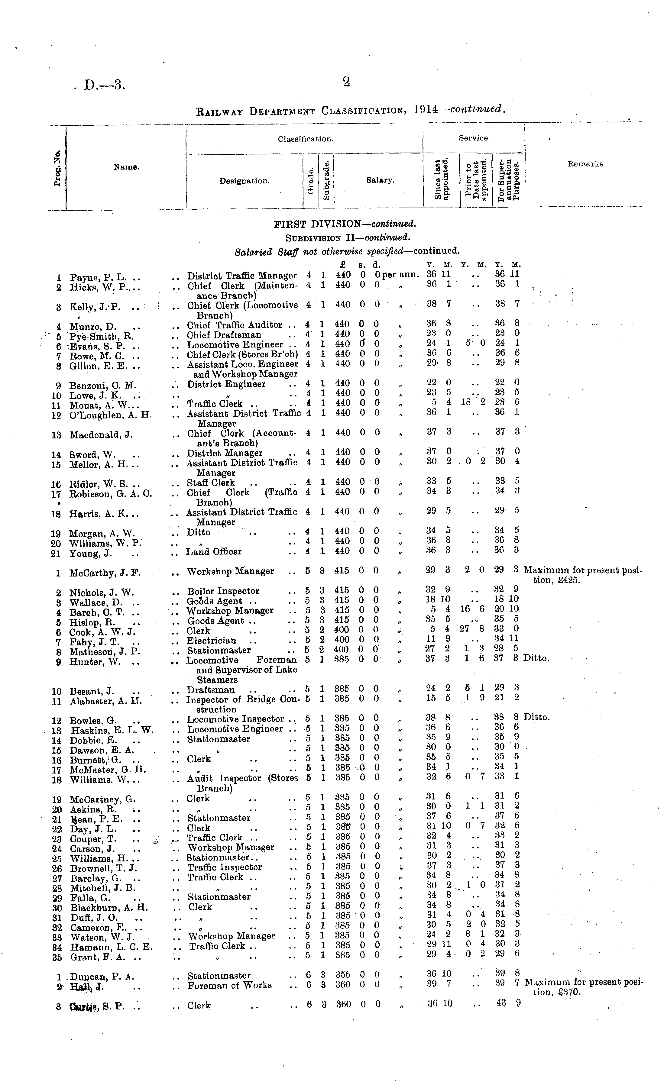 Classii fication. i Service. Classification. service. o S5 oj Name. g CM 6 i Name. _ _ I » I l| *ij Hi Bemarks Designation. 1 £. Salary. gg g «-g Soa Designation. FIRST DIVISION— continued. Subdivision II — continued. 1 Payne, P. L. .. 2 Hicks, W. P.... 3 Kelly, J. P. .. 4 Munro, D. 5 Pye-Smith, B. 6 Evans, S. P. 7 Rowe, M. C. 8 Gillon, E. E. 9 Benzoni, C. M. 10 Lowe, J. K. .. 11 Mouat, A. W... 12 O'Loughlen, A. H. 13 Macdonald, J. 14 Sword, W. 15 Mellor, A. H. .. 16 Ridler, W. S. .. 17 Robieson, G. A. C. * 18 Harris, A. K. .. 19 Morgan, A. W. 20 Williams, W. P. 21 Young, J. Salaried Staff not otherwise specified —continued. £ s. d. Y. m. Y. m. Y. M. .. District Traffio Manager 4 1 440 0 Operann. 36 11 .. 36 11 .. Chief Clerk (Mainten- 4 1 440 0 0 „ 36 1 .. 36 1 ance Branch) .. Chief Clerk (Locomotive 4 1 440 0 0 , 38 7 .. 38 7 Branch) .. Chief Traffic Auditor .. 4 1 440 0 0 „ 36 8 .. 36 8 .. Chief Draftsman .. 4 1 440 0 0 „ 23 0 .. 23 0 .. Locomotive Engineer .. 4 1 440 0 0 „ 24 1 5 0 24 1 .. Chief Clerk (Stores Br'ch) 4 1 440 0 0 , 36 6 .. 36 6 .. Assistant Loco. Engineer 4 1 440 0 0 „ 29-8 .. 29 8 and Workshop Manager .. Distriot Engineer .. 4 1 440 0 0 „ 22 0 .. 22 0 .. 4 1 440 0 0 „ 23 5 .. 23 5 .. Traffic Clerk .. .. 4 1 440 0 0 „ 5 4 18 2 23 6 .. Assietant Distriot Traffic 4 1 440 0 0 „ 36 1 36 1 Manager .. Chief Clerk (Account- 4 1 440 0 0 „ 37 3 37 3 ant's Branch) .. District Manager .. 4 1 440 0 0 . 37 0 .. 37 0 .. Assistant Distriot Traffio 4 1 440 0 0 „ 30 2 0 2 30 4 Manager Staff Clerk .. .. 4 1 440 0 0 „ 33 5 33 5 .. Chief Clerk (Traffio 4 1 440 0 0 „ 34 3 .. 34 3 Branch) .. Assistant District Traffic 4 1 440 0 0 „ 29 5 29 5 Manager Ditto .. .. 4 1 440 0 0 „ 34 5 .. 34 5 .. 4 1 440 0 0 „ 36 8 .. 36 8 Land Officer .. i 1 440 0 0 „ 36 3 .. 36 3 1 McCarthy, J. P. Workshop Manager .. 5 3 415 00 „ 29 3 20 29 3 Maximum for present position, £425. 2 Nichols, J. W. 3 Wallaoe, D. .. 4 Bargh, 0. T. .. 5 Hislop, R. 6 Cook, A. W. J. 7 Fahy, J. T. .. 8 Matheson, J. P. 9 Hunter, W. .. 10 Besant, J. 11 Alabaster, A. H. 12 Bowles, G. 13 Haskins, E. L. W. 14 Dobbie, E. 15 Dawson, E. A. 16 Burnett.'G. .. 17 MeMaster, G. H. 18 Williams, W. .. 19 MoCartney, G. 20 Aekins, R. 21 Rean, P. E. .. 22 Day, J. L. 23 Couper, T. .. , 24 Carson, J. 25 Williams, H. .. 26 Brownell, T. J. 27 Barclay, G. .. 28 Mitchell, J. B. 29 Palla, G. 30 Blackburn, A. H. 31 Duff, J. O. 32 Cameron, E. .. 33 Watson, W. J. 34 Hamann, L. C. E. 35 Grant, P. A. .. Boiler Inspector .. 5 3 415 0 0 „ 32 9 .. 32 9 Goods Agent .. .. 5 3 415 0 0 „ 18 10 .. 18 10 .. Workshop Manager .. 5 3 415 0 0 , 5 4 16 6 20 10 Goods Agent .. .. 5 3 415 0 0 „ 35 5 .. 35 5 Clerk .. .. 5 2 400 0 0 „ 5 4 27 8 33 0 Electrician .. .. 5 2 400 0 0 „ 11 9 .. 34 11 . Stationmaster .. 5 2 400 0 0 „ 27 2 1 3 28 5 .. Locomotive Foreman 5 1 385 0 0 „ 37 3 1 6 37 3 Ditto, and Supervisor of Lake Steamers Draftsman .. .. 5 1 385 0 0 . 24 2 5 1 29 3 .. Inspector of Bridge Con- 5 1 385 0 0 „ 15 5 1 9 21 2 struction .. Locomotive Inspector .. 5 1 385 0 0 „ 38 8 .. 38 8 Ditto. Locomotive Engineer .. 5 1 385 0 0 „ 36 6 .. 36 6 .. Stationmaster .. 5 1 385 0 0 „ 35 9 .. 35 9 .. 5 1 385 0 0 „ 30 0 .. 30 0 Clerk " .. .. 5 1 385 0 0 „ 35 5 .. 35 5 .. 5 1 385 0 0 „ 34 1 .. 34 1 .. Audit Inspector (Stores 5 1 385 0 0 „ 32 6 0 7 33 1 Branch) Clerk .. .. 5 1385 0 0 ,, 31 6 .. 31 6 .. 5 1 385 0 0 , 30 0 1 1 31 2 '.". St'ationmaster .. 5 1 385 0 0 „ 37 6 .. 37 6 Clerk .. .. 5 1 38S 0 0 „ 31 10 0 7 32 6 Traffic Clerk .. .. 5 1 385 0 0 : ' 32 4 .. 33 2 .. Workshop Manager .. 5 1 385 0 0 „ 313 .. 31 3 .. Stationmaster.. .. 5 1 385 0 0 „ 30 2 ... 30 2 .. Traffic Inspector .. 5 1 385 0 0 „ 37 3 .. 37 3 Traffio Clerk .. .. 5 1 385 0 0 „ 34 8 .. 34 8 .. 5 1 385 0 0 . 30 2 1 0 31 2 '.'. Stationmaster .. 5 1 385 0 0 „ 34 8 .. 34 8 Clerk .. .. 5 1 385 0 0 „ 34 8 .. 34 8 .. 5 1 385 0 0 , 31 4 0 4 31 8 ", .. ..5 1 385 0 0 „ 30 5 2 0 32 5 '.' Workshop Manager .. 5 1 385 0 0 „ 24 2 8 1 32 3 Traffic Clerk .. .. 5 1 385 0 0 „ 29 11 0 4 30 3 . 5 1 385 0 0 „ 29 4 0 2 29 6 1 Duncan, P. A. 2 Hail, J. .. Stationmaster .. 6 3 355 0 0 „ 36 10 .. 39 8 Foreman of Works .. 6 3 360 0 0 „ 39 7 .. 39 7 Maximum for present posi lion, £370. 3 Ourtis, S. P. .', .. Clerk ,. .. 6 3 360 0 0 3G 10 ,, 43 9