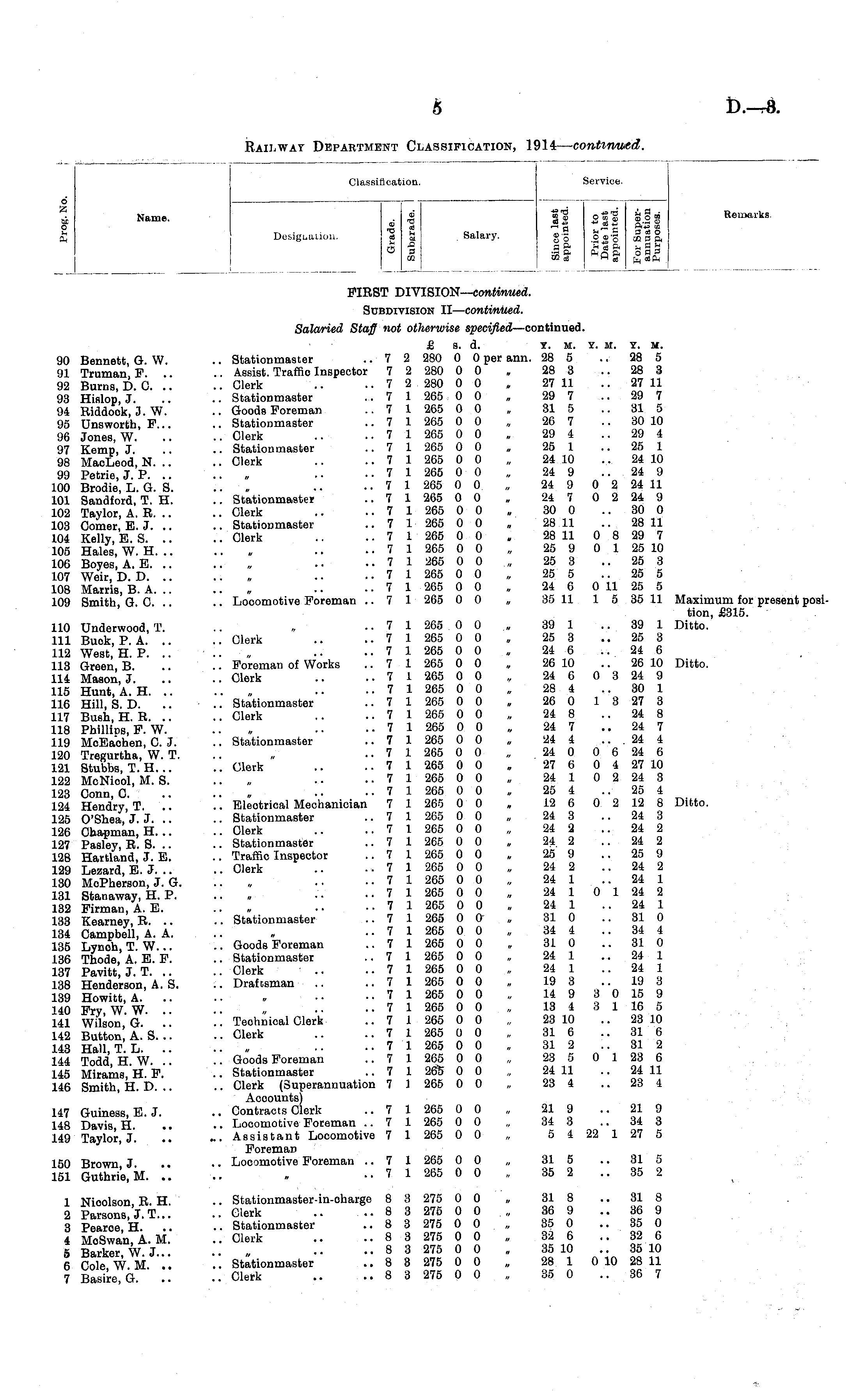 Classification. Service. % Name. 6 | l≤ S11 ||| Be ™ rks ' £ Desigbation. as %_ Salary. g-g o ©•§ 3 a 5 1 II sal in f FIRST DIVISION— continued. Subdivision II— continued. Salaried Staff not otherwise specified —continued. £ s. d. Y. M. Y. M. Y. M. 90 Bennett, G. W. .. Stationmaster .. 7 2 280 0 0 per ann. 28 5 .. 28 5 91 Truman F. .. .. Assist. Traffio Inspector 7 2 280 0 0 , 28 3 .. 28 3 92 Burns, D. 0 Clerk .. .. 7 2 280 0 0 , 27 11 .. 27 11 93 Hifllop, J. .. .. Stationmaster .. 7 1 265 0 0 „ 29 7 .. 29 7 94 Biddook, 3. W. .. Goods Foreman .. 7 1 265 0 0 „ 31 5 .. 31 5 95 Unsworth, F Stationmaster .. 7 1 265 0 0 „ 26 7 .. 30 10 96 Jones, W Clerk .. .. 7 1 265 0 0 „ 29 4 .. 29 4 97 Kemp, J. .. .. Stationmaster .. 7 1 265 0 0 , 25 1 .. 25 1 98 MaoLeod, N Clerk .. .. 7 1 265 0 0 „ 24 10 .. 24 10 99 Petrie, J. P , .. .. 7 1 265 0 0 „ 24 9 .. 24 9 L00 Brodie, L. G. S. .. . .. .. 7 1 265 0 0 , 24 9 0 2 24 11 L01 Sandford, T. H. .. Stationmaster .. 7 1 265 0 0 „ 24 7 0 2 24 9 L02 Taylor, A. R Clerk .. .. 7 1 265 0 0 , 30 0 .. 30 0 L03 Comer, E. J. .. .. Stationmaster .. 7 1 265 0 0 „ 28 11 .. 28 11 104 Kelly, E. S Clerk .. .. 7 1 265 0 0 . 28 11 0 8 29 7 L05 Hales, W. H . .. .. 7 1 265 0 0 „ 25 9 0 1 25 10 L06 Boyes.A. E , .. .. 7 1 265 0 0 „ 25 3 .. 25 3 L07 Weir, D. D , .. .. 7 1 265 0 0 . 25 5 .. 25 5 L08 Harris, B. A „ .. .. 7 1 265 0 0 „ 24 6 0 11 25 5 L09 Smith G C .. Locomotive Foreman ..71 265 00 „ 35 11 1 5 35 11 Maximum for present posi tion, £315. L10 Underwood,! 1 . .. „ .. 7 1 265 0 0 , 39 1 .. 39 1 Ditto. Lll Buck, P. A Clerk .. .. 7 1 265 0 0 „ 25 3 .. 25 3 112 West H. P „ .. .. 7 1 265 0 0 „ 24 6 ... 24 6 L13 Green B .. .. Foreman of Works .. 7 1 265 0 0 „ 26 10 .. 26 10 Ditto. L14 Mason, J Clerk .. .. 7 1 265 0 0 „ 24 6 0 3 24 9 115 Hunt, A. H . .. .. 7 1 265 0 0 . 28 4 .. 30 1 116 Hill, S. D. .. .. Stationmaster .. 7 1 265 0 0 „ 26 0 1 3 27 3 L17 Bush, H. R Clerk .. .. 7 1 265 0 0 „ 24 8 .. 24 8 118 Phillips, F. W. .. . ■• ..7 1 265 0 0 „ 24 7 .. 24 7 L19 MoEaohen, C. J. .. Stationmaster .. 7 1 265 0 0 „ 24 4 .. 24 4 [20 Tregurtha, W. T. .. . .. 7 1 265 0 0 „ 24 0 0 6 24 6 121 Stubbs, T.H Clerk .. .. 7 1 265 0 0 . 27 6 0 4 27 10 L22 MoNiool.M. S. .. . ... .. 7 1 265 0 0 . 24 1 0 2 24 3 123 Conn, C ■• .. 7 1 265 0 0 . 25 4 .. 25 4 L24 Hendry T. .. .. Electrical Mechanician 7 1 265 0 0 „ 12 6 0 2 12 8 Ditto. 125 O'Shea, J. J. .. .. Stationmaster .. 7 1 265 0 0 „ 24 3 .. 24 3 126 Chapman, H Clerk .. .. 7 1 265 0 0 „ 24 2 .. 24 2 L27 Pasley, R. S Stationmaster .. 7 1 265 0 0 „ 24 2 .. 24 2 L28 Hartland, J. E. .. Traffic Inspector .. 7 1 265 0 0 , 25 9 .. 25 9 129 Lezard, E.J Clerk .. .. 7 1 265 0 0 „ 24 2 .. 24 2 L30 McPherson, J. G. .. . •• ..7 1 265 0 0 „ 24 1 .. 24 1 181 Stanaway, H. P. .. . .. .. 7 1 265 0 0 „ 24 1 0 1 24 2 132 Firman, A. E. .. . •• .. 7 1 265 0 0 „ 24 1 .. 24 1 L33 Kearney, R. .. .. Stationmaster .. 7 1 265 0 0 „ 31 0 .. 31 0 L34 Campbell, A. A. .. . .. 7 1 265 0 0 „ 34 4 .. 34 4 L35 Lynch T. W. .. .. Goods Foreman .. 7 1 265 0 0 „ 31 0 .. 31 0 136 Thode A E. F. .. Stationmaster .. 7 1 265 0 0 . 24 1 .. 24 1 137 Pavitt, J. T Clerk .. .. 7 1 265 0 0 „ 24 1 .. 24 1 i£ l: n wt r T A - s - - Drah8man :: :: ? 1 £S 8 8 : II I 3-0 8 I 140 Frv w' W " " „ • • .. 7 1 265 0 0 „ 13 4 3 1 16 5 141 Wilson 'g.' .. •• Teohnical Clerk .. 7 1 265 0 0 „ 23 10 .. 23 10 L42 Button A. S Clerk .. .. 7 1 265 0 0 . 31 6 .. 31 6 143 Hall T L .. . ■ • .. 7 1 265 0 0 , 31 2 31 2 144 Todd H W. .. Goods Foreman .. 7 1 265 0 0 „ 23 5 0 1 23 6 L45 Mirams.H. F. .. Stationmaster .. 7 1 265 0 0 „ 24 11 .. 24 11 146 Smith, H. D. .. .. Clerk (Superannuation 7 ] 265 0 0 . 23 4 .. 23 4 Acoounts) 147 Guiness, E. J. .. Contracts Clerk .. 7 1 265 0 0 „ 21 9 .. 21 9 [48 Davis H .. .. Locomotive Foreman ..71 265 00 „ 34 3 34 3 L49 Taylor, J. .. -. Assistant Locomotive 7 1 265 0 0 5 4 22 1 27 5 Foreman 150 Brown J .. Locomotive Foreman .. 7 1 265 0 0 „ 31 5 31 5 151 Guthri'e.M . • ■ 7 1 265 0 0,, 35 2 .. 35 2 1 Nicolson. R. H. .. Stationmaster-in-oharge 8 3 275 0 0 „ 31 8 31 8 3 Parsons.J.T Clerk .. ..8 3 275 0 0,, 36 9 .. 36 9 3 Pearoe H .. .. Stationmaster .. 8 3 275 0 0 „ 35 0 .. 35 0 4 McSwa'n.A.M. .. Clerk .. ..8 3 275 0 0,, 32 6 .. 32 6 5 Barker W J .. „ •• ..8 3 275 0 0 „ 35 10 .. 35 10 6 Cole W M ". .. Stationmaster .. 8 3 275 0 0 „ 28 1 0 10 28 11 7 Basire.G Clerk .. ..8 3 275 0 0,, 35 0 .. 36 7