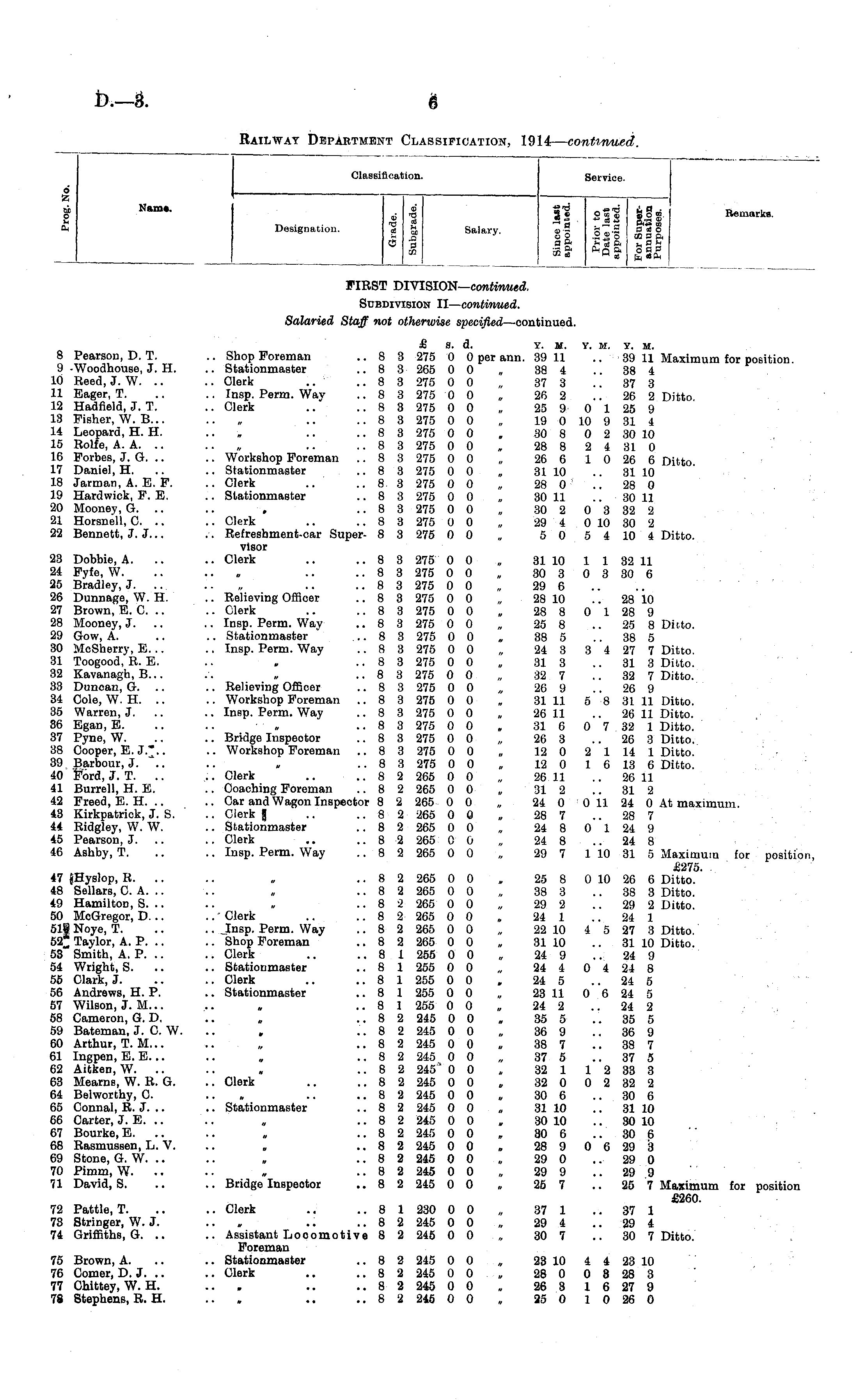 Classii leal :ion. Seryice. 6 i Nam*. Designation. 2 & Salary. || S|| |J| Remarks. cfl o FIRST DIVISION— continued. Subdivision II— continued. Salaried Staff not otherwise specified —continued. 8 Pearson, D. T. 9 -Woodhouse, J. H. LO Reed, J. W. 11 Eager, T. L2 Hadfield, J. T. -3 Fisher, W. B... ■i Leopard, H. H. L5 Rolfe, A. A. .. 16 Forbes, J. G. .. .7 Daniel, H. 18 Jarman, A. E. F. .9 Hardwiok, F. E. !0 Mooney, G. .. 11 Horsnell, G. .. !2 Bennett, J.J... !3 Dobbie, A. .. !4 Fyfe, W. 15 Bradley, J. !6 Dunnage, W. H. !7 Brown, E. C. .. !8 Mooney, J. !9 Gow, A. 10 MoSherry, E... !1 Toogood, R. E. 12 Kavanagh, B... 53 Duncan, G. .. 54 Cole, W. H. .. !5 Warren, J. 16 Egan, E. 17 Pyne, W. !8 Oooper, E. J.".. !9 Barbour, J. .. 10 Ford, J. T. .. 11 Burrell, H. E. 12 Freed, E. H. .. 13 Kirkpatriok, J. S. 14 Ridgley, W. W. 15 Pearson, J. 16 Ashby, T. [7 JHyslop, R. .. [8 Sellars, C. A. .. 19 Hamilton, S. .. 10 McGregor, D... ill Noye, T. S2J Taylor, A. P. .. S3 Smith, A. P. .. >4 Wright, S. .. 15 Clark, J. 16 Andrews, H. P. 17 Wilson, J. M... 18 Cameron, G. D. >9 Bateman, J. C. W. SO Arthur, T. M... 11 Ingpen, E. E... 52 Aitken, W. .. 53 Mearne, W. R. G. 54 Belworthy, C. 55 Connal, R. J. .. 56 Carter, J. E. .. >7 Bourke, E. >8 Rasmussen, L. V. S9 Stone, G. W. .. ro Pimm, W. II Davia, S. £ s. d. y. m. y. m. y. m. .. Shop Foreman .. 8 3 275 0 0 per ann. 39 11 .. 39 11 Maximum for position .. Stationmaster .. 8 3 265 0 0 „ 38 4 .. 38 4 • • Clerk .. .. 8 3 275 0 0 „ 37 3 .. 37 3 .. Insp. Perm. Way .. 8 3 275 0 0 „ 26 2 .. 26 2 Ditto. .. Clerk .. .. 8 3 275 0 0 „ 25 9 0 1 25 9 .. 8 3 275 0 0 „ 19 0 10 9 31 4 .. 8 3 275 0 0 „ 30 8 0 2 30 10 .. 8 3 275 0 0 „ 28 8 2 4 31 0 .. Workshop Foreman ..83 275 00 „ 26 6 1 0 26 6 Ditto .. Stationmaster ..83 275 00 „ 31 10 .. 31 10 .. Clerk .. .. 8 3 275 0 0 „ 28 0 .. 28 0 .. Stationmaster .. 8 3 275 0 0 „ 30 11 .. 30 11 .. 8 3 275 0 0 30 2 0 3 32 2 .. Clerk .. .. 8 3 275 0 0 „ 29 4 0 10 30 2 .. Refreshment-car Super- 8 3 275 0 0 „ 5 0 5 4 10 4 Ditto. visor .. Clerk .. .. 8 3 275 0 0 „ 31 10 1 1 32 11 .. 8 3 275 0 0 „ 30 3 0 3 30 6 .. 8 3 275 0 0 „ 29 6 .. Relieving Officer .. 8 3 275 0 0 „ 28 10 .. 28 10 .. Clerk .. .. 8 3 275 0 0 „ 28 8 0 1 28 9 .. Insp. Perm. Way .. 8 3 275 0 0 „ 25 8 .. 25 8 Ditto. .. Stationmaster .. 8 3 275 0 0 „ 38 5 .. 38 5 .. Insp. Perm. Way ..83 275 00 „ 24 3 3 4 27 7 Ditto. .. 8 3 275 0 0 „ 31 3 31 3 Ditto. .. 8 3 275 0 0 32 7 .. 32 7 Ditto. .. Relieving Officer .. 8 3 275 0 0 „ 26 9 .. 26 9 .. Workshop Foreman .. 8 3 275 0 0 „ 31 11 5 8 31 11 Ditto. .. Insp. Perm. Way .. 8 3 275 0 0 „ 26 11 .. 26 11 Ditto. •• . .. 8 3 275 0 0 , 31 6 0 7 32 1 Ditto. .. Bridge Inspeotor .. 8 3 275 0 0 „ 26 3 .. 26 3 Ditto. .. Workshop Foreman .. 8 3 275 0 0 „ 12 0 2 114 1 Ditto. .. 8 3 275 0 0 12 0 1 6 13 6 Ditto. .. Clerk .. .. 8 2 265 0 0 „ 26 11 .. 26 11 .. Coaching Foreman ..82 265 00 „ 31 2 31 2 .. Car and Wagon Inspector 8 2 265 0 0 „ 24 0 0 11 24 0 At maximum. .. Clerk g .. .. 8 2 265 0 0 28 7 .. 28 7 .. Stationmaster .. 8 2 265 0 0 „ 24 8 0 1 24 9 .. Clerk .. .. 8 2 265 0 0 „ 24 8 .. 24 8 .. Insp. Perm. Way .. 8 2 265 0 0 „ 29 7 1 10 31 5 Maximum for position, £275. .. 8 2 265 0 0 „ 25 8 0 10 26 6 Ditto. .. 8 2 265 0 0 „ 38 3 38 3 Ditto. .. 8 2 265 0 0 „ 29 2 29 2 Ditto. .. Clerk .. .. 8 2 265 0 0 „ 24 1 .. 24 1 .. Insp. Perm. Way .. 8 2 265 0 0 „ 22 10 4 5 27 8 Ditto. .. Shop Foreman .. 8 2 265 0 0 „ 31 10 .. 31 10 Ditto. .. Clerk .. .. 8 1 255 0 0 „ 24 9 .. 24 9 .. Stationmaster .. 8 1 255 0 0 „ 24 4 0 4 24 8 .. Clerk .. .. 8 1 255 0 0 . 24 5 .. 24 5 .. Stationmaster .. 8 1 255 0 0 „ 23 11 0 6 24 5 .. 8 1 255 0 0 „ 24 2 .. 24 2 .. 8 2 245 0 0 „ 35 5 35 5 .. 8 2 245 0 0 „ 36 9 36 9 .. 8 2 245 0 0 „ 38 7 .. 38 7 .. 8 2 245 0 0 „ 37 5 37 5 ..8 2 245' 0 0 „ 32 1 1 2 33 3 .. Clerk .. .. 8 2 245 0 0 „ 32 0 0 2 32 2 .. 8 2 245 0 0 „ 30 6 30 6 .. Stationmaster .. 8 2 245 0 0 „ 31 10 .. 31 10 .. 8 2 245 0 0 , 30 10 .. 30 10 .. 8 2 245 0 0 » 30 6 30 6 .. 8 2 245 0 0 28 9 0 6 29 3 .. 8 2 245 0 0 „ 29 0 .. 29 0 .. 8 2 245 0 0 „ 29 9 .. 29 9 .. Bridge Inspeotor .. 8 2 245 0 0 „ 25 7 .. 25 7 Maximum for position £260. 12 Pattle, T. 13 Stringer, W. J. r4 Griffiths, G. .. IB Brown, A. 16 Comer, D.J. .. H Chittey, W. H. IS Stephens, R. H. .. Clerk .. .. 8 1 230 0 0 „ 37 1 .. 37 1 ... .. .. 8 2 245 0 0 „ 29 4 29 4 .. Assistant Ijooomotive 8 2 245 0 0 „ 30 7 30 7 Ditto. Foreman .. Stationmaster .. 8 2 245 0 0 „ 23 10 4 4 23 10 .. Clerk .. .. 8 2 245 0 0 „ 28 0 0 8 28 3 .. 8 2 245 0 0 „ 26 3 1 6 27 9 .. 8 2 245 0 0 „ 25 0 1 0 26 0