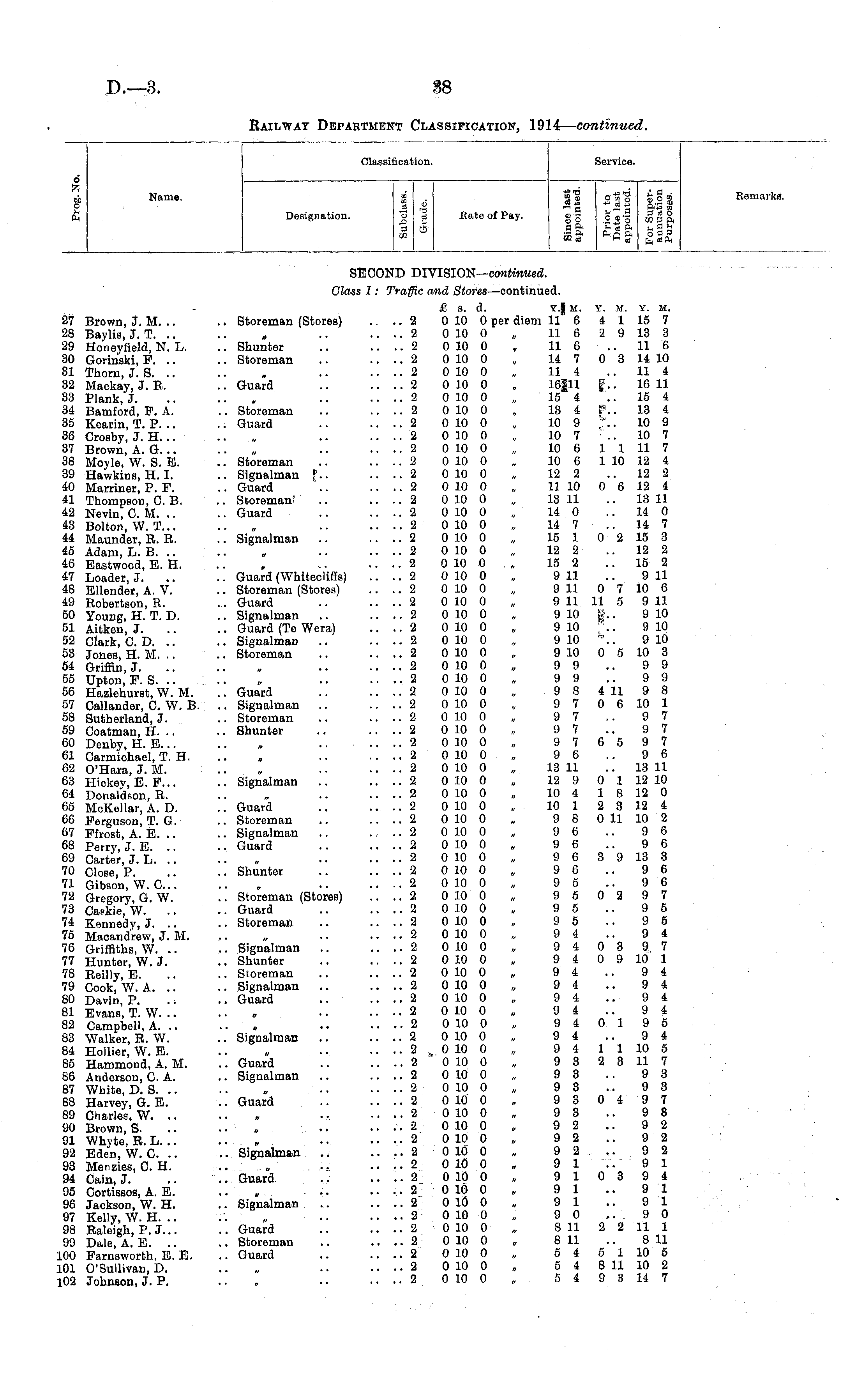 Classification. Service. Name. Designation. 3 4 5 0 Bate ot Pay. II 211 So ls| as , *p& 3 * Q ma at u a n Sas Eetnarki SECOND DIVISION— continued. Glass I: Traffic and Stores — oontinued. 27 Brown, J. M. .. 28 Baylis, J. T. .. 29 Honeyfield, N. L. 30 Gorinaki, F. .. 81 Thorn, J. S. 32 Mackay, J. E. 33 Plank, J. 34 Bamford, F. A. 35 Kearin, T. P. .. 36 Crosby, J. H... 37 Brown, A. G... 38 Moyle, W. S. B. 39 Hawkins, H. I. 40 Marriner, P. F. 41 Thompson, 0. B. 42 Nevin, 0. M. 43 Bolton, W. T... 44 Maunder, R. R. 45 Adam, L. B. 46 Eastwood, E. H. 47 Loader, J. 48 Ellender, A. V. 49 Robertson, K. 50 Young, H. T. D. 51 Aitken, J. 52 Clark, 0. D. 53 Jones, H. M. .. 54 Griffin, J. 55 Upton, F. S. .. 56 Hazlehurst, W. M. 57 Callander, C. W. B. 58 Sutherland, J. 59 Coatman, H. .. 60 Denby, H. E... 61 Carmichael, T. H. 62 O'Hara, J. M. 63 Hickey, E. F... 64 Donaldson, R. 65 MoKellar, A. D. 66 Ferguson, T. G. 67 Ffrost, A. E. .. 68 Perry, J. E. 69 Carter, J. L. 70 Close, P. 71 Gibson, W. C... 72 Gregory, G. W. 73 Caskie, W. .. 74 Kennedy, J. .. 75 Maoandrew, J. M. 76 Griffiths, W. .. 77 Hunter, W. J. 78 Reilly, E. 79 Cook, W. A. 80 Davin, P. 81 Evans, T. W. .. 82 Campbell, A. .. 83 Walker, R. W. 84 Hollier, W. E. 85 Hammond, A. M. 86 Anderson, C. A. 87 White, D. S. 88 Harvey, G. E. 89 Charles, W. .. 90 Brown, S. 91 Whyte, R. L. .. 92 Eden, W. C. .. 93 Menzies, C. H. 94 Cain, J. 95 Cortissos, A. E. 96 Jackson, W. H. 97 Kelly, W. H. .. 98 Raleigh, P.J... 99 Dale, A. E. LOO Farnsworth, E. E. L01 O'Sullivan, D. L02 Johnson, J. P. £ s. d. Y.j II. y. m. Y. m. .. Storeman (Stores) .. .. 2 0 10 0 per diem 116 4 1 15 7 „ .. .... 2 0 10 0 „ 11 6 2 9 13 3 .. Shunter .. .... 2 0 10 0 , 11 6 .. 11 6 .. Storeman .. .... 2 0 10 0 „ 14 7 0 3 14 10 .... 2 0 10 0 „ 11 4 11 4 .. Guard 2 0 10 0 „ 16111 |.. 16 11 .... 2 0 10 0 „ 15 4 .. 15 4 .. Storeman .. .... 2 0 10 0 „ 13 4 P.. 13 4 .. Guard .. .... 2 0 10 0 „ 10 9 \. 10 9 .... 2 0 10 0 „ 10 7 .. 10 7 .... 2 0 10 0 „ 10 6 1 1 11 7 .. Storeman .. .... 2 0 10 0 „ 10 6 1 10 12 4 .. Signalman f.. .... 2 0 10 0 „ 12 2 .. 12 2 .. Guard .. .... 2 0 10 0 „ 11 10 0 6 12 4 .. .. .... 2 0 10 0 „ 13 11 .. 13 11 .. Guard .. .... 2 0 10 0 „ 14 0 .. 14 0 .... 2 0 10 0 „ 14 7 .. 14 7 .. Signalman .. .... 2 0 10 0 „ 15 1 0 2 15 3 .... 2 0 10 0 „ 12 2 12 2 .... 2 0 10 0 15 2 .. 15 2 .. Guard (Whitecliffs) .... 2 0 10 0 , 911 .. 911 .. Storeman (Stores) .... 2 0 10 0 „ 9 11 0 7 10 6 .. Guard .. .... 2 0 10 0 „ 9 11 11 5 9 11 .. Signalman 2 0 10 0 . 9 10 g.. 9 10 .. Guard (Te Wera) .. ..2 0 10 0 , 9 10 " 9 10 .. Signalman .. .... 2 0 10 0 „ 9 10 "".. 9 10 .. Storeman .. .... 2 0 10 0 „ 9 10 0 5 10 3 .... 2 0 10 0 „ 9 9 .. 9 9 .... 2 0 10 0 „ 9 9 .. 9 9 .. Guard .. .... 2 0 10 0 „ 9 8 4 11 9 8 .. Signalman .. .... 2 0 10 0 „ 9 7 0 6 10 1 .. Storeman .. .... 2 0 10 0 „ 9 7 .. 9 7 .. Shunter .. .... 2 0 10 0 „ 9 7 .. 9 7 ....2 0100 „ 976597 ....2 0100 . 96 .. 96 .... 2 0 10 0 „ 13 11 .. 13 11 .. Signalman .. .... 2 0 10 0 . 12 9 0 1 12 10 .... 2 0 10 0 , 10 4 1 8 12 0 .. Guard .. .... 2 0 10 0 . 10 1 2 3 12 4 .. Storeman .. .... 2 0 10 0 . 9 8 0 11 10 2 .. Signalman .. .... 2 0 10 0 . 9 6 .. 9 6 .. Guard .. ....2 0100 , 96 .. 96 .... 2 0 10 0 , 9 6 3 9 13 3 .. Shunter .. .... 2 0 10 0 „ 96 .. 96 .... 2 0 10 0 . 95 .. 96 .. Storeman (Stores) ....2 0100 „ 95 02 97 .. Guard .. .... 2 0 10 0 „ 95 .. 95 .. Storeman .. .... 2 0 10 0 „ 95 .. 96 .... 2 0 10 0 „ 94 .. 94 .. Signalman .. ....2 0 10 0 , 94 03 97 .. Shunter .. .... 2 0 10 0 . 9 4 0 9 10 1 .. Storeman .. .... 2 0 10 0 „ 94 .. 94 .. Signalman .. ....2 0 10 0 „ 94 .. 94 .. Guard .. .... 2 0 10 0 „ 9 4 .. 9 4 .... 2 0 10 0 „ 94 .. 94 ....2 0 10 0 , 940195 .. Signalman .. ....2 0100 . 94 .. 94 .... 2 0 10 0 „ 9 4 1 1 10 5 .. Guard .. .... 2 " 0 10 0 , 9 3 2 3 11 7 .. Signalman .. .... 2 0 10 0 „ 9 3 .. 9 3 .... 2 0 10 0 „ 93 ... 93 .. Guard .. .... 2 0 10 0 . 9 3 0 4 9 7 .... 2 0 10 0 . 93 .. 98 ..„ .. .... 2 0 10 0 „ 92 .. 92 .... 2 0 10 0 „ 9 2 .. 9 2 .. Signalman .. .... 2 0 10 0 „ 92.. 92 .... 2 0 10 0 „ 9 1 .. 9 1 .. Guard .. .... 2 0 10 0 . 9 10 3 9 4 .."'., .. .... 2 0 10 0 „ 9 1 .. 9 1 .. Signalman .. .... 2 0 10 0 . 91 .. 91 .... 2 0 10 0 „ 9 0 ..9 0 Guard .. .... 2 0 10 0 „ 8 11 22111 .. Storeman .. .... 2 0 10 0 „ 8 11 .. 8 11 Guard .. .... 2 0 10 0 „ 5 4 5 1 10 5 .... 2 0 10 0 „ 54 8 11 10 2 " " .. 2 0 10 0 5 4 9 3 14 7