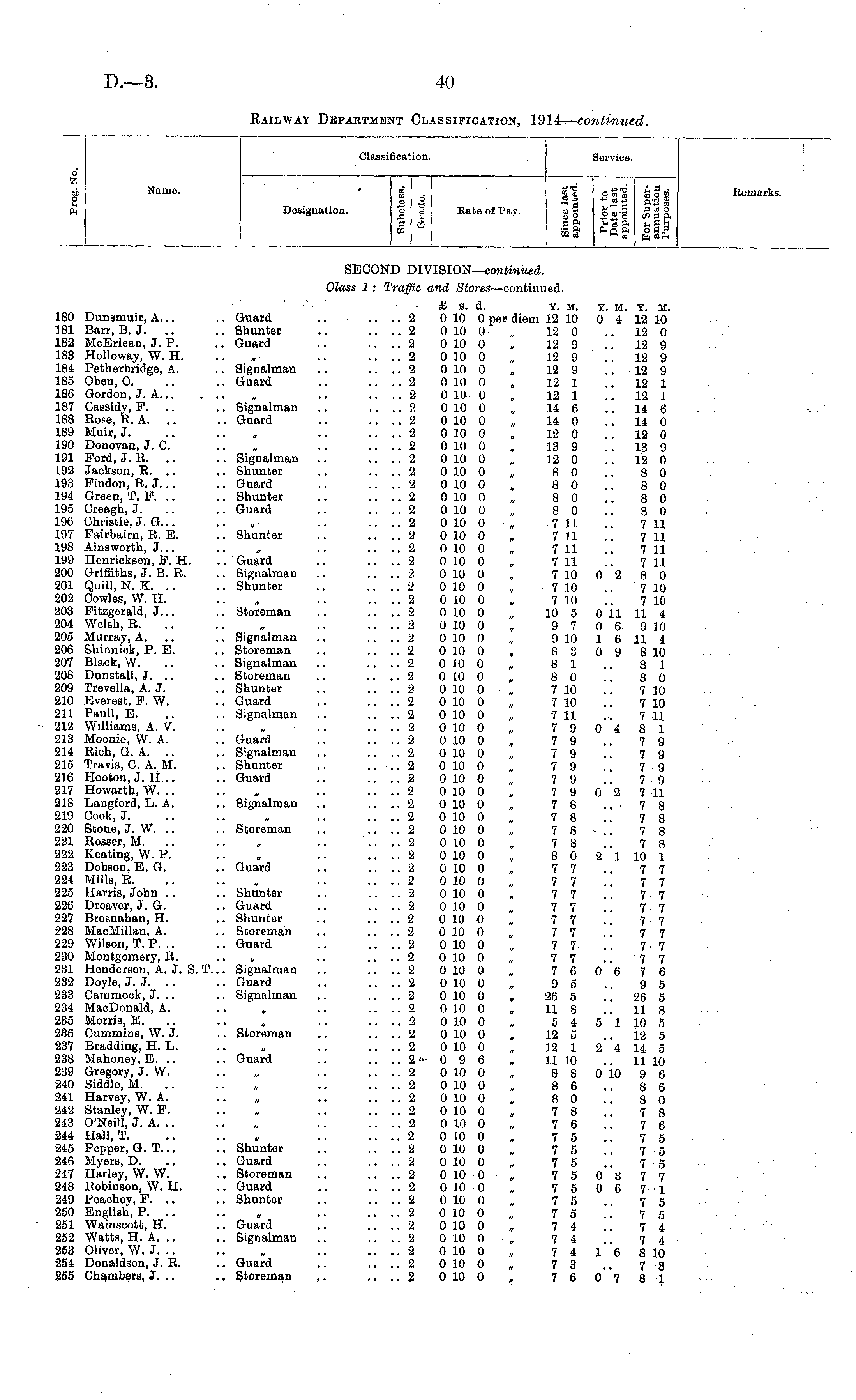 Classification. Service. d •A i Name. Designation. a 4 Eate of Pay. 11 " a S3 ■Sg X 9 3 I O SS'o cc s a h«a .. a p*q a S« a Remarks. SECOND DIVISION— continued. Class 1 : Traffic and Stores —continued. L80 Dunsmuir, A... .. Guard L81 Barr, B. J. .. .. Shunter L82 McErlean, J. P. .. Guard L83 Holloway, W. H. L84 Petherbridge, A. .. Signalman L85 Oben.C. .. .. Guard 186 Gordon, J. A 187 Cassidy, P. .. Signalman 188 Rose, B. A. .. .. Guard L89 Muir, J. 190 Donovan, J. C. L91 Ford, J. R. .. .. Signalman .92 Jackson, B. .. .. Shunter L93 Pindon, B. J. .. ., Guard L94 Green, T. P. .. .. Shunter .95 Creagh, J. .. .. Guard .96 Ohrietie, J. G... .97 Fairbairn, B. E. .. Shunter .98 Ainsworth, J... 199 Henrioksen, P. H. .. Guard !00 Griffiths, J. B. R. .. Signalman !01 Quill, N. K Shunter !02 Cowles, W. H. !03 Fitzgerald, J. .. .. Storeman !04 Welsh, R. .. !05 Murray, A. .. Signalman !06 Shinniok, P. E. .. Storeman !07 Black, W. .. .. Signalman !08 Dunstall, J. .. .. Storeman !09 Trevella, A. J. .. Shunter !10 Everest, P. W. .. Guard 111 Paull, E. .. .. Signalman !12 Williams, A. V. !13 Moonie, W. A. .. Guard !14 Rich, G. A. .. .. Signalman !15 Travis, 0. A. M. .. Shunter !16 Hooton, J. H... .. Guard !17 Howarth, W. .. !18 Langford, L. A. .. Signalman !19 Cook, J. !20 Stone, J. W. .. .. Storeman !21 Roeser, M. .. !22 Keating, W. P. !23 DobBon, E. G. .. Guard !24 Mills, R. !25 Harris, John .. .. Shunter !26 Dreaver, J. G. .. Guard !27 Brosnahan, H. .. Shunter !28 MacMillan, A. .. Storeman !29 Wilson, T. P. .. .. Guard !30 Montgomery, B. „ !31 Henderson, A. J. S. T... Signalman !32 Doyle, J. J. .. .. Guard !33 Cammock, J. .. .. Signalman !34 MacDonald, A. !35 Morris, E. .. !36 Cummins, W. J. .. Storeman !37 Bradding, H. L. !38 Mahoney, E. .. .. Guard !39 Gregory, J. W. !40 Siddle, M. !41 Harvey, W. A. !42 Stanley, W. P. !43 O'Neill, J. A. .. !44 Hall, T. !45 Pepper, G. T... .. Shunter !46 Myers, D. .. .. Guard !47 Harley, W. W. .. Storeman !48 Bobinson, W. H. .. Guard 249 Peaohey, P. .. .. Shunter !50 English, P. .. !51 Wainscott, H. .. Guard !52 Watts, H. A. .. .. Signalman !53 Oliver, W. J. .. !54 Donaldson, J. R. .. Guard !55 Chambers, J. .. .. Storeman £ s. d. Y. m. .... 2 0 10 0 per diem 12 10 .... 2 0 10 0 „ 12 0 .... 2 0 10 0 „ 12 9 .... 2 0 10 0 „ 12 9 .... 2 0 10 0 „ 12 9 .... 2 0 10 0 „ 12 1 .... 2 0 10 0 „ 12 1 .... 2 0 10 0 „ 14 6 .... 2 0 10 0 „ 14 0 .... 2 0 10 0 „ 12 0 .... 2 0 10 0 „ 13 9 .... 2 0 10 0 „ 12 0 .... 2 0 10 0 „ 80 .... 2 0 10 0 „ 80 .... 2 0 10 0 „ 8 0 .... 2 0 10 0 „ 80 .... 2 0 10 0 „ 7 11 .... 2 0 10 0 „ 711 .... 2 0 10 0 „ 7 11 .... 2 0 10 0 „ 7 11 .... 2 0 10 0 „ 7 10 .... 2 0 10 0 „ 7 10 .... 2 0 10 0 „ 7 10 .... 2 0 10 0 „ 10 5 .... 2 0 10 0 „ 9 7 .... 2 0 10 0 „ 9 10 .... 2 0 10 0 „ 83 ....2 0 10 0 „ 81 .... 2 0 10 0 „ 80 .... 2 0 10 0 „ 7 10 .... 2 0 10 0 „ 7 10 .... 2 0100 „ 711 .... 2 0 10 0 „ 79 .... 2 0 10 0 „ 7 9 .... 2 0 10 0 „ 7 9 .... 2 0 10 0 „ 7 9 .... 2 0 10 0 „ 7 9 .... 2 0 10 0 „ 7 9 .... 2 0 10 0 „ 78 .... 2 0 10 0 „ 7 8 .... 2 0 10 0 „ 7 8 .... 2 0 10 0 „ 7 8 .... 2 0 10 0 „ 8 0 ....2 0 10 0 „ 77 .... 2 0 10 0 „ 77 .... 2 0 10 0 „ 77 .... 2 0 10 0 „ 7 7 .... 2 0 10 0 „ 7 7 .... 2 0 10 0 „ 77 ....2 0 10 0 „ 77 .... 2 0 10 0 „ 77 ....2 0 10 0 „ 76 .... 2 0 10 0 „ 9 5 .... 2 0 10 0 „ 26 5 .... 2 0 10 0 „ 11 8 .... 2 0 10 0 „ 5 4 .... 2 0 10 0 „ 12 5 .... 2 0 10 0 „ 12 1 .. .. 2- 0 9 6 „ 11 10 .... 2 0 10 0 „ 88 .... 2 0 10 0 „ 8 6 ....2 0100 „ 80 ....2 0 10 0 „ 78 .... 2 0 10 0 „ 76 ....2 0 10 0 „ 75 .... 2 0 10 0 „ 7 5 .... 2 0 10 0 „ 75 .... 2 0 10 0, 75 .... 2 0 10 0 „ 7 5 .... 2 0 10 0 „ 7 5 .... 2 0 10 0 „ 75 .... 2 0 10 0 „ 74 .... 2 0 10 0 „ 74 .... 2 0 10 0 „ 7 4 .. .. 2 0 10 0 „ 73 ....2 0 10 0 . 76 Y. M. Y. M. 0 4 12 10 12 0 .. 12 9 .. 12 9 .. 12 9 .. 12 1 12 1 .. 14 6 14 0 .. 12 0 .. 13 9 12 0 8 0 8 0 8 0 8 0 7 11 7 11 7 11 7 11 0 2 8 0 7 10 7 10 0 11 11 4 0 6 9 10 1 6 11 4 0 9 8 10 8 1 8 0 7 10 7 10 7 11 0 4 8 1 7 9 7 9 7 9 7 9 0 2 7 11 7 8 7 8 7 8 7 8 2 1 10 1 7 7 7 7 7 7 7 7 7 7 7 7 7 7 7 7 0 6 7 6 9 5 26 5 .. 11 8 5 1 10 5 12 5 2 4 14 5 .. 11 10 0 10 9 6 8 6 8 0 7 8 7 6 7 5 7 5 7 5 0 3 7 7 0 6 7 1 7 5 7 5 7 4 7 4 16 8 10 7 3 0 7 8 1