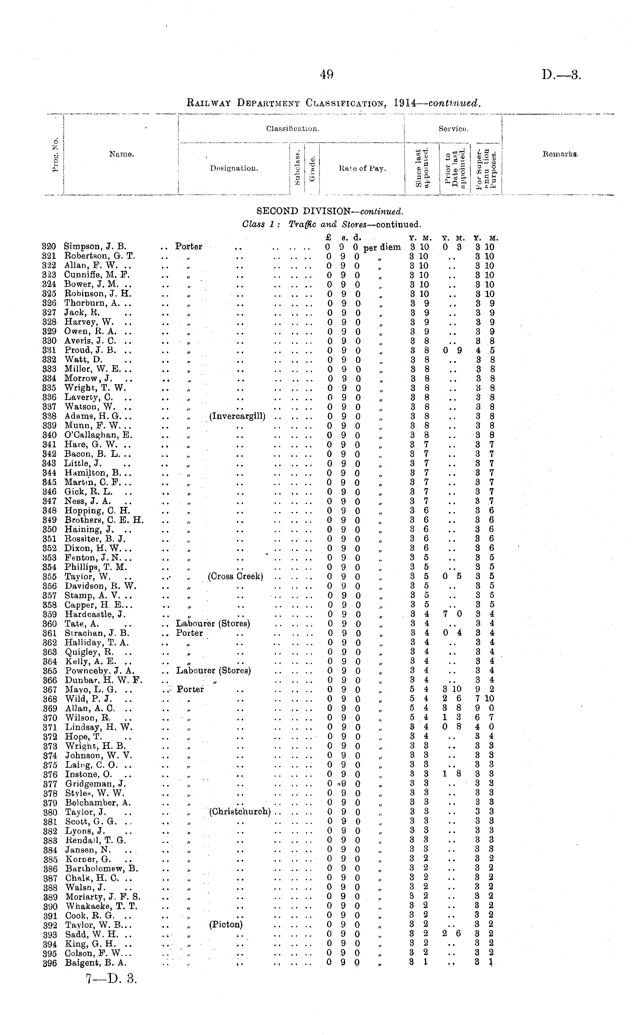 • I d Z y. Kame. o Classification. Service. i . li I ou-i &§» i Designation. EaleofPay. gg S ®-§ % g §, j » 5? -fig* 5SS ■ Remarks, SECOND DIVISION— continued. Class 1 : Traffic and Stores —continued. 320 Simpson, J. B. 321 Robertson, G. T. 322 Allan, F. W. .. 323 Cunniffe, M. P. 324 Bower, J. M. 325 Robinson, J. H. 326 Thorburn, A. .. 327 Jack, R. 328 Harvey, W. .. 329 Owen, R. A. .. 330 Averis, J. 0. 331 Proud, J. B. 332 Watt, D. 333 Miller, W. E. .. 334 Morrow, J. 335 Wright, T. W. 336 Laverty, C. .. 337 Watson, W. .. 338 Adams, H. G. .. 339 Munn, P. W. .. 340 O'Callagban, E. 341 Hare, G. W. .. 342 Bacon, B. L. .. 343 Little, J. 344 Hamilton, B. .. 345 Martin, C. P. .. 346 Giok, R. L. 347 Ness, J. A. 348 Hopping, C. H. 349 Brothers, 0. E. H. 350 Haining, J. .. 351 Rosaiter, B. J. 352 Dixon, H. W. .. 833 Penton, J. N. .. 354 Phillips, T. M. 355 Taylor, W. 356 Davidson, R. W. 357 Stamp, A. V. 358 Capper, HE... 359 Hardoastle, J. 360 Tate, A. 361 Straehan, J. B. 362 Halliday, T. A. 363 Quigley, R. .. 364 Kelly, A. E. .. 365 Powneeby. J. A. 366 Dunbar, H. W. F. 367 Mayo, L. G. 368 Wild, P. J. 369 Allan, A. O. .. 370 Wilson, B. 371 Lindsay, H. W. 372 Hope, T. 373 Wright, H. B. 374 Johnson, W. V. 375 Lair.g, CO. .. 376 Instone, O. 377 Gridgeman, J. 378 Styles, W. W. 379 Belohamber, A. 380 Taylor, J. 381 Scott, G. G. .. 382 Lyons, J. 383 Rendall, T. G. 384 Jansen, N. ... 385 Korner, G. 386 Bartholomew, B. 387 Chalk, H. C. 388 Walsn.J. 389 Moriarty, J. F. S. 390 Whakaeke, T. T. 391 Cook, R. G. 392 Taylor, W. B... 393 Sadd, W. H. 394 King, G. H. .. 395 Colson, F. W... 396 Baigent, B. A. & S. d. . T. M. Y. M. T. M. .. Porter .. 0 9 0 per diem 3 10 0 3 3 10 0 9 0 . 3 10 .. 3 10 0 9 0 „ 3 10 .. 3 10 0 9 0 „ 3 10 .. 3 10 0 9 0 „ 3 10 .. 3 10 0 9 0 „ 3 10 .. 3 10 0 9 0 „ 3 9 .. 3 9 0 9 0 . 3 9 .. 3 9 0 9 0 „ 3 9 .. 3 9 „ .. 0 9 0 . 3 9 .. 3 9 0 9 0 „ 3 8 .. 3 8 090 „ 380945 090 „ 38 .. 38 0 9 0 „ 3 8 .. 3 8 0 9 0 „ 3 8 .. 3 8 0 9 0 „ 3 8 .. 3 8 0 9 0 „ 3 8 .. 3 8 0 9 0 „ 3 8 .. 3 8 (Invercargill) 090 „ 38 .. 38 0 9 0 „ 3 8 .. 3 8 0 9 0 „ 3 8 .. 3 8 0 9 0 „ 3 7 .. 3 7 0 9 0 .. 3 7 .. 3 7 0 9 0 „ 3 7 .. 3 7 0 9 0 „ 3 7 .. 3 7 0 9 0 „ 3 7 .. 3 7 0 9 0 . 3 7 .. 3 7 0 9 0 , 3 7 .. 3 7 ..„ .. 090 „ 36 .. 36 090 , 36 .. 36 0 9 0 „ 3 6 .. 3 6 0 9 0 „ 3 6 .. 3 6 0 9 0 , 3 6 .. 3 6 ' 0 9 0 „ 3 5 .. 3 5 0 9 0 „ 3 5 .. 3 5 (Cross Creek) 090 „ 35 05 35 0 9 0 „ 3 5 .. 3 5 0 9 0 „ 3 5 .. 3 5 0 9 0 . 3 5 .. 3 5 090 „ .34 70 34 .. Labourer (Stores) 0 9 0 „ 3 4 .. 3 4 .. Porter .. 090 „ 34 04 34 0 9 0 „ 3 4 .. 3 4 0 9 0 . 3 4 .. 3 4 0 9 0 „ 3 4 .. 3 4 .. Labourer (Stores) 090 „ 34 .. 34 0 9 0 „ 3 4 .. 3 4 .. Porter .. 090 „ 54 3 10 92 090 „ 54267 10 ..„ .. 090 . 543890 090 „ 541367 090 , 340840 0 9 0 „ 3 4 .. 3 4 0 9 0 „ 3 3 .. 3 3 0 9 0 , 3 3 .. 3 3 0 9 0 „ 3 3 .. 3 3 090 „ 331833 0 9 0 „ 3 3 ..88 0 9 0 „ 3 3 .. 3 3 0 9 0 „ 3 3 .. 3 3 (Chrietchurch) 090 „ 33 .. 33 „ ' .. 0 9 0 „ 3 3 .. 3 3 0 9 0 „ 3 3 .. 3 3 0 9 0 , 3 3 .. 3 3 .. „ .. 0 9 0 „ 3 3 .. 3 3 0 9 0 , 3 2 .. 3 2 0 9 0 „ 3 2 .. 3 2 0 9 0 „ 3 2 .. 3 2 090 „ 32 .. 32 .. „ .. 0 9 0 „ 3 2 .. 3 2 0 9 0 „ 3 2 .. 3 2 0 9 0 „ 3 2 .. 3 2 (Picton) 090 » 32 .. 32 .. „ .. 0 9 0 . 3 2 2 6 3 2 0 9 0 . 3 2 .. 3 2 .. „ .. 0 9 0 „ 3 2 .. 3 2 .. „ ,. 0 9 0 „ 3 1 .. 3 1