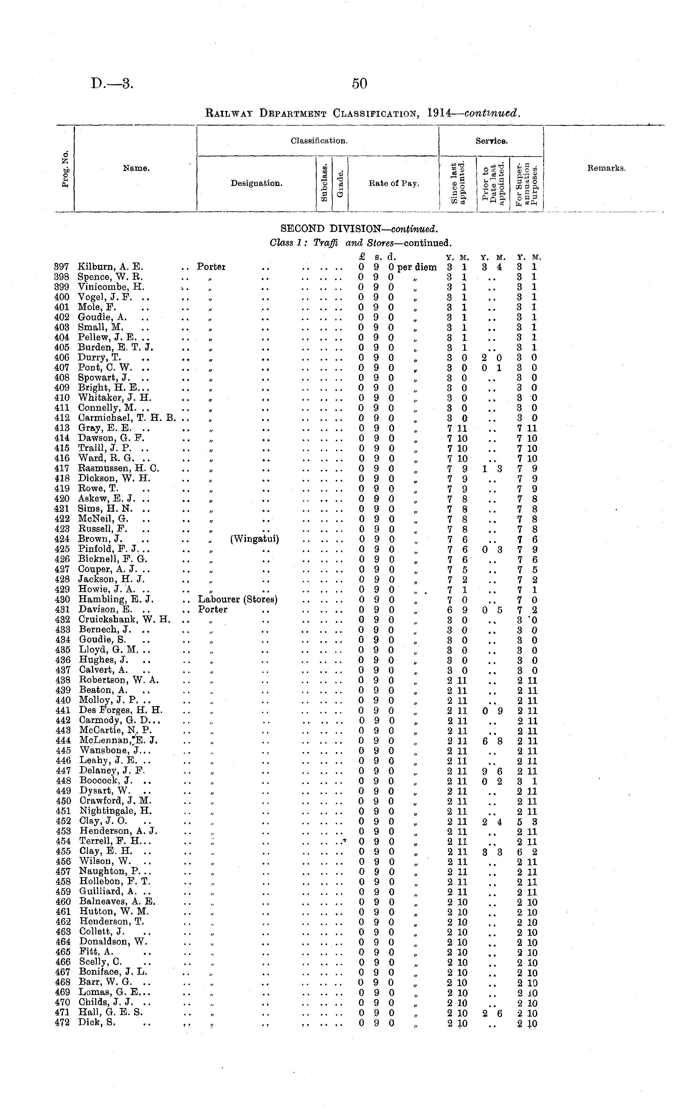 Classii [cation. Service. Ob Name. j| o<? jc« Kemarks. fi Designation. j3 1 Bate of Pay, g| g^.3 .g g ° j> 5 _ _l| III d 'A Name. Designation. SECOND DIVISION— continued. Class 1: Traffi and Stores —continued. £ s. d. y. m. y. m. y. m, 397 Kilburn, A. E. .. Porter .. 0 9 0 per diem 3 1 3 4 3 1 398 Spenoe, W. R. .. „ .. 0 9 0 „ 3 1 .. 3 1 399 Vinioombe, H. ■.. „ .. 0 9 0 , 3 1 .. 3 1 400 Vogel, J. F. .. .. „ .. 0 9 0 , 3 1 .. 3 1 401 Mole, P. .. .. „ .. 0 9 0 „ 3 1 .. 3 1 402 Goudie, A. .. .. . .. 0 9 0 , 3 1 .. 3 1 403 Small, M. .. .. , .. 0 9 0 , 3 1 .. 3 1 404 Pellew, J. E. .. .. , .. 0 9 0 „ 3 1 .. 3 1 405 Burden, E. T. J. .. , .. 0 9 0 „ 3 1 .. 3 1 406 Durry, T. .. .. „ .. 0 9 0 „ 3 0 2 0 3 0 407 Pont, C. W. .. .. , .. 0 9 0 , 3 0 0 13 0 408 Spowart, J. .. .. „ .. 0 9 0 „ 3 0 .. 3 0 409 Bright, H. E... .. „ .. 0 9 0 „ 3 0 .. 3 0 410 Whitaker, J. H. .. „ .. 0 9 0 „ 3 0 .. 3 0 411 Connelly, M. .. .. , .. 0 9 0 „ 3 0 .. 3 0 412 Carmiohael, T. H. B. .. . .. 0 9 0 „ 3 0 .. 3 0 413 Gray, E. E. .. .. „ .. 0 9 0 „ 7 11 .. 7 11 414 Dawson, G. F. .. „ .. 0 9 0 „ 7 10 .. 7 10 415 Traill, J. P. .. .. „ .. 0 9 0 , 7 10 .. 7 10 416 Ward, E. G. .. .. . .. 0 9 0 „ 7 10 .. 7 10 417 Easmussen, H. C. .. „ .. 0 9 0 „ 7 9 13 7 9 418 Diekson, W. H. .. , .. 0 9 0 „ 7 9 .. 7 9 419 Rowe, T. .. .. „ .. 0 9 0 , 7 9 .. 7 9 420 Askew, E. J. .. .. „ .. 0 9 0 „ 7 8 .. 7 8 421 Sims, H.N... .. „ .. 0 9 0 . 7 8 .. 7 8 422 McNeil, G. .. .. „ .. 0 9 0 „ 7 8 .. 7 8 423 Russell, F. .. .. „ .. 0 9 0 „ 7 8 .. 7 8 424 Brown, J. .. .. „ (Wingatui) 090 , 76 .. 76 425 Pinfold, F. J. .. .. „ .. 0 9 0 „ 7 6 0 3 7 9 426 Bioknell, F. G. .. „ .. 0 9 0 „ 7 6 .. 7 6 427 Couper, A. J. .. .. „ .. 0 9 0 „ 7 5 .. 7 5 428 Jackson, H. J. .. „ .. 0 9 0 „ 7 2 .. 7 2 429 Howie, J. A. .. .. „ .. 0 9 0 „ 7 1 .. 7 1 430 Hambling, E. J. .. Labourer (Stores) 090 „ 70 .. 70 431 Davison, E. .. .. Porter .. 090 „ 69 05 72 432 Cruickshank, W. H. .. „ .. 0 9 0 „ 3 0 .. 3 '0 433 Bernech, J. .. .. „ .. 0 9 0 , 3 0 .. 3 0 434 Goudie, S. .. .. „ .. 0 9 0 „ 3 0 .. 3 0 435 Lloyd, G. M. .. .. „ .. 0 9 0 „ 3 0 .. 3 0 436 Hughes, J. .. .. „ .. 0 9 0 „ 3 0 .. 3 0 437 Calvert, A. .. .. „ .. 0 9 0 „ 3 0 .. 3 0 438 Robertson, W. A, .. „ .. 0 9 0 „ 2 11 .. 2 11 439 Beaton, A. .. „ .. 0 9 0 „ 2 11 .. 2 11 440 Molloy, J. P. .. .. „ .. 0 9 0 „ 2 11 .. 2 11 441 Des Forges, H. H. .. „ .. 0 9 0 , 2 11 0 9 2 11 442 Carmody, G. D .. 0 9 0 , 2 11 .. 2 11 443 McCartie, N. P. .. „ .. 0 9 0 „ 2 11 .. 2 11 444 MoLennan,"E. J. .. „ .. 0 9 0 „ 2 11 6 8 2 11 445 Wansbone.'j... .. „ .. 0 9 0 „ 2 11 .. 2 11 440 Leahy, ,T. E. .. .. „ .. 0 9 0 „ 2 11 .. 2 11 447 Delaney, J. F. .. „ .. 0 9 0 „ 2 11 9 6 2 11 448 Boococ'k, J. .. .. „ .. 0 9 0 „ 2 11 0 2 3 1 449 Dysart, W. .. .. , .. 0 9 0 „ 2 11 .. 2 11 450 Crawford, J. M. .. „ .. 0 9 0 „ 2 11 .. 2 11 451 Nightingale, H. .. „ .. 0 9 0 „ 2 11 .. 2 11 452 Clay, J. O. .. .. „ .. 0 9 0 „ 2 11 2 4 5 3 453 Henderson, A. J. .. „ .. 0 9 0 „ 2 11 .. 2 11 454 Terrell, F. H... .. „ .. 0 9 0 , 2 11 .. 2 11 455 Clay, E. H. .. .. „ .. 0 9 0 „ 2 11 3 3 6 2 456 Wilson, W. .. .. „ .. 0 9 0 „ 2 11 .. 2 11 457 Naughton, P. .. .. „ .. 0 9 0 „ 2 11 .. 2 11 458 Hollebon, F. T. .. „ .. 0 9 0 „ 2 11 .. 2 11 459 Guilliard, A. .. .. „ .. 0 9 0 „ 2 11 .. 2 11 460 Balneaves, A. E. .. „ .. 0 9 0 , 2 10 2 10 461 Hutton, W. M. .. „ .. 0 9 0 „ 2 10 .. 2 10 462 Henderson, T. .. „ .. 0 9 0 „ 2 10 .. 2 10 463 Collett, J. .. .. „ .. 0 9 0 , 2 10 .. 2 10 464 Donaldson, W. .. „ .. 0 9 0 „ 2 10 .. 2 10 465 Fitt, A. .. .. „ .. 0 9 0 „ 2 10 .. 2 10 466 Scelly, C. .. .. „ .. 0 9 0 „ 2 10 .. 2 10 467 Boniface, J. L. .. „ .. 0 9 0 , 2 10 .. 2 10 468 Barr, W. G. .. .. „ .. 0 9 0 „ 2 10 .. 2 10 469 Lomas, G. E... .. „ .. 0 9 0 „ 2 10 .. 2 10 470 Childs, J.J... .. „ .. 0 9 0 „ 2 10 .. 2 10 471 Hall, G. E. S. .. „ .. 0 9 0 „ 2 10 2 6 2 10 472 Dick, S. .. .. , ,. 0 9 0 „ 2 10 .. 2 10
