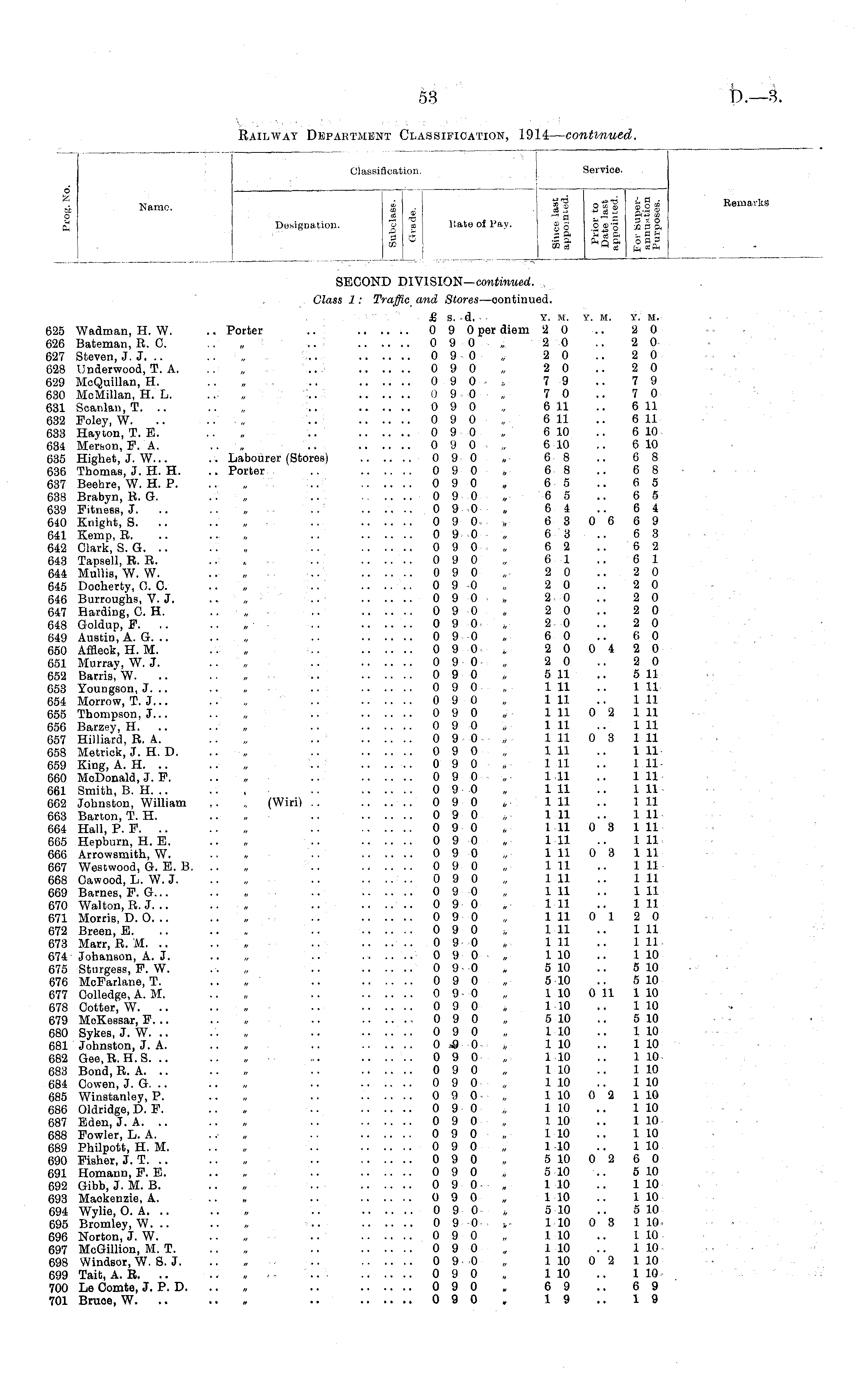 Classification. Service. o 'A »j Name. o 6 IK :'r, p Name. Ill ■■ H rM I'P Designation. *3 » Kate ol Fay. gj oo-§ Jo § p, I 5 II s «! Ill R Remarks ai tr rks SECOND DIVISION— continued. Glass 1: Traffic and Stores —oontinued. 625 Wadman, H. W. 626 Bateman, R. C. 627 Steven, J. J. 628 Underwood, T. A. 629 McQuillan, H. 630 McMillan, H. L. 631 Seanlan, T. .. 632 Foley, W. 633 Hayton, T. E. 634 Merson, F. A. 635 Highefc, J. W... 636 Thomas, J. H. H. 637 Beehre, W. H. P. 638 Brabyn, R. G. 639 Fitness, J. 640 Knight, S. 641 Kemp, R. 642 Clark, S. G. 643 Tapsell, R. E. 644 Mullis, W. W. 645 Dooherty, 0. 0. 646 Burroughs, V. J. 647 Harding, C. H. 648 Goldup, F. .. 649 Austin, A. G. .. 650 Affleck, H. M. 651 Murray, W. J. 652 Barris, W. 653 Youngson, J. .. 654 Morrow, T. J. .. 655 Thompson, J.. . 656 Barzey, H. .. 657 Hilliara, R. A. 658 Metriok, J. H. D. 659 King, A. H. 660 McDonald, J. F. 661 Smith, B. H. .. 662 Johnston, William 663 Barton, T. H. 664 Hall, P. F. 665 Hepburn, H. E. 666 Arrowsmith, W. 667 Westwood, G. E. B. 668 Oawood, L. W. J. 669 Barnes, F. G... 670 Walton, R. J. .. 671 Morris, D. O. .. 672 Breen, E. 673 Marr, R. M. .. 674 Johanson, A. J. 675 Sturgees, F. W. 676 MoFarlane, T. 677 Oolledge, A. M. 678 Cotter, W. .. 679 MoKessar, F. .. 680 Sykes, J. W. 681 Johnston, J. A. 682 Gee, R. H.S. .. 683 Bond, R. A. 684 Cowen, J. G. 685 Winstanley, P. 686 Oldridge, D. F. 687 Eden, J. A. 688 Fowler, L. A. 689 Philpott, H. M. 690 Fisher, J. T. 691 Homann, F. E. 692 Gibb, J. M. B. 693 Mackenzie, A. 694 Wylie, O. A. 695 Bromley, W. .. 696 Norton, J. W. 697 McGillion, M. T. 698 Windsor, W. S. J. 699 Tait, A. R. 700 Le Comte, J. P. D. 701 Bruoe, W. £ s. d. y. m. y, m, y. m. .. Porter .. 0 9 0 per diem 2 0 .. 2 0 0 9 0 „ 2 0 .. 2 0 0 9 0 „ 2 0 .. 2 0 0 9 0 „ 2 0 .. 2 0 0 9 0 , 7 9 .. 7 9 :.. 0 9 0, 70 .. 70 0 9 0 „ 6 11 .. 6 11 .. . „ , .. 0 9 0 „ 6 11 .. 6 11 0 9 0 „ 6 10 .. 6 10 0 9 0,, 6 10 .. 6 10 .. Labourer (Stores) 090 „ 68 .. 68 .. Porter .. 090 „ 68 .. 68 090 „ 65 .. 65 0 9 0 „ 6 5 .. 6 5 0 9 0 „ 6 4 .. 6 4 . , .. 0 9 0 „ 6 3 0 6 6 9 0 9 0 „ 6 3 .. 6 3 0 9 0, 62 ..62 , .. 0 9 0 „ 6 1 .. 6 1 0 9 0 „ 2 0 .. 2 0 0 9 0 „ 2 0 .. 2 0 0 9 0 „ 2 0 .. 2 0 „ .. 0 9 0 „ 2 0 .. 2 0 0 9 0,, 20 .. 20 0 9 0 „ 6 0 .. 6 0 20 04 20 .. „ .. 0 9 0,, 20 .. 20 0 9 0 „ 5 11 .. 5 11 „ .. 0 9 0 „ 1 11 .. 1 11 0 9 0 „ 1 11 .. 1 11 0 9 0 „ 1 11 0 2 1 11 0 9 0 „ 1 11 .. 1 11 0 9 0,, 1 11 03 1 11 .. „ .. 0 9 0,, 1 11 .. 1 11- ...... 090,, 111 .. 1 11 - 0 9 0 „ 1 11 .. 1 11 0 9 0 „ 1 11 .. 1 11 .. „ (Wiri) .. 0 9 0 ,. 1 11 .. 1 11 0 9 0 „• 1 11 .. Ill 0 9 0 „ 1 11 0 3 1 11 0 9 0 „ 1 11 .. 1 11 0 9 0 „ 1 11 0 3 1 11 0 9 0 „ 1 11 .. 1 11 ...... 0 9 0 „ 1 11 .. Ill 0 9 0 „ 1 11 .. 1 11 0 9 0 „ 1 11 .. 1 11 0 9 0 „ 1 11 0 1 2 0 0 9 0 „ 1 11 .. Ill 0 9 0 „ 1 11 .. 1 11 0 9 0,, 1 10 .. 1 10 0 9 0 „ 5 10 .. 5 10 0 9 0 „ 5 10 .. 5 10 0 9 0 „ 1 10 0 11 1 10 , . .. 0 9 0 „ 1 10 .. 1 10 0 9 0 „ 5 10 .. 5 10 0 9 0 , 1-10 .. 1 10 0 S 0 ,, 1 10 .. 1 10 „ ... 0 9 0 „ 1 10 .. 1 10 0 9 0 „ 1 10 .. 1 10 0 9 0 „ 1 10 .. 1 10 0 9 0,, 1 10 0 2 1 10 0 9 0 „ 1 10 .. 1 10 0 9 0 „ 1 10 .. 1 10 0 9 0 „ 1 10 .. 1 10 0 9 0 „ 1 10 .. 1 10 0 9 0 „ 5 10 0 2 6 0 0 9 0 „ 5 10 .. 5 10 0 9 0,, 1 10 .. 1 10 0 9 0 . 1 10 .. 1 10 0 9 0 „ 5 10 .. 5 10 0 9 0 -„ 1 10 0 3 1 10 0 9 0 „ 1 10 .. 1 10 0 9 0 , 1 10 .. 1 100 9 0 „ 1 10 0 2 1 10 0 9 0 „ 1 10 .. 1 10 090 , 69 .. 69 .. .. 0 9 0. 1 9 .. 1 9