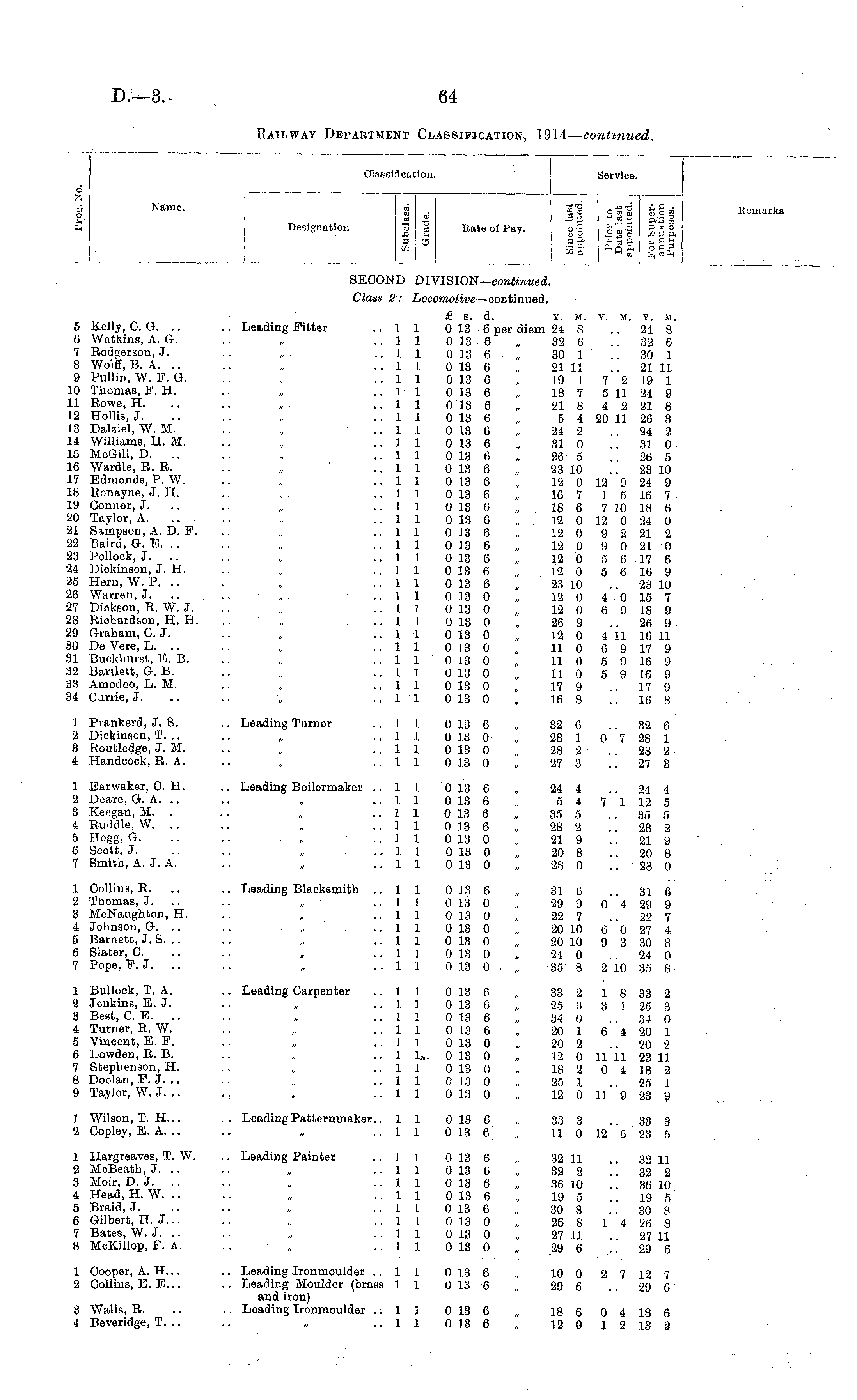 Classification. Service. o oh Name. £ i 4 %i s|| m Designation. u S Rate of Pay. o-| g^.3 = * ° p eh a a '£ "S ." c Remarks I SECOND DIVISION— continued. Class 3: Locomotive —continued. 5 Kelly, G. G. .. 6 Watkins, A. G. 7 Rodgerson, J. 8 Wolfi, B. A. .. 9 Pullin, W. F. G. 10 Thomas, F. H. 11 Rowe, H. 12 Hollis, J. 13 Dalziel, W. M. 14 Williams, H. M. 15 MoGill, D. .. 16 Wardle, R. R. 17 Edmonds, P. W. 18 Ronayne, J. H. 19 Connor, J. 20 Taylor, A. ... 21 Sampson, A. D. P. 22 Baird, G. E. .. 23 Pollock, J. .. 24 Dickinson, J. H. 25 Hern, W. P. .. 26 Warren, J. .. 27 Diokson, R. W. J. 28 Ricbardson, H. H. 29 Graham, 0. J. 30 De Vere, L. .. 31 Buckhurst, E. B. 32 Bartlett, G. B. 33 Amodeo, L. M. 34 Currie, J. £ s. d. y. m. Y. m. y. m. .. Leading Fitter ..11 0 13 6 per diem 24 8 .. 24 8 ..11 0 13 6 „ 32 6 32 6 •. 1 1 0 13 6 30 1 .. 30 1 ■ ■11 0 13 6 „ 21 11 21 11 • • 1 1 0 13 6 19 1 7 2 19 1 ■ ■ 1 1 0 13 6 „ 18 7 5 11 24 9 .. 1 1 0 13 6 21 8 4 2 21 8 -.11 0 13 6 „ 5 4 20 11 26 3 ..11 0 13 6 „ 24 2 24 2 • •11 0 13 6 „ 31 0 31 0 .. 1 1 0 13 6 „ 26 5 26 5 ..11 0 13 6 „ 23 10 23 10 ..11 0 13 6 „ 12 0 12 9 24 9 .. 1 1 0 18 6 16 7 1 5 16 7 • •11 0 13 0 „ 18 6 7 10 18 6 •. 1 1 0 13 6 12 0 12 0 24 0 • • 1 1 0 13 6 12 0 9 2 21 2 .. 1 1 0 13 6 12 0 9 0 21 0 • •11 0 13 6 „ 12 0 5 6 17 6 ..11 0 13 6 „ 12 0 5 6 16 9 ..11 0 13 6 , 23 10 23 10 • • 1 1 0 13 0 12 0 4 0 15 7 • • 1 1 0 13 0 12 0 6 9 18 9 -.11 0 13 0 . 26 9 26 9 .. 1 1 0 13 0 12 0 4 11 16 11 .. 1 1 0 13 0 11 0 6 9 17 9 ■ ■ 1 1 0 13 0 „ 11 0 5 9 16 9 .. 1 1 0 13 0 „ 11 0 5 9 16 9 ••11 0 13 0 „ 17 9 17 9 ..11 0 13 0 „ 16 8 16 8 1 Prankerd, J. S. 2 Dickinson, T. .. 3 Routledge, J. M. 4 Handcock, R. A. .. Leading Turner ..11 0 13 6 „ 32 6 .. 32 6 • • 1 1 0 18 0 28 1 0 7 28 1 • •11 0 13 0 „ 28 2 28 2 ..11 0 13 0 „ 27 3 27 8 1 Earwaker, C. H. 2 Deare, G. A. 3 Keogan, M. 4 Ruddle, W. .. 5 Hogg, G. 6 Scott, J. 7 Smith, A. J. A. .. Leading Boilermaker ..11 0 13 6 „ 24 4 .. 24 4 • ■ 1 1 0 13 6 5 4 7 1 12 5 -.11 0 13 6 „ 35 5 35 5 • •11 0 13 6 „ 28 2 28 2 • •11 0 13 0 , 21 9 21 9 • •11 0 13 0 „ 20 8 20 8 -.11 0 13 0 , 28 0 28 0 1 Collins, R. 2 Thomas, J. 3 McNaughton, H. 4 Johnson, G. .. 5 Barnett, J. S. 6 Slater, C. 7 Pope, P. J. .. Leading Blacksmith ..11 0 13 6 „ 31 6 .. 31 6 • • 1 1 0 13 0 „ 29 9 0 4 29 9 • •11 0 13 0 „ 22 7 22 7 .. 1 1 0 13 0 20 10 6 0 27 4 • • 1 1 0 13 0 20 10 9 3 30 8 • •11 0 13 0 „ 24 0 24 0 ■ • 1 1 0 13 0 „ 35 8 2 10 35 8 1 Bullock, T. A. 2 Jenkins, E. J. 3 Best, C. E. .. 4 Turner, R. W. 5 Vincent, E. P. 6 Lowden, R. B. 7 Stephenson, H. 8 Doolan, P. J. .. 9 Taylor, W. J. .. .. Leading Carpenter ..11 0 13 6 „ 33 2 1 8 33 2 ■ • . • • 1 1 0 13 6 25 3 3 1 25 3 ■ • 1 1 0 13 6 34 0 .. 34 0 .. 1 1 0 18 6 . 20 1 6 4 20 1 • •11 0 13 0 „ 20 2 20 2 ■ • 1 1*. 0 13 0 „ 12 0 11 11 23 11 • •11 0 13 0 „ 18 2 0 4 18 2 • • 1 1 0 13 0 25 1 .. 25 1 • • 1 1 0 13 0 12 0 11 9 23 9 1 Wilson, T. H... 2 Copley, E. A. .. . Leading Patternmaker.. 11 0 13 6 „ 33 3 .. 33 3 • ■ 1 1 0 13 6 11 0 12 5 23 5 1 Hargreaves, T. W. 2 McBeath, J. .. 3 Moir, D. J. 4 Head, H. W. 5 Braid, J. 6 Gilbert, H. J. .. 7 Bates, W. J. 8 McKillop, P. A. .. Leading Painter ..11 0 13 6 „ 32 11 .. 32 11 ■■11 0 13 6 „ 32 2 32 2 .. 1 1 0 18 6 . 36 10 .. 36 10 .. 1 1 0 13 6 19 5 .. 19 5 ■•11 0 13 6 , 30 8 30 8 ■ ■ 1 1 0 13 0 26 8 1 4 26 8 •■11 0 13 0 „ 27 11 27 11 •■11 0 13 0 „ 29 6 29 6 1 Cooper, A. H... 2 Collins, E. E... 3 Walls, R. 4 Beveridge, T. .. .. Leading Ironmoulder ..11 0 13 6 „ 10 0 2 7 12 7 .. Leading Moulder (brass 11 0 13 6 ,; 29 6 29 6 and iron) .. Leading Ironmoulder .. 1 1 0 13 6 „ 18 6 0 4 18 6 • • 1 1 0 13 6 „ 12 0 1 2 13 2