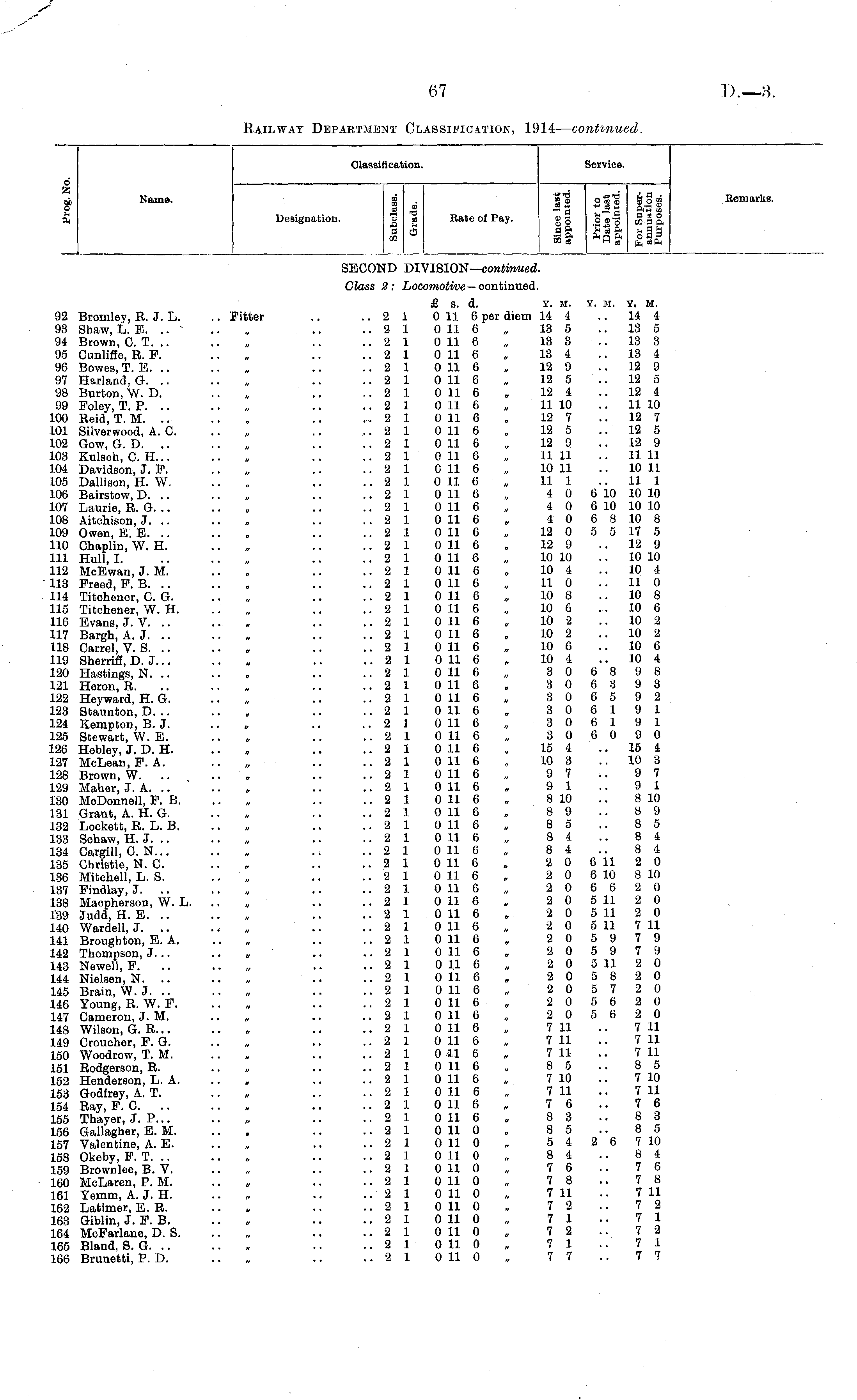Classil ication. Service. O ? Name. M i Bate ol Pay. a go .9 a 31 s sli Hi P x O .2 .£ o ccpa W 03 pq «Ph Remarks. Designation. SECOND DIVISION— continued. Class 2 : Locomotive —continued. 92 Bromley, R. J. L. 93 Shaw, L. E. .. ' 94 Brown, C. T. .. 95 Cunliffe, B. P. 96 Bowes, T. E. .. 97 Harland, G. .. 98 Burton, W. D. 99 Foley, T. P. 100 Reid, T. M. 101 Silverwood, A. C. 102 Gow, G. T>. .. 103 Kulsoh, C. H... 104 Davidson, J. F. 105 Dallison, H. W. 106 Bairstow, D. .. 107 Laurie, R. G. .. 108 Aitohison, J. .. 109 Owen, B. E. .. 110 Chaplin, W. H. 111 Hull, I. 112 MoEwan, J. M. 113 Freed, F. B. .. 114 Titchener, C. G. 115 Titchener, W. H. 116 Evans, J. V. 117 Bargh, A. J. 118 Carrel, V. S. 119 Sherriff, D.J... 120 Hastings, N. .. 121 Heron, R. 122 Heyward, H. G. 123 Staunton, D. .. 124 Kempton, B. J. 125 Stewart, W. E. 126 Hebley, J. D. H. 127 McLean, F. A. 128 Brown, W. .. 129 Maher, J. A. 130 MoDonnell, F. B. 131 Grant, A. H. G. 132 Lookett, R. L. B. 133 Sohaw, H. J. 134 Cargill, C. N... 135 Christie, N. C. 136 Mitchell, L. S. 137 Findlay, J. .. 138 Maopherson, W. L. 139 Judd, H. E. .. 140 Wardell, J. .. 141 Broughton, E. A. 142 Thompson, J. .. 143 Newell, F. 144 Nielsen, N. 145 Brain, W.J. 146 Young, R. W. F. 147 Cameron, J. M. 148 Wilson, G. R... 149 Croucher, F. G. 150 Woodrow, T. M. 151 Rodgerson, R. 152 Henderson, L. A. 153 Godfrey, A. T. 154 Ray, F. C. 155 Thayer, J. P... 156 Gallagher, E. M. 157 Valentine, A. E. 158 Okeby, F. T. 159 Brownlee, B. V. 160 McLaren, P. M. 161 Yemm, A. J. H. 162 Latimer, E. R. 163 Giblin, J. F. B. 164 McFarlane, D. S. 165 Bland, 8. G. .. 166 Brunetti, P. D. .. Fitter • • u • • V • • n & s. d. y. m. ..21 0 11 6 per diem 14 i ..21 0 11 6 „ 13 5 ..21 0 11 6 „ 13 3 ..2 1 0 11 6 „ 13 4 ..21 0 11 6 „ 12 9 ..21 0 11 6 „ 12 5 ..2 1 0 11 6 „ 12 4 ..2 1 0 11 6 „ 11 10 ..21 0 11 6 „ 12 7 ..21 0 11 6 „ 12 5 ..21 0 11 6 „ 12 9 ..2 1 0 11 6 „ 11 11 ..2 1 0 11 6 „ 10 11 ..2 1 0 11 6 , 11 1 ..21 0 11 6 , 40 ..21 0 11 6 „ 40 ..2 1 0 11 6 . 4 0 ..2 1 0 11 6 „ 12 0 ..2 1 0 11 6 „ 12 9 ..21 0 11 6 „ 10 10 ..2 1 0 11 6 „ 10 4 ..2 1 0 11 6 „ 11 0 ..2 1 0 11 6 , 10 8 ..2 1 0 11 6 , 10 6 ..21 0 11 6 „ 10 2 ..2 1 0 11 6 „ 10 2 ..21 0 11 6 „ 10 6 ..21 0 11 6 „ 10 4 ..21 0 11 6 , 30 ..2 1 0 11 6 , 3 0 ..2 1 0 11 6 , 3 0 ..21 0 11 6 , 30 ..2 1 0 11 6 , 3 0 ..21 0 11 6 „ 30 ..2 1 0 11 6 „ 15 4 ..21 0 11 6 „ 10 3 ..21 0 11 6 , 97 ..21 0 11 6 „ 91 ..21 0 11 6 , 8 10 ..2 1 0 11 6 „ 8 9 ..21 0 11 6 . 85 ..21 0 11 6 . 84 ..21 0 11 6 . 84 ..2 1 0 11 6 » 2 0 ..2 1 0 11 6 „ 2 0 ..21 0 11 6 „ 20 ..2 1 0 11 6 . 2 0 ..2 1 0 11 6 , 2 0 ..2 1 0 11 6 . 1 Q ..21 0 11 6 „ 20 ..2 1 0 11 6 „ 2 0 ..2 1 0 11 6 „ 2 0 ..2 1 0 11 6 . 2 0 ..21 0 11 6 „ 20 ..21 0 11 6 „ 20 ..2 1 0 11 6 „ 2 0 ..2 1 0 11 6 . 7 11 ..21 0 11 6 , 7 11 ..21 0 11 6 7 11 ..2 1 0 11 6 „ 8 5 ..2 1 0 11 6 . 7 10 ..21 0 11 6 „ 7 11 ..2 1 0 11 6 , 7 6 ..21 0 11 6 „ 83 ..21 0 11 0 „ 85 ..2 1 0 11 0 . 5 4 ..2 1 0 11 0 „ 8 4 ..21 0 11 0 „ 76 ..21 0 11 0 , 78 ..2 1 0 11 0 „ 7 11 ..2 1 0 11 0 „ 7 2 ..2 1 0 11 0 „ 7 1 ..21 0 11 0 „ 72 ..2 1 0 11 0 „ 7 1 ..2 1 0 11 0 . 7 7 Y. M. Y, M. 14 4 .. 13 5 .. 13 3 .. 13 4 12 9 .. 12 5 12 4 11 10 12 7 .. 12 5 12 9 .. 11 11 .. 10 11 .. 11 1 6 10 10 10 6 10 10 10 6 8 10 8 5 5 17 5 12 9 .. 10 10 .. 10 4 11 0 .. 10 8 .. 10 6 10 2 10 2 .. 10 6 10 4 6 8 9 8 6 3 9 3 6 5 9 2 6 19 1 6 19 1 6 0 9 0 .. 15 i 10 3 9 7 9 1 8 10 8 9 8 5 8 4 8 4 6 11 2 0 G 10 8 10 6 6 2 0 5 11 2 0 5 11 2 0 5 11 7 11 5 9 7 9 5 9 7 9 5 11 2 0 5 8 2 0 5 7 2 0 5 6 2 0 5 6 2 0 7 11 7 11 7 11 8 5 7 10 7 11 7 6 8 3 8 5 2 C 7 10 8 4 7 6 7 8 7 11 7 2 7 1 7 2 7 1 7 7