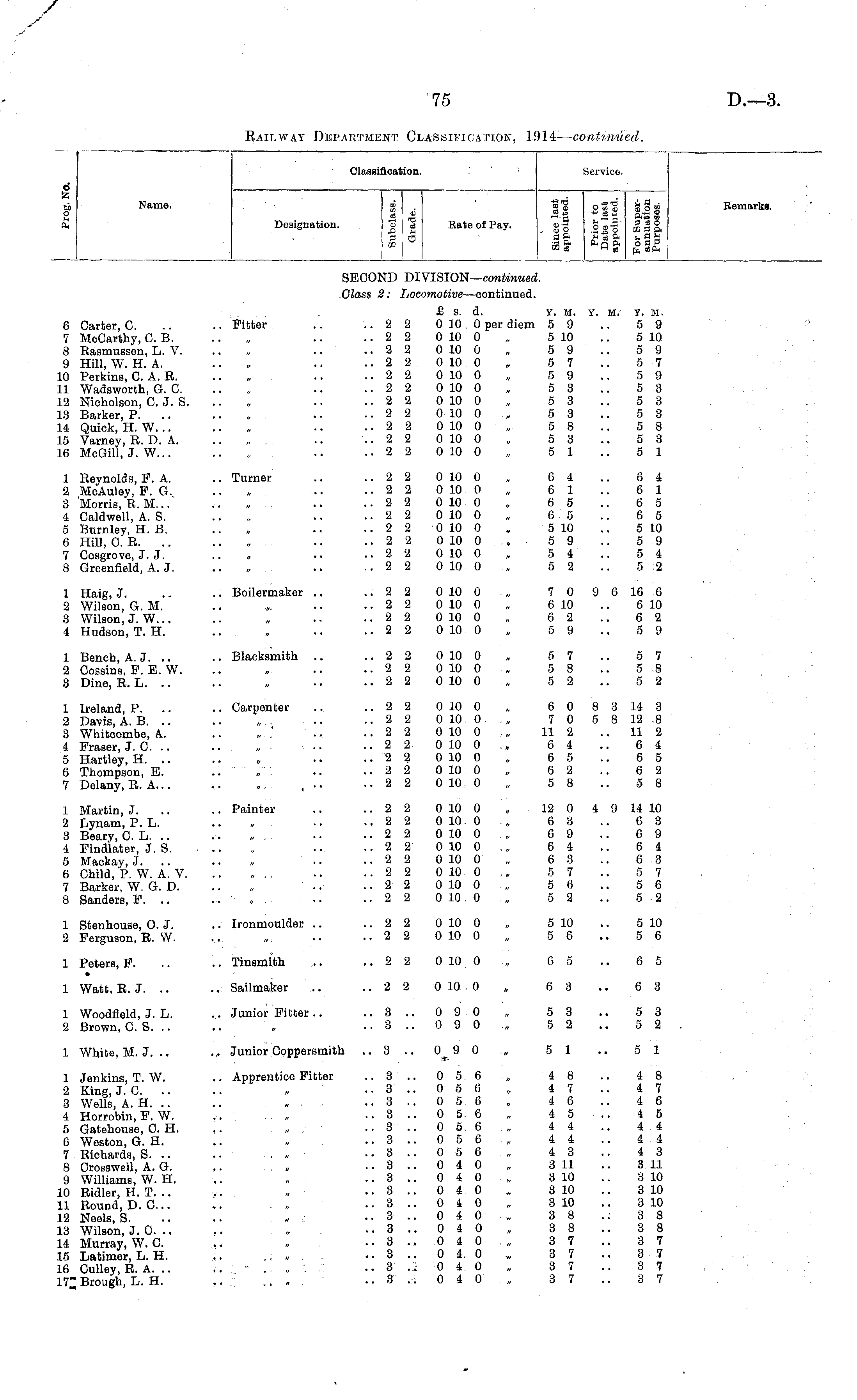 Classification. Service. t> Name. Designation. I i 2 g Bate oi Pay. - « T3 & En ■ § 2 ° S £ a-2 <S "23 a" B s%o oO 2-So apa Bern arks. SECOND DIVISION— continued. Class 8: Locomotive —continued. 6 Carter, C. 7 McCarthy, C. B. 8 Rasmussen, L. V. 9 Hill, W. H. A. 10 Perkins, C. A. R. 11 Wadsworth, G. C. 12 Nicholson, C. J. S. 13 Barker, P. 14 Quick, H. W. .. 15 Vamey, R. D. A. 16 MoGill, J. W... £ s. d. y. m. y. m. y. m. .. Fitter .. ..2 2 0 10 0 per diem 5 9 .. 5 9 ..2 2 0 10 0 „ 5 10 .. 5 10 ..22 0 10 0 „ 59 .. 59 ..2 2 0 10 0 „ 5 7 .. 5 7 ..2 2 0 10 0 „ 5 9 .. 5 9 ..22 0 10 0 „ 53 .. 53 ..2 2 0 10 0 „ 5 3 .. 5 3 ..22 0 10 0 „ 53 .. 53 ..2 2 0 10 0 „ 5 8 .. 5 8 ..2 2 0 10 0 „ 5 3 .. 5 3 ..22 0 10 0 „ 51 .. 51 1 Reynolds, F. A. 2 MoAuley, P. G. 3 Morris, R. M... 4 Caldwell, A. S. 5 Burnley, H. B. 6 Hill, C. R. .. 7 Cosgrove, J. J. 8 Greenfield, A. J. .. Turner .. ..2 2 0 10 0 „ 6 4 .. 6 4 ..2 2 0 10 0 „ 6 1 .. 6 1 ..2 2 0 10 0 „ 6 5 .. 6 5 ..22 0 10 0 „ 65 .. 65 ..2 2 0 10 0 „ 5 10 .. 5 10 ..2 2 0 10 0 ,,5 9 .. 5 9 ..22 0 10 0 „ 54 .. 54 ..2 2 0 10 0 „ 5 2 .. 5 2 1 Haig, J. 2 Wilson, G. M. 3 Wilson, J. W... 4 Hudson, T. H. .. Boilermaker .. ..22 0 10 0 „ 7 0 0 6 16 6 ..22 0 10 0 „ 6 10 .. 6 10 ..22 0 10 0 „ 62 .. 62 ..2 2 0 10 0 „ 5 9 .. 5 9 1 Bench, A. J. 2 Cossina, F. E. W. 3 Dine, R. L. .. Blacksmith .. ..22 0 10 0 „ 57 .. 57 ..22 0 10 0 „ 58 .. 58 ..2 2 0 10 0 „ 5 2 .. 5 2 1 Ireland, P. .. 2 Davis, A. B. .. 3 Whitcornbe, A. 4 Fraser, J. C. .. 5 Hartley, H. .. 6 Thompson, E. 7 Delany, R. A... .. Carpenter .. ..2 2 0 10 0 „ 6 0 8 3 14 3 ..2 2 0 10 0 „ 7 0 5 8 12 8 ..2 2 0 10 0 „ 11 2 .. 11 2 ..2 2 0 10 0 „ 6 4 .. 6 4 ..2 2 0 10 0 „ 6 5 .. 6 5 ..22 0 10 0 „ 62 .. 62 ..2 2 0 10 0 „ 5 8 .. 5 8 1 Martin, J. 2 Lynam, P. L. 3 Beary, C. L. .. 4 Pindlater, J. S. 5 Mackay, J. 6 Child, P. W. A. V. 7 Barker, W. G. D. 8 Sanders, F. .. Painter .. ..22 0 10 0 „ 12 0 4 9 14 10 ..2 2 0 10 0 „ 6 3 .. 6 3 ..2 2 0 10 0 „ 6 9 .. 6 9 ..2 2 0 10 0 .„ 6 4 .. 6 4 .. ..2 2 0 10 0 „ 6 3 .. 6 3 ..2 2 0 10 0 „ 5 7 .. 5 7 ..22 0 10 0 „ 56 .. 56 ..2 2 0 10 0 „ 5 2 .. 5 2 1 Stenhouse, 0. J. 2 Ferguson, R. W. .. Ironmoulder .. ..2 2 0 10 0 „ 5 10 .. 5 10 ..2 2 0 10 0 „ 5 6 .. 5 6 1 Peters, F. .. Tinsmith .. ..22 0 10 0 „ 65 .. 65 1 Watt, R.J. .. .. Sailmaker .. ..2 2 0 10 0 „ 6 3 .. 6 3 1 Woodfield, J. L. 2 Brown, C. S. .. Junior Fitter.. ..3.. 090 . 53 .. 53 ..3.. 090 „ 52 .. 52 1 White, M.J. .. ... Junior Coppersmith ..3.. 090 „ 51 .. 51 1 Jenkins, T. W. 2 King, J. C. 3 Wells, A. H. 4 Horrobin, F. W. 5 Gatehouse, C. H. 6 Weston, G. H. 7 Richards, S. .. 8 Crosswell, A. G. 9 Williams, W. H. 10 Ridler, H. T. .. 11 Round, D. C... 12 Neels, B. 13 Wilson, J. C. 14 Murray, W. C. 15 Latimer, L. H. 16 Culley, R. A. 17" Brough, L. H. .. Apprentice Fitter ..3.. 056 „ 48 .. 48 .. 3 .. 0 5 6 „ 4 7 .. 4 7 .. 3 .. 0 5 6 „ 4 6 .. 4 6 .. 3 .. 0 5 6 „ 4 5.. 4 5 .. 3 .. 0 5 6 „ 4 4 .. 4 4 .. 3 .. 0 5 6 „ 4 4 .. 4 4 .. 3 .. 0 5 6 „ 4 3 .. 4 3 .. 3 .. 0 4 0 „ 3 11 .. 3 11 .. 3 .. 0 4 0 „ 3 10 .. 3 10 .. 3 .. 0 4 0 „ 3 10 .. 3 10 .. 3 .. 0 4 0 „ 3 10 .. 3 10 .. 3 .. 0 4 0 „ 3 8 .: 3 8 .. 3 .. 0 4 0 „ 3 8 .. 3 8 .. 3 .. 0 4 0 „ 3 7 .. 3 7 ,. 3 .. 0 4 0 3 7 .. 3 7 .. 3 .. 0 4 0 „ 3 7 .. 3 7 .. 3 .. 0 4 0 „ 3 7 .. 3 7