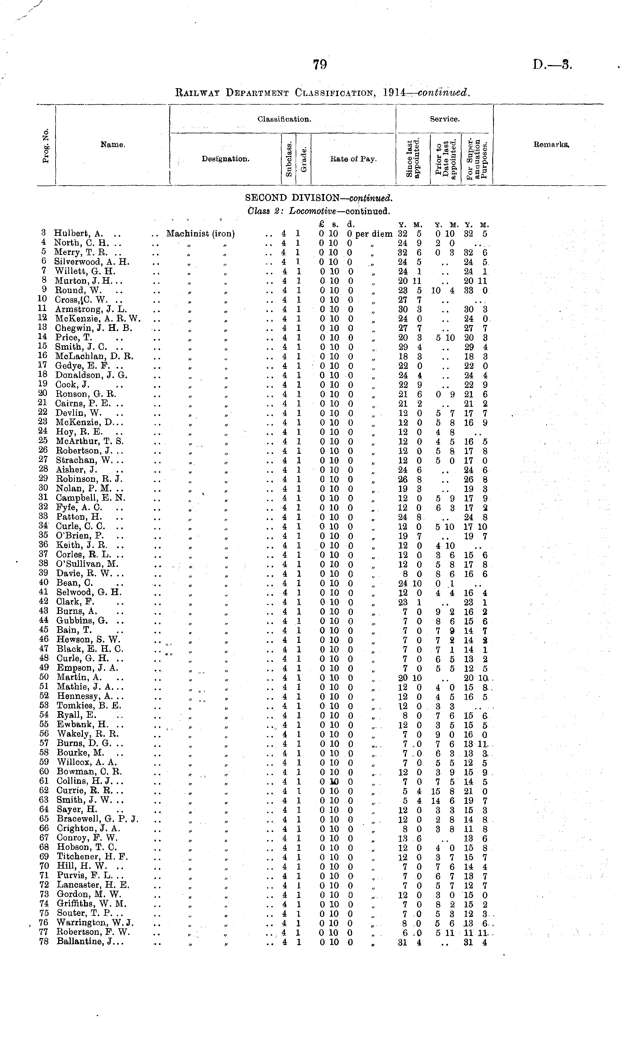 Classification. Service. d Name. EG 1 I a S Kate of Pay. n sis si |ri u S3 . o o if •Bit .. 3 U ft esfc Remarks, Designation. SECOND DIVISION— continued. Class 2: Locomotive— oontinued. 3 Hulbert, A. .. 4 North, G. H. 5 Merry, T. R. .. 6 Silverwood, A. H. 7 Willett, G. H. 8 Murton, J. H. .. 9 Bound, W. .. 10 Cross/jC. W. .. 11 Armstrong, J. L. 12 McKenzie, A. R. W. 13 Chegwin, J. H. B. 14 Price, T. 15 Smith, J. C. 16 McLaehlan, D. R. 17 Gedye, E. P. 18 Donaldson, J. G. 19 Cook, J. 20 Ronson, G. R. 21 Cairns, P. E. 22 Devlin, W. 23 McKenzie, D... 24 Hoy, R. E. .. 25 McArthur, T. S. 26 Robertson, J. .. 27 Straehan, W. .. 28 Aisher, J. 29 Robinson, R. J. 30 Nolan, P. M. .. 31 Campbell, E. N. 32 Pyfe, A. C. 33 Patton, H. .. 34 Curie, C. C. 35 O'Brien, P. .. 36 Keith, J. R. 37 Corles, R. L. 38 O'Sullivan, M. 39 Davie, R. W. .. 40 Bean, C. 41 Selwood, G. H. 42 Clark, P. 43 Burns, A. 44 Gubbins, G. .. 45 Bain, T. 46 Hewson, S. W. 47 Black, E. H. C. 48 Curie, G. H. 49 Empson, J. A. 50 Martin, A. 51 Mathie, J. A. .. 52 Hennessy, A. .. 53 Tomkies, B. E. 54 Ryall, E. 55 Ewbank, H. .. 56 Wakely, R. R. 57 Burns, D. G. 58 Bourke, M. .. 59 Willcox, A. A. 60 Bowman, C. R. 61 Collins, H. J. .. 62 Currie, R. R. .. 63 Smith, J. W. .. 64 Sayer, H. 65 Bracewell, G. P. J. 66 Crighton, J. A. 67 Conroy, P. W. 68 Hobson, T. C. 69 Titohener, H. P. 70 Hill, H. W. 71 Purvis, P. L. .. 72 Lancaster, H. E. 73 Gordon, M. W. 74 Griffiths, W. M. 75 Souter, T. P. .. 76 Warrington, W. J. 77 Robertson, P. W. 78 Ballantine, J. .. .. Machinist (iron) & S. d. Y. M. Y. M. Y. M. ..41 0 10 0 per diem 32 5 0 10 32 5 ..41 0 10 0 „ 24 9 2 0 ..4 1 0 10 0 „ 32 6 0 3 32 6 ..41. 0 10 0 „ 24 5 .. 24 5 ..4 1 0 10 0 „ 24 1 .. 24 1 ..4 1 0 10 0 „ 20 11 .. 20 11 ..4 1 0 10 0 „ 23 5 10 4 33 0 ..4 1 0 10 0 „ 27 7 ..4 1 0 10 0 „ 30 3 .. 30 3 ..4 1 0 10 0 „ 24 0 .. 24 0 ..4 1 0 10 0 „ 27 7 .. 27 7 ..41 0 10 0 „ 20 3 5 10 20 3 ..41 0 10 0 „ 29 4 .. 29 4 ..4 1 0 10 0 „ 18 3 .. 18 3 ..4 1 0 10 0 „ 22 0 .. 22 0 ..4 1 0 10 0 „ 24 4 .. 24 4 ..41 0 10 0 „ 22 9 .. 22 9 ..4 1 0 10 0 „ 21 6 0 9 21 6 ..41 0 10 0 „ 21 2 .. 21 2 ..4 1 0 10 0 „ 12 0 5 7 17 7 ..4 1 0 10 0 „ 12 0 5 8 16 9 ..4 1 0 10 0 „ 12 0 4 8 ..4 1 0 10 0 „ 12 0 4 5 16 5 ..4 1 0 10 0 „ 12 0 5 8 17 8 ..41 0 10 0 „ 12 0 5 0 17 0 ..4 1 0 10 0 „ 24 6 .. 24 6 ..4 1 0 10 0 „ 26 8 .. 26 8 ..4 1 0 10 0 „ 19 3 .. 19 3 ..41 0 10 0 „ 12 0 5 9 17 9 ..4 1 0 10 0 „ 12 0 6 3 17 2 ..4 1 0 10 0 „ 24 8 .. 24 8 ..4 1 0 10 0 , 12 0 5 10 17 10 ..4 1 0 10 0 „ 19 7 .. 19 7 ..4 1 0 10 0 „ 12 0 4 10 ..41 0 10 0 „ 12 0 3 6 15 6 ..4 1 0 10 0 „ 12 0 5 8 17 8 ..4 1 0 10 0 „ 8 0 8 6 16 6 ..4 1 0 10 0 „ 24 10 0 1 ..4 1 0 10 0 „ 12 0 4 4 16 4 ..4 1 0 10 0 „ 23 1 .. 23 1 ..41 0 10 0 „ 7 0 9 2 16 2 ..4 1 0 10 0 „ 7 0 8 6 15 6 ..4 1 0 10 0 „ 7 0 7 9 14 7 ..4 1 0 10 0 „ 7 0 7 2 14 2 ..41 0 10 0 „ 7 0 7 1 14 1 ..4 1 0 10 0 „ 7 0 6 5 13 2 ..4 1 0 10 0 „ 7 0 5 5 12 5 ..41 0 10 0 „ 20 10 .. 20 10 ..4 1 0 10 0 „ 12 0 4 0 15 8 ..4 1 0 10 0 „ 12 0 4 5 16 5 ..41 0 10 0 „ 12 0 3 3 ..4 1 0 10 0 „ 8 0 7 6 15 6 ..4 1 0 10 0 „ 12 0 3 5 15 5 ..4 1 0 10 0 „ 7 0 9 0 16 0 ..41 0 10 0 „„. 70 7 6 13 11 ..41 0 10 0 „ 7 0 6 3 13 3 ..4 1 0 10 0 „ 7 0 5 5 12 5 ..4 1 0 10 0 „ 12 0 3 9 15 9 ..41 0100 „ 70 75 14 5 ..4 1 0 10 0 „ 5 4 15 8 21 0 ..4 1 0 10 0 ,„ 5 4 14 6 19 7 ..4 1 0 10 0 „ 12 0 3 3 15 3 ..4 1 0 10 0 „ 12 0 2 8 14 8 ..4 1 0 10 0 „ 8 0 3 8 11 8 ..41 0 10 0 „ 13 6 .. 13 6 ..4 1 0 10 0 „ 12 0 4 0 15 8 ..4 1 0 10 0 „ 12 0 3 7 15 7 ..41 0 10 0 „ 7 0 7 6 14 4 ..41 0 10 0 „ 7 0 6 7 13 7 ..4 1 0 10 0 „ 7 0 5 7 12 7 ..4 1 0 10 0 „ 12 0 3 0 15 0 ..4 1 0 10 0 „ 7 0 8 2 15 2 ..4 1 0 10 0 „ 7 0 5 3 12 3 ..4 1 0 10 0 „., 8 0 5 6 13 6 ..41 0 10 0 „ 60 5 11 11 11 ..4 1 0 10 0 „ 31 4 .. 31 4