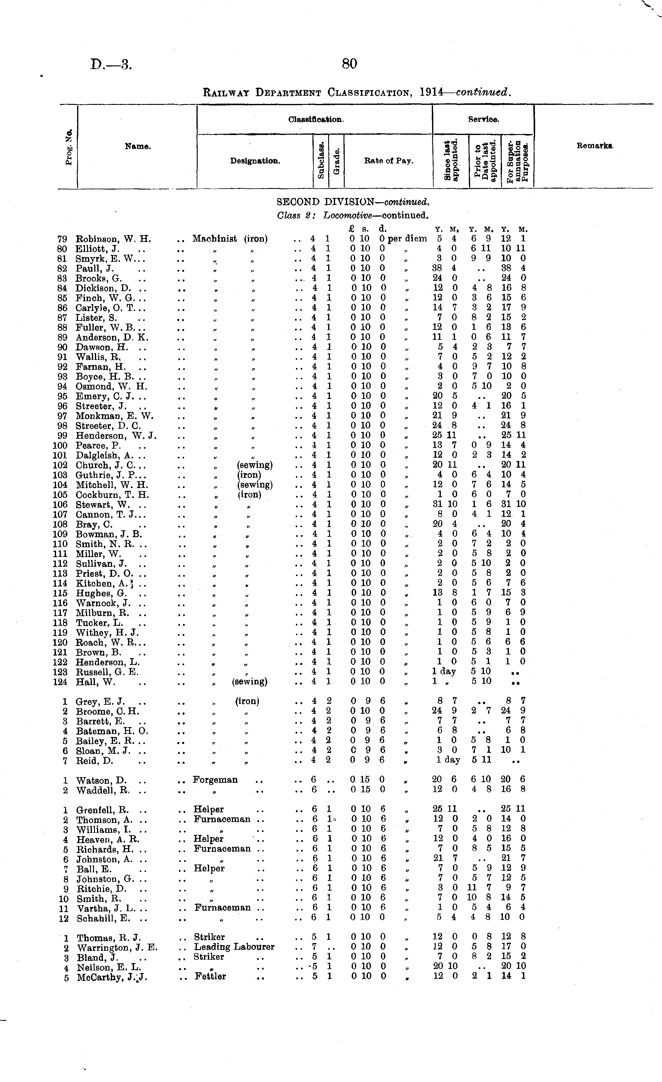 Classification, Servloe. t a. Name. I 11 if •ii si! 2 5'3 ill Remarks, Designation. 5 Bate of Pay. SECOND DIVISION— continued. Class 2; Locomotive —continued. 79 Robinson, W. H. 80 Elliott, J. 81 Smyrk, E. W... 82 Paull, J. 83 Brooks, G. 84 Dickison, D. .. 85 Pinch, W. G. .. 86 Carlyle, 0. T. .. 87 Lister, S. 88 Fuller, W. B... 89 Anderson, D. K. 90 Dawson, H. .. 91 Wallis, R. 92 Parnan, H. .. 93 Boyoe, H. B. .. 94 Osmond, W. H. 95 Emery, 0. J. .. 96 Streeter, J. .. 97 Monkman, E. W. 98 Streeter, D. C. 99 Henderson, W. J. LOO Pearoe, P. L01 Dalgleish, A. .. L02 Church, J. C... L03 Guthrie, J. P... L04 Mitohell, W. H. L05 Cockburn, T. H. L06 Stewart, W. .. 107 Cannon, T. J... L08 Bray, C. L09 Bowman, J. B. L10 Smith, N. R. .. Lll Miller, W. L12 Sullivan, J. .. L13 Priest, D. 0. .. L14 Kitohen, A. J .. L15 Hughes, G. .. L16 Warnook, J. .. L17 Milburn, R. .. L18 Tucker, L. 119 Withey, H. J. ■20 Roaoh, W. R... L21 Brown, B. .22 Henderson, L. L23 Russell, G. E. L24 Hall, W. .. Machinist (iron) (sewing) (iron) ,, (sewing) „ (iron) (sewing) £ s. d. y. m, y. m, Y. M. ..41 0 10 0 per diem 54 6 9 12 1 ..4 1 0 10 0 „ 4 0 6 11 10 11 ..41 0 10 0 „ 3 0 9 9 10 0 ..41 0 10 0 „ 38 4 .. 38 4 ... 4 1 0 10 0 „ 24 0 .. 24 0 ..4 1 0 10 0 „ 12 0 4 8 16 8 ..41 0 10 0 „ 12 0 3 6 15 6 ..4 1 0 10 0 „ 14 7 3 2 17 9 ..4 1 0 10 0 „ 7 0 8 2 15 2 ..4 1 0 10 0 „ 12 0 1 6 13 6 ..4 1 0 10 0 „ 11 1 0 6 11 7 ..41 0 10 0 „ 54 23 77 ..4 1 0 10 0 „ 7 0 5 2 12 2 ..4 1 0 10 0 „ 4 0 9 7 10 8 ..41 0 10 0 „ 3 0 7 0 10 0 ..41 0 10 0 „ 2 0 5 10 2 0 ..4 1 0 10 0 „ 20 5 .. 20 5 ..41 0 10 0 „ 12 0 4 1 16 1 ..4 1 0 10 0 „ 21 9 .. 21 9 ..4 1 0 10 0 „ 24 8 .. 24 8 ..4 1 0 10 0 „ 25 11 .. 25 11 ..4 1 0 10 0 „ 13 7 0 9 14 4 ..4 1 0 10 0 „ 12 0 2 3 14 2 ..4 1 0 10 0 „ 20 11 .. 20 11 ..4 1 0 10 0 „ 4 0 6 4 10 4 ..4 1 0 10 0 „ 12 0 7 6 14 5 ..41 0 10 0 „ 10 60 70 ..4 1 0 10 0 „ 31 10 1 6 31 10 ..41 0 10 0 „ 8 0 4 1 12 1 ..4 1 0 10 0 „ 20 4 .. 20 4 ..4 1 0 10 0 „ 4 0 6 4 10 4 ..41 0 10 0 „ 20 72 20 ..41 0 10 0 „ 20 58 20 ..41 0 10 0 „ 2 0 5 10 2 0 ..41 0 10 0 „ 20 58 20 ..41 0 10 0 „ 20 56 76 ..41 0 10 0 „ 13 8 1 7 15 3 ..41 0 10 0 „ 10 60 70 ..41 0 10 0 „ 10 59 69 ..41 0 10 0 „ 10 59 10 ..41 0 10 0 „ 10 58 10 ..41 0 10 0 „ 10 56 66 ..4 1 0 10 0 „ 10 5 3 10 ..41 0 10 0 „ 10 5 110 ..4 1 0 10 0 „ 1 day 5 10 ..4 1 0 10 0 „ 1 „ 5 10 .. 1 Grey, E.J. 2 Broome, C. H. 3 Barrett, E. 4 Bateman, H. 0. 5 Bailey, E. R. .. 6 Sloan, M. J. .. 7 Reid, D. (iron) ..42 096 „ 87 .. 87 ..42 0 10 0 „ 24 9 2 7 24 9 ..42 096 „ 77 .. 77 ..42 096 „ 68 .. 68 ..42 096 „ 10 58 10 ..42 096 » 30 71 10 1 ..4 2 0 9 6 . 1 day 5 11 1 Watson, D. .. 2 Waddell, R. .. .. Porgeman .. 6 .. 0 15 0 „ 20 6 6 10 20 6 .. 6 .. 0 15 0 „ 12 0 4 8 16 8 1 Grenfell, R. .. 2 Thomson, A. .. 3 Williams, I. .. 4 Heaven, A. R. 5 Richards, H. .. 6 Johnston, A. .. 7 Ball, E. 8 Johnston, G. .. 9 Ritchie, D. .. 10 Smith, R. 11 Vartha, J. L. .. 12 Sohahill, E. .. .. Helper .. Purnaceman .. .. Helper .. Purnaceman .. .. Helper .. Purnaoeman .. ..6 1 0 10 6 „ 25 11 .. 25 11 ..6 1 0 10 6 „ 12 0 2 0 14 0 ..6 1 0 10 6 „ 7 0 5 8 12 8 ..6 1 0 10 6 „ 12 0 4 0 16 0 ..6 1 0 10 6 „ 7 0 8 5 15 5 ..61 0 10 6 „ 21 7 .. 21 7 ..61 0 10 6 „ 70 59 12 9 ..61 0 10 6 „ 7 0 5 7 12 5 ..6 1 0 10 6 „ 3 0 11 7 9 7 ..6 1 0 10 6 „ 7 0 10 8 14 5 ..61 0 10 6 „ 10 54 64 ..61 0 10 0 „ 5 4 4 8 10 0 1 Thomas, R. J. 2 Warrington, J. E. 3 Bland, J. 4 Neilson, E. L. 5 MoCarthy, J..J. .. Striker .. Leading Labourer .. Striker .. Pettier ..51 0 10 0 „ 12 0 0 8 12 8 .. 7 .. 0 10 0 „ 12 0 5 8 17 0 ..5 1 0 10 0 „ 7 0 8 2 15 2 ..-5 1 0 10 0 „ 20 10 .. 20 10 ..51 0 10 0 » 12 0 21 14 1
