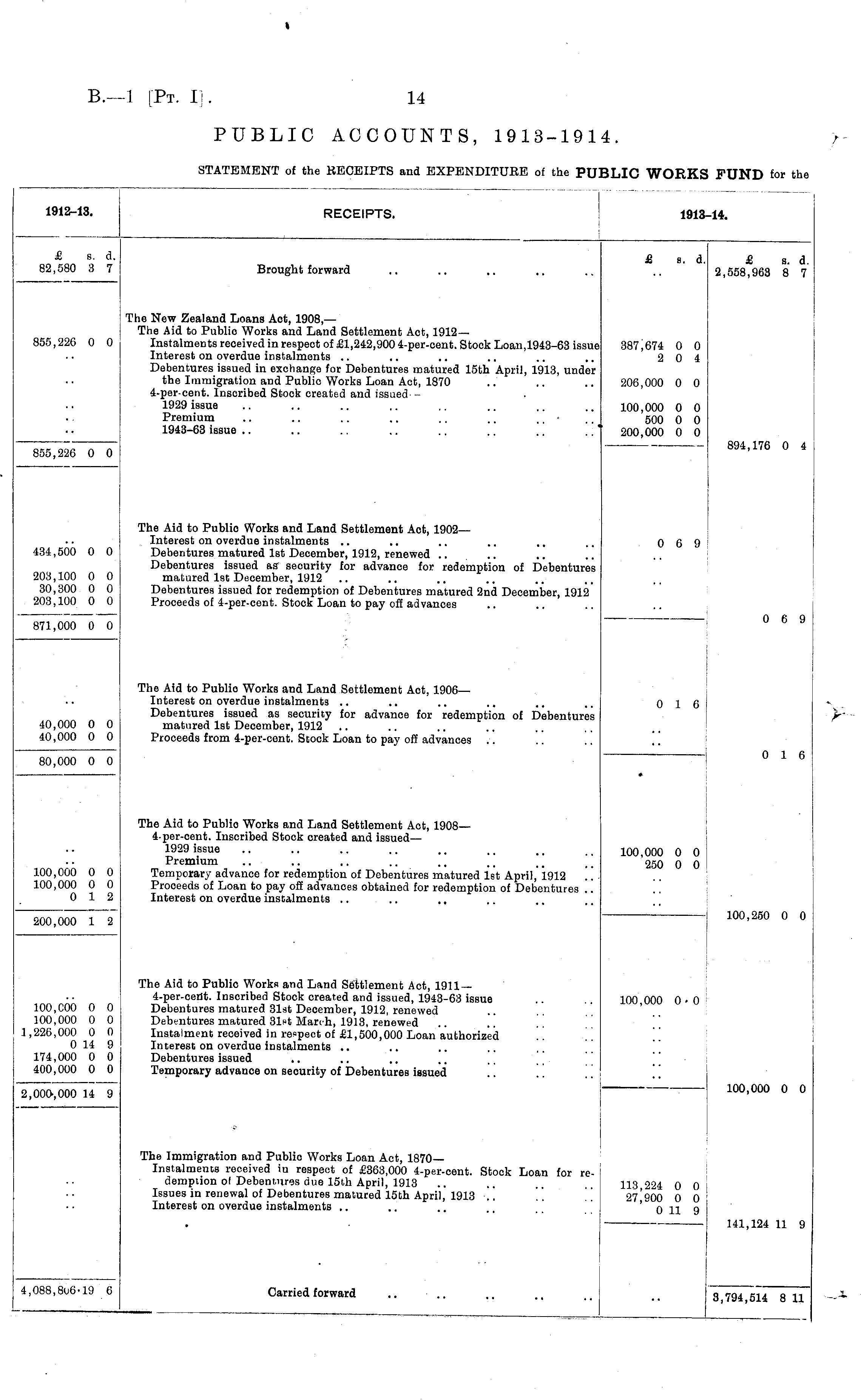 1912-13. RECEIPTS. 1913-14. £ s, d. 82,580 3 7 & b. d. £ s. d. 2,558,963 8 7 Brought forward 855,226 0 0 The New Zealand Loans Act, 1908, — The Aid to Publio Works and Land Settlement Act, 1912— Instalments received in respect of £1,242,900 4-per-cent. Stock Loan,1943-63 issue Interest on overdue instalments Debentures issued in exchange for Debentures matured 15th April, 1913, under the Immigration and Public Works Loan Act, 1870 4-per-cent. Inscribed Stock created and issued--1929 issue Premium 1943-63 issue .. .. .. .. .. .. .'. .]' 387,674 0 0 2 0 4 206,000 0 0 100,000 0 0 500 0 0 200,000 0 0 894,176 0 4 855,226 0 0 434,500 0 0 203,100 0 0 30,300 0 0 203,100 0 0 The Aid to Publio Works and Land Settlement Aot, 1902— Interest on overdue instalments .. Debentures matured 1st December, 1912, renewed Debentures issued as seourity for advance for redemption of Debentures matured 1st December, 1912 Debentures issued for redemption of Debentures matured 2nd December, 1912 Proceeds of 4-per-cent. Stock Loan to pay off advances 0 6 9 871,000 0 0 i 0 6 9 40,000 0 0 40,000 0 0 The Aid to Publio Works and Land Settlement Act, 1906— Interest on overdue instalments .. Debentures issued as security for advance for redemption of Debentures matured 1st December, 1912 Proceeds from 4-per-cent. Stock Loan to pay off advances 0 16 > 80,000 0 0 100,000 0 0 100,000 0 0 0 12 The Aid to Publio Works and Land Settlement Act, 1908— 4-per-cent. Inscribed Stock created and issued— 1929 issue Premium .. .. .. .. .. ,. Temporary advance for redemption of Debentures matured 1st April," 1912 '.'. ■ Prooeeds of Loan to pay off advances obtained for redemption of Debentures .. Interest on overdue instalments 100,000 0 0 250 0 0 I 200,000 1 2 100,250 0 0 100, COO 0 0 100,000 0 0 ,226,000 0 0 0 14 9 174,000 0 0 400,000 0 0 The Aid to Public Works and Land Settlement Aot, 1911 — 4-per-ceflt. Inscribed Stock created and issued, 1943-63 issue Debentures matured 31st December, 1912, renewed Debentures matured 31et March, 1913, renewed Instalment received in respect of £1,500,000 Loan authorized Interest on overdue instalments .. Debentures issued .. Temporary advance on seourity of Debentures issued i 100,000 0 • 0 ,000,000 14 9 : I I 100,000 0 0 100,000 0 0 I The Immigration and Public Works Loan Act, 1870— Instalments received in respect of £363,000 4-per-cent. Stock Loan for redemption of Debentures due 15th April, 1913 Issues in renewal of Debentures matured 15th April, 1913 Interest on overdue instalments .. .. .. [, 113,224 0 0 27,900 0 0 0 11 9 141,124 11 9 ,088,806-19 6 Carried forward .. 3,794,514 8 11