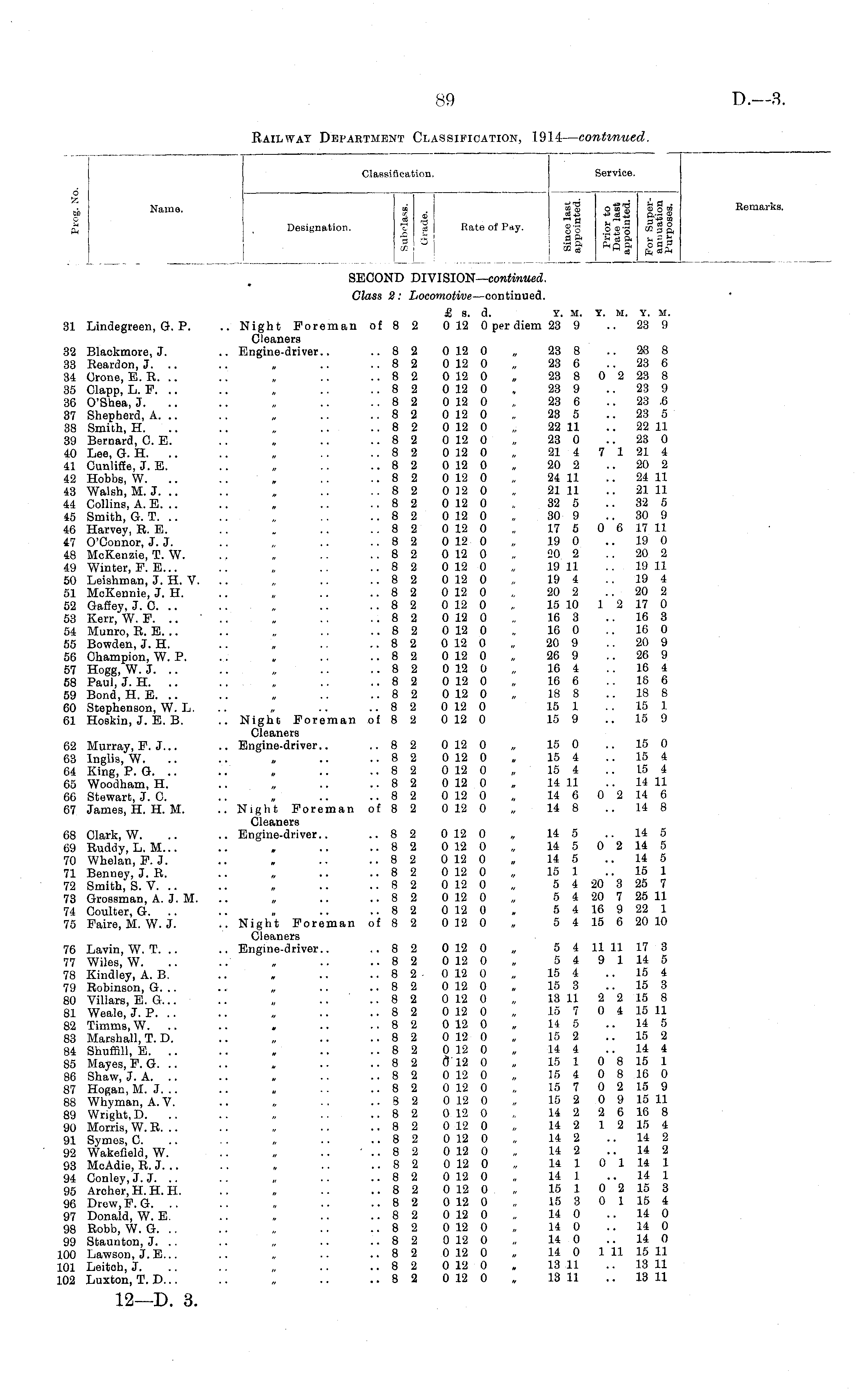 Classification. Service. o ?i Name. 6 eb a! &TJJ O'SV, So" Designation. T Iβ Hate of Pay. g-g g«-g § g 5 art! »> '!<» i = S Eemarks. SECOND DIVISION— continued. ■ ■ ■ ■ %J \=/ .L. 1 .1—' * * _». V -k »■■»«■ 1 \J t VV VI I Class 2: locomotive —continued. 31 Lindegreen, G. P. 32 Blaokmore, J. 33 Eeardon, J. .. 34 Crone, E. E. .. 35 Clapp, L. P. 36 O'Shea, J. 37 Shepherd, A. .. 38 Smith, H. 39 Bernard, C. E. 40 Lee, G. H. 41 Cunlifie, J. E. 42 Hobbs, W. .. 43 Walsh, M. J. 44 Collins, A. E. .. 45 Smith, G. T. 46 Harvey, E. E. 47 O'Connor, J. J. 48 McKenzie, T. W. 49 Winter, I , . E... 50 Leishman, J. H. V. 51 MoKennie, J. H. 52 Gaffey, J. C. 53 Kerr, W. F. .. 54 Munro, E. E. .. 55 Bowden, J. H. 56 Champion, W. P. 57 Hogg, W.J. .. 58 Paul, J. H. 59 Bond, H. E. 60 Stephenson, W. L. 61 Hoskin, J. E. B. 62 Murray, P.J... 63 Inglis, W. 64 King, P. G. 65 Woodham, H. 66 Stewart, J. 0. 67 James, H. H. M. 68 Clark, W. 69 Buddy, L. M... 70 Whelan, P. J. 71 Benney, J. E. 72 Smith, S. V. 73 Grossman, A. J. M. 74 Coulter, G. .. 75 Paire, M. W. J. 76 Lavin, W. T. 77 Wiles, W. 78 Kindley, A. B. 79 Robinson, G. .. 80 Villars, E.G... 81 Weale, J. P. 82 Timms, W. 83 Marshall, T. D. 84 Shuffill, E. .. 85 Mayes, P. G. 86 Shaw, J. A. 87 Hogan, M. J. .. 88 Whyman, A.V. 89 Wright, D. 90 Morris, W. R. 91 Symes, C. 92 Wakefield, W. 93 McAdie, R. J. .. 94 Conley, J.J. 95 Archer, H. H. H. 96 Drew, P. G. 97 Donald, W. E. 98 Eobb, W. G. 99 Staunton, J. .. 100 Lawson, J. E... .01 Leitoh, J. .02 Luxton, T. D... £ S. d. Y. M. Y. M. Y. M. .. Night Foreman of 8 2 0 12 0 per diem 23 9 .. 23 9 Cleaners .. Engine-driver.. ..8 2 0 12 0 „ 23 8 .. 26 8 ..82 0 12 0 „ 23 6 23 6 ..82 0 12 0 „ 23 8 0 2 23 8 ..82 0 12 0 , 23 9 23 9 ..82 0 12 0 „ 23 6 .. 23 .6 ..82 0 12 0 . 23 5 23 5 ..82 0 12 0 „ 22 11 22 11 ..82 0 12 0 „ 23 0 23 0 ..82 0 12 0 „ 21 4 7 1 21 4 ..82 0 12 0 „ 20 2 20 2 ..8 2 0 12 0 „ 24 11 24 11 ..8 2 0 12 0 „ 21 11 21 11 ..82 0 12 0 .. 32 5 .. 32 5 ..8 2 0 12 0 , 30 9 30 9 ..82 0 12 0 „ 17 5 0 6 17 11 ..82 0 12 0 „ 19 0 19 0 ..82 0 12 0 „ 20 2 20 2 ..82 0 12 0 „ 19 11 19 11 ..8 2 0 12 0 „ 19 4 .. 19 4 ..82 0 12 0 „ 20 2 20 2 ..82 0 12 0 „ 15 10 1 2 17 0 ..82 0 12 0 „ 16 3 16 3 ..82 0 12 0 „ 16 0 .. 16 0 ..82 0 12 0 „ 20 9 20 9 ..82 0 12 0 „ 26 9 26 9 ..8 2 0 12 0 „ 16 4 .. 16 4 ..82 0 12 0 „ 16 6 18 6 ..82 0 12 0 „ 18 8 18 8 ..8 2 0 12 0 15 1 15 1 .. Night Foreman of 8 2 0 12 0 15 9 15 9 Cleaners .. Engine-driver.. ..8 2 0 12 0 „ 15 0 .. 15 0 ..82 0 12 0 „ 15 4 .. 15 4 ..8 2 0 12 0 „ 15 4 15 4 ..8 2 0 12 0 „ 14 11 14 11 ..8 2 0 12 0 , 14 6 0 2 14 6 .. Night Foreman of 8 2 0 12 0 „ 14 8 .. 14 8 Cleaners .. Engine-driver.. ..8 2 0 12 0 „ 14 5 .. 14 5 ..82 0120 „ 14 5 0 2 14 5 ..8 2 0 12 0 „ 14 5 14 5 ..8 2 0 12 0 „ 15 1 15 1 ..8 2 0 12 0 „ 5 4 20 3 25 7 ..82 0 12 0 „ 5 4 20 7 25 11 ..82 0 12 0 . 5 4 16 9 22 1 .. Night Foreman of 8 2 0 12 0 „ 5 4 15 6 20 10 Cleaners .. Engine-driver.. ..8 2 0 12 0 „ 5 4 11 11 17 3 ..8 2 0 12 0 „ 5 4 9 1 14 5 .. 8 2 0 12 0 „ 15 4 .. 15 4 ..82 0 12 0 . 15 3 .. 15 3 ..8 2 0 12 0 „ 13 11 2 2 15 8 ..8 2 0 12 0 „ 15 7 0 4 15 11 ..82 0 12 0 „ 14 5 14 5 ..8 2 0 12 0 „ 15 2 15 2 ..8 2 0 12 0 „ 14 4 14 4 ..8 2 0 12 0 „ 15 1 0 8 15 1 ..8 2 0 12 0 „ 15 4 0 8 16 0 ..82 0 12 0 „ 15 7 0 2 15 9 ..8 2 0 12 0 „ 15 2 0 9 15 11 ..8 2 0 12 0 „ 14 2 2 6 16 8 ..82 0 12 0 „ 14 2 1 2 15 4 ..8 2 0 12 0 „ 14 2 14 2 '..82 0 12 0 „ 14 2 .. 14 2 ..8 2 0 12 0 „ 14 1 0 1 14 1 ..82 0120 „ 14 1 14 1 ..8 2 0 12 0 „ 15 1 0 2 15 3 ..82 0 12 0 „ 15 3 0 1 15 4 ..82 0 12 0 „ 14 0 14 0 ..82 0 12 0 „ 14 0 .. 14 0 ..82 0 12 0 „ 14 0 14 0 ..82 0 12 0 „ 14 0 1 11 15 11 ..82 0 12 0 , 13 11 13 11 ..82 0 12 0 „ 13 11 13 11
