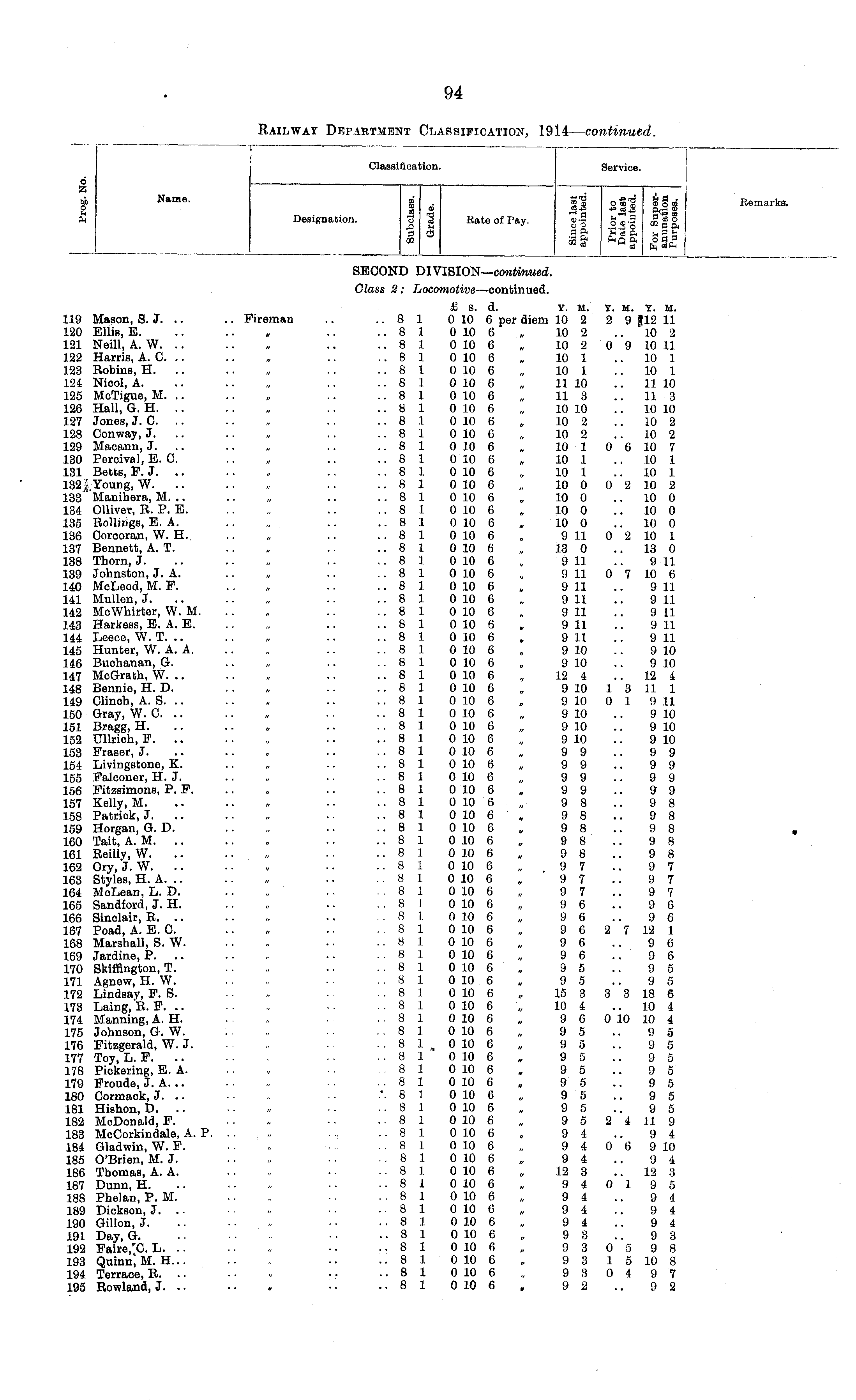 i Classification. Service. 6 Name. 1 Kate of Pay. Sf .22-1 sal Remarks, Designation. SECOND DIVISION— continued. Class 2: Locomotive —continued. 119 Mason, S. J. 120 Ellis, E. 121 Neill, A. W. 122 Harris, A. C. 123 Robins, H. .. 124 Nicol, A. 125 MoTigue, M. .. 126 Hall, G. H. 127 Jones, J. C. 128 Oonway, J. 129 Maoann, J. 130 Peroival, E. C. 131 Betts, F. J. 132 J Young, W. .. 133 Manihera, M. .. 134 Olliver, R. P. E. 135 Rollings, E. A. 136 Corcoran, W. H. 137 Bennett, A. T. 138 Thorn, J. 139 Johnston, J. A. 140 McLeod, M. P. 141 Mullen, J. 142 MoWhirter, W. M. 143 Harkess, E. A. E. 144 Leece, W. T. .. 145 Hunter, W. A. A. 146 Buchanan, G. 147 MoGrath, W. .. 148 Bennie, H. D. 149 Glinoh, A. S. 150 Gray, W. C. 151 Bragg, H. 152 Ullrioh, P. .. 153 Praser, J. 154 Livingstone, K. 155 Falconer, H. J. 156 Fitzsimons, P. P. 157 Kelly, M. 158 Patriok, J. 159 Horgan, G. D. 160 Tait, A. M. 161 Reilly, W. 162 Ory, J. W. 163 Styles, H. A. 164 MoLean, L. D. 165 Sandford, J. H. 166 Sinclair, R. .. 167 Poad, A. E. C. 168 Marshall, S. W. 169 Jardine,P. 170 Skiffington, T. 171 Agnew, H. W. 172 Lindsay, F. S. 173 Laing, R. F. 174 Manning, A. H. 175 Johnson, G. W. 176 Fitzgerald, W. J. 177 Toy, L. F. 178 Pickering, E. A. 179 Froude, J. A. .. 180 Gormack, J. .. 181 Hishon, D. .. 182 MoDonald, F. 183 McCorkindale, A. P. 184 Gladwin, W. F. 185 O'Brien, M. J. 186 Thomas, A. A. 187 Dunn, H. 188 Phelan, P. M. 189 Dickson, J. .. 190 Gillon, J. 191 Day, G. 192 Faire,"O. L. .. 193 Quinn, M. H... 194 Terrace, R. . • 195 Rowland, J. .. .. Fireman & s. d. ¥. m. ..81 0 10 6 per diem 10 2 ..8 1 0 10 6 . 10 2 ..81 0 10 6 „ 10 2 ..8 1 0 10 6 . 10 1 ..81 0 10 6 „ 10 1 ..8 1 0 10 6 „ 11 10 ..8 1 0 10 6 „ 11 3 ..8 1 0 10 6 „ 10 10 ..8 1 0 10 6 „ 10 2 ..81 0 10 6 „ 10 2 ..8 1 0 10 6 „ 10 1 ..81 0 10 6 , 10 1 ..81 0 10 6 „ 10 1 ..81 0 10 6 „ 10 0 ..81 0 10 6 „ 10 0 ..81 0 10 6 „ 10 0 ..8 1 0 10 6 „ 10 0 ..81 0 10 6 „ 9 11 ..8 1 0 10 6 „ 13 0 ..81 0 10 6 „ 9 11 ..81 0 10 6 „ 9 11 ..81 0 10 6 „ 9 11 ..81 0 10 6 „ 9 11 ..8 1 0 10 6 „ 9 11 ..8 1 0 10 6 , 9 11 ..81 0 10 6 „ 9 11 ..8 1 0 10 6 „ 9 10 ..81 0 10 6 „ 9 10 ..81 0 10 6 „ 12 4 ..81 0 10 6 „ 9 10 ..8 1 0 10 6 „ 9 10 ..81 0 10 6 „ 9 10 ..81 0 10 6 „ 9 10 ..8 1 0 10 6 , 9 10 ..8 1 0 10 6 „ 9 9 ..81 0 10 6 , 99 ..81 0 10 6 „ 99 ..8 1 0 10 6 „ 9 9 ..8 1 0 10 6 „ 9 8 ..8 1 0 10 6 , 9 8 ..81 0 10 6 „ 98 ..81 0 10 6 „ 98 ..81 0 10 6 , 98 ..8 1 0 10 6 „ 9 7 ..81 0 10 6 „ 97 ..81 0 10 6 „ 97 ..81 0 10 6 „ 96 ..81 0 10 6 „ 96 ..81 0 10 6 „ 96 ..81 0 10 6 „ 96 .81 0 10 6 „ 96 ..81 0 10 6 „ 95 ..81 0 10 6 , 95 .81 0 10 6 „ 15 3 ..81 0 10 6 „ 10 4 .81 0 10 6 „ 96 .81 0 10 6 „ 95 ..81 0 10 6 „ 95 .. 8 1 0 10 6 „ 9 5 ..81 0 10 6 „ 95 .81 0 10 6 „ 95 .'.8 1 0 10 6 „ 9 5 ..81 0 10 6 „ 95 ..81 0 10 6 „ 95 ..81 0 10 6 , 94 ..81 0 10 6 „ 94 .81 0 10 6 „ 94 ..81 0 10 6 „ 12 3 ..81 0 10 6 „ 94 ..81 0 10 6 „ 94 .81 0 10 6 „ 94 ..81 0 10 6 „ 94 ..81 0 10 6 „ 93 ..81 0 10 6 . 93 ..81 0 10 6 , 93 ..8 1 0 10 6 „ 9 3 ..8 1 0 10 6 . 9 2 r. M. y. m. 2 9 |12 11 10 2 0 9 10 11 .. 10 1 10 I 11 10 .. 11 3 10 10 10 2 .. 10 2 0 6 10 7 10 1 10 1 0 2 10 2 .. 10 0 10 0 .. 10 0 0 2 10 1 13 0 .. 9 11 0 7 10 6 9 11 9 11 9 11 9 11 9 11 9 10 9 10 12 4 1 3 11 1 0 1 9 11 9 10 9 10 9 10 9 9 9 9 9 9 9 9 9 8 9 8 9 8 9 8 9 8 9 7 9 7 9 7 9 6 9 6 2 7 12 1 9 6 9 6 9 5 9 5 3 3 18 6 10 4 0 10 10 4 9 5 9 5 9 5 9 5 9 5 9 5 9 5 2 4 11 9 9 4 0 6 9 10 9 4 .. 12 3 0 19 5 9 4 9 4 9 4 9 3 0 5 9 8 1 5 10 8 0 4 9 7 9 2 •