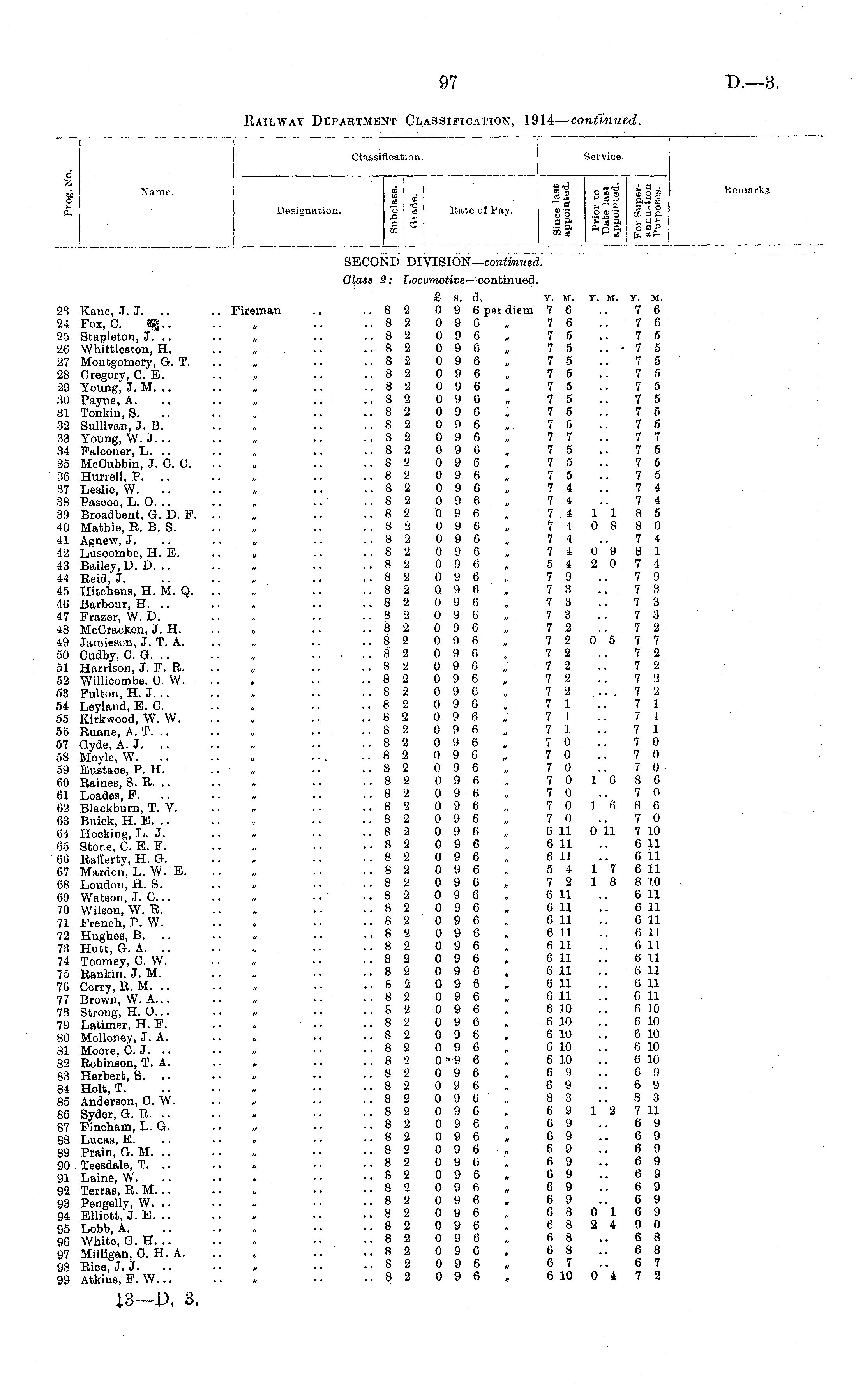 Classification. Service. V f ti, Name. o 6 f t £ Designation. "3 <e liate of Pay. gg 11 "- a So c ft sti III Sj~ O 3 x o o ® o -j: p a H as s^ sit .S3 O Remarks SECOND DIVISION— continued. Class 2: Locomotive —continued. 23 Kane, J. J. .. 24 Fox, 0. S^.. 25 Stapleton, J. .. 26 Whittleston, H. 27 Montgomery, G. T. 28 Gregory, 0. E. 29 Young, J. M. .. 30 Payne, A. 31 Tonkin, S. 32 Sullivan, J. B. 33 Young, W. J. .. 34 Falconer, L. .. 35 MoCubbin, J. 0. 0. 36 Hurrell, P. .. 37 Leslie, W. 38 Pasooe, L. O. .. 39 Broadbent, G. D. F. 40 Mathie, R. B. S. 41 Agnew, J. 42 Luscombe, H. E. 43 Bailey, D. D. .. 44 Reid, J. 45 Hitohens, H. M. Q. 46 Barbour, H. .. 47 Frazer, W. D. 48 McCracken, J. H. 49 Jamieaon, J. T. A. 50 Oudby, C. G. 51 Harrison, J. F. R. 52 WillicoDibe, 0. W. 53 Pulton, H.J... 54 Leyland, E. C. 55 Kirkwood, W. W. 56 Ruane, A. T. .. 57 Gyde, A. J. 58 Moyle, W. .. 59 Eustace, P. H. 60 Raines, S. R. 61 Loades, F. 62 Blackburn, T. V. 63 Buick, H. E. 64 Hocking, L. J. 65 Stone, C. E. F. 66 Rafferty, H. G. 67 Mardon, L. W. E. 68 Loudon, H. S. 69 Watson, J. 0... 70 Wilson, W. R. 71 French, P. W. 72 Hughes, B. .. 73 Hutt, G. A. 74 Toomey, G. W. 75 Rankin, J. M. 76 Corry, R. M. 77 Brown, W. A... 78 Strong, H. 0... 79 Latimer, H. F. 80 Molloney, J. A. 81 Moore, C. J. 82 Robinson, T. A. 83 Herbert, S. .. 84 Holt, T. 85 Anderson, 0. W. 86 Syder, G. R. 87 Fincham, L. G. 88 Lucas, E. 89 Prain, G. M. 90 Teesdale, T. .. 91 Laine, W. 92 Terras, R. M. .. 93 Pengelly, W. .. 94 Elliott, J. E. .. 95 Lobb, A. 96 White, G. H. .. 97 Milligan, C. H. A. 98 Rice, J. J. 99 Atkins, F. W... £ s. d. y. m. .. Fireman .. ..8 2 0 9 6 per diem 7 6 ..82096, 76 ..82096, 75 ..82096,, 75 .. 8 2 0 9 6 7 5 ..82 096 „ 75 ..82 096, 75 ..8 2 0 9 6 „ 7 5 ..82 096,, 75 ..82096,, 75 ..82096, 77 ..82 096 „ 75 ..82 096, 75 ..82096, 75 ..8 2 0 9 6 „ 7 4 ..82096,, 74 ..82 096 , 74 ..82096,, 74 ..82096,, 74 ..„ .. ..82 096 „ 74 ..82 096 „ 54 ..82096,, 79 ..82 096, 73 ..82096,, 73 ..82 096 „ 73 ..82096,, 72 ..82 096 „ 72 ....82 096 „ 72 ..82096,, 72 ..82096, 72 ..82096, 72 ..82 096, 71 ..82096, 71 ..82096, 71 ..82 096, 70 ..8 2 0 9 6 „ 7 0 ..82096,, 70 ..82096,, 70 ..82 096,, 70 ..82096,, 70 ..82096, 70 ..82096,, 6 11 ..8 2 0 9 6 „ 6 11 ..82096, 6 11 ..82096,, 54 ..82096, 72 ..82096,, 6 11 ..8 2 0 9 6 „ 6 11 ..82096 „ 6 11 ..82 096 . 6 11 ..82 096 „ 6 11 ..8 2 0 9 6 „ 6 11 ..82 096 . 6 11 ..82096, 6 11 ..82 096 „ 6 11 ..82 096 „ 6 10 ..82096, 6 10 ..82 096 , 6 10 ..82096, 6 10 ..8 2 0 '9 6 6 10 ..82096,, 69 ..82 096 „ 69 ..82 096 „ 83 ..82096,, 69 ..82096, 69 ..82 096, 69 ..82 096-,, 69 ..82 096, 69 ..82 096 , 69 ..82 096 „ 69 ..82 096 , 69 ..82 096 „ 68 ..82 096 „ 68 ..82096,, 68 ..82 096, 68 ..82 096, 67 ..82 096 , 6 10 T. M. Y. M. 7 6 7 6 7 5 ..-75 7 5 7 5 7 5 7 5 7 5 7 5 7 7 7 5 7 5 7 5 7 4 7 4 118 5 0 8 8 0 7 4 0 9 8 1 2 0 7 4 7 9 7 3 7 3 7 3 7 2 0 5 7 7 7 2 7 2 7 2 ... 7 2 7 1 7 1 7 1 7 0 7 0 7 0 16 8 6 7 0 16 8 6 7 0 0 11 7 10 6 11 6 11 17 6 11 18 8 10 6 11 6 11 6 11 6 11 6 11 6 11 6 11 6 11 6 11 6 10 6 10 6 10 6 10 6 10 6 9 6 9 8 3 12 7 11 6 9 6 9 6 9 6 9 6 9 6 9 6 9 0 16 9 2 4 9 0 6 8 6 8 6 7 0 4 7 2