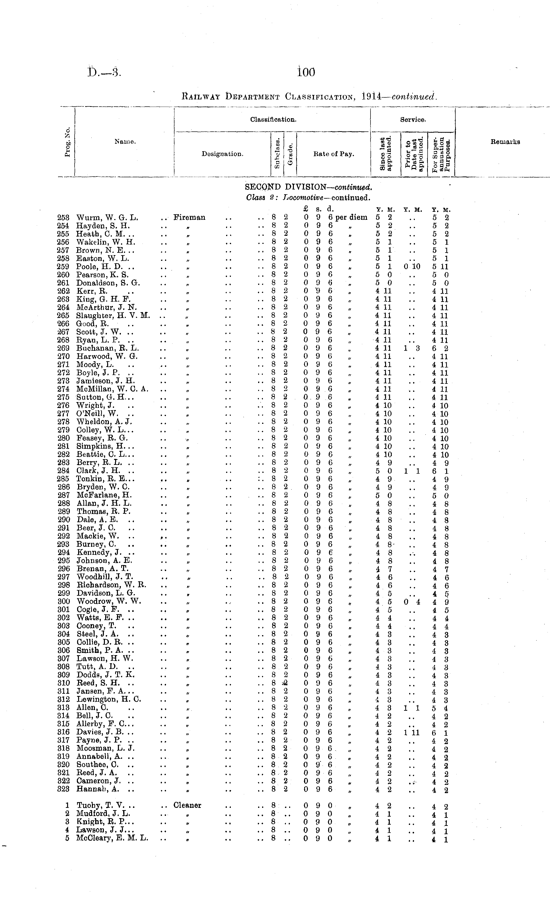 Classification, Service. Classification. Service. d ft qc Name. o a ft o Name. Desi, j i Designation. ignatior n. Kate of Pay. g~ g«| — 13 t> O IT. Kate of Pay. it $ii S° SS'S a a t> « a 35 S , , III s a o Ill s a o o a a Remarks I ! & ° II *a| o a a SECOND DIVISION— continued. Class 2: Locomotive —continued. 253 Wurm, W. G. L. 254 Hayden, S. H. 255 Heath, CM... 256 Wakelin, W. H. 257 Brown, N. E. .. 258 Easton, W. L. 259 Poole, H. D. 260 Pearson, K. S. 261 Donaldson, S. G. 262 Kerr, R. 263 King, G. H. F. 264 McArfchur, J. N. 265 Slaughter, H. V. M. 266 Good, B. 267 Scott, J. W. 268 Ryan, L. P. 269 Buchanan, R. L. 270 Harwood, W. G. 271 Moody, L. 272 Boyle, J. P. 273 Jamieson, J. H. 274 McMillan, W. G. A. 275 Sutton, G. H... 276 Wright, J. .. 277 O'Neill, W. .. 278 Wheldon, A. J. 279 Colley, W. L... 280 Feasey, R. G. 281 Simpkins, H. .. 282 Beattie, C. L... 283 Berry, R. L. 284 Clark, J. H. .. 285 Tonkin, R. E... 286 Bryden, W. 0. 287 McFarlane, H. 288 Allan, J. H. L. 289 Thomas, R. P. 290 Dale, A. E. 291 Beer, J. C. 292 Mackie, W. .. 293 Burney, 0. .. 294 Kennedy, J. .. 295 Johnson, A. E. 296 Brenan, A. T. 297 Woodhill, J. T. 298 Richardson, W. R. 299 Davidson, L. G. 300 Woodrow, W. W. 301 Cogle, J. F. 302 Watts, E. F. 303 Cooney,T. .. 304 Steel, J. A. 305 Collie, D. R. 306 Smith, P. A. 307 Lawson, H. W. 308 Tutt, A. D. 309 Dodds, J. T. K. 310 Reed, S. H. .. 311 Jansen, F. A. .. 312 Lewington, H. 0. 313 Allen, C. 314 Bell, 3.0. 315 Allerby, F. C... 316 Davies, J. B. .. 317 Payne, J. P. 318 Moosman, L. J. 319 Annabell, A. .. 320 Southee, C. .. 321 Reed, J. A. .. 322 Cameron, J. .. 323 Hannah, A. .. .. Fireman £ s. d. y. m. y. M. ..82 0 9 6 per diem 52 ..8 2 0 9 6 „ 5 2 ..82 096 , 52 ..82 096 „ 51 ..82 096 » 51 ..82 096 „ 51 ..82 096 „ 510 10 ..8 2 0 9 6 „ 5 0 ..8 2 0 9 0 „ 5 0 ..82 096 „ 4 11 ..8 2 0 9 6 „ 4 11 ..8 2 0 9 6 „ 4 11 ..82 096 „ 4 11 ..8 2 0 9 6 „ 4 11 ..8 2 0 9 6 , 4 11 ..8 2 0 9 6 „ i 11 ..82 096 „ 4 11 13 ..82 096 „ 4 11 ..82 096 „ 411 ..82 096 „ 4 11 ..8 2 0 9 6 „ 4 11 ..82 096 , 4 11 ..82 096 „ 4 11 ..8 2 0 9 6 . 4 10 ..82 096 „ 4 10 ..82 096 „ 4 10 ..8 2 0 9 6 „ 4 10 ..82 096 „ 4 10 ..8 2 0 9 6 „ 4 10 ..8 2 0 9 6 „ 4 10 ..82 096 „ 49 ..82 09 6 „ 50 11 :. 8 2 096 „ 49 ..82096 , 49 ... 8 2 0 9 6 „ 5 0 ..82 096 „ 48 ..82 096 „ 48 ..82 096 „ 48 ..82 096 „ 48 ..8 2 0 9 6 „ 4 8 ..82 096 „ 48..8 2 0 9 6 „ 4 8 ..82 096 „ 48 ..82 096 , 47 ..82 096 „ 46 ..82 096 „ 46 ..82 096 , 45 ..82 096 „ 45 04 ..8 2 0 9 6 „ 4 5 ..82 096 , 44 ..82 096 „ 44 ..8 2 0 9 6 „ 4 3 ..82 096 „ 43 ..82 096 „ 43 ..82 096 „ 43 ..82 096 „ 43 ..82 096 „ 43 .. 8 .-2 0 9 6 „ 4 3 ..8 2 0 9 6 . 4 3 ..82 096 „ 4 3 ..8 2 0 9 6 „ 4 3 11 ..82 096 „ 42 ..82 096 „ 42 ..8 2 0 9 6 „ 4 2 1 11 ..8 2 0 9 6 „ 4 2 ..82 096 „ 42 ..82 096 „ 42 ..82 096 „ 42 ..82 096 , 42 ..8 2 0 9 6 , 4 2 ..8 2 0 9 6 „ 4 2 Y. M. 5 2 5 2 5 2 5 1 5 1 5 1 5 11 5 0 5 0 4 11 4 11 4 11 4 11 4 11 4 11 4 11 6 2 4 11 4 11 4 11 4 11 4 11 4 11 4 10 4 10 4 10 4 10 4 10 4 10 4 10 4 9 6 1 4 9 4 9 5 0 4 8 4 8 4 8 4 8 4 8 4 8 4 8 4 8 4 7 4 6 4 6 4 5 4 9 4 5 4 4 4 4 4 3 4 3 4 3 4 3 4 3 4 3 4 3 4 3 4 3 5 4 4 2 4 2 6 1 4 2 4 2 4 2 4 2 4 2 4 2 4 2 1 Tuohy, T. V. 2 Mudford, J. L. 3 Knight, R. P... 4 Lawson, J. J.. . 5 McCleary, E. M. L. .. Cleaner .. 8 .. 0 9 0 , 4 2 ..8.. 090 „ 41 ..8.. 090 „ 41 ..8.. 090 „ 41 ..8.. 090 „ 41 4 2 4 1 4 1 4 1 i 1