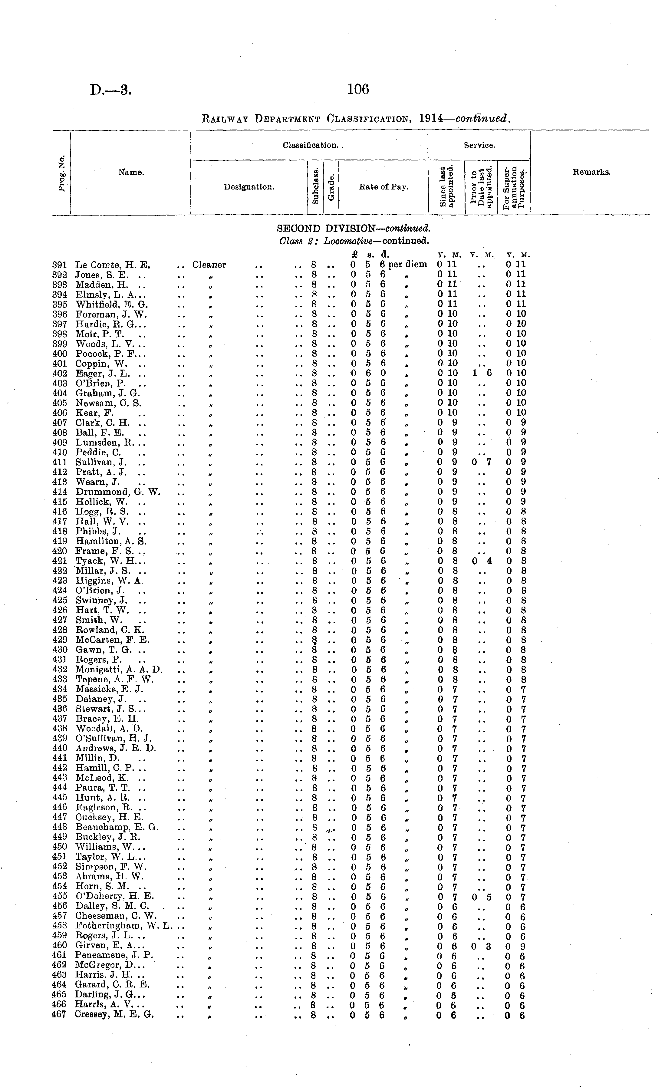 Classification. . Service. 6 Name. Designation. i » M S Bate of Pay. " a 8 8. 05 ci SH Cg M( t, fl Remarks. SECOND DIVISION— continued. Class 3: Locomotive— continued. 391 Le Oomte, H. E. .. Cleaner 392 Jones, S. E. .. 393 Madden, H. .. 394 Elmsly, L. A... 395 Whitfield, K. G. 396 Foreman, J. W. 397 Hardie, R. G... 398 Moir, P. T. .. 399 Woods, L. V. .. 400 Pocock, P. F... 401 Coppin, W. .. 402 Eager, J. L. .. 403 O'Brien, P. .. 404 Graham, J. G. 405 Newsam, C. S. 406 Kear, P. 407 Clark, C. H. .. 408 Ball, F. E. .. 409 Lumsden, R. .. 410 Peddie, C. .. 411 Sullivan, J. .. 412 Pratt, A. J. .. 413 Wearn, J. 414 Drummond, G. W. 415 Hollick, W. .. 416 Hogg, R. S. .. 417 Hall, W. V. .. 418 Phibbs, J. 419 Hamilton, A. S. 420 Frame, F. S. .. 421 Tyack, W. H... 422 Millar, J. S. .. 423 Higgins, W. A. 424 O'Brien, J. 425 Swinney, J. .. .. „ 426 Hart, T. W. .. 427 Smith, W. .. 428 Rowland, C. K. 429 McCarten, F. E. 430 Gawn, T. G. .. 431 Rogers, P. 432 Monigatti, A. A. D. 433 Tepene, A. F. W. 434 Massicks, E. J. .. „ 435 Delaney, J. .. 436 Stewart, J. S... 437 Braoey, E. H. 438 Woodall, A. D. 439 O'Sullivan, H. J. 440 Andrews, J. R. D. 441 Millin, D. 442 Hamill, C. P. .. 443 McLeod, K. .. 444 Paura, T. T. .. 445 Hunt, A. R. .. 446 Eagleson, R. .. 447 Cuoksey, H. E. 448 Beauchamp, E. G. 449 Buckley, J. R. 450 Williams, W. .. 451 Taylor, W. L... 452 Simpson, F. W. 453 AbramB, H. W. 454 Horn, S. M. .. 455 O'Doherty, H. E. 456 Dalley, S. M. 0. 457 Cheeseman, C. W. 458 Fotheringham, W. L. .. 459 Rogers, J. L. .. 460 Girven, E. A... 461 Peneamene, J. P. .. „ 462 McGregor, D... 463 Harris, J. H. .. 464 Garard, C. R, E. .. „ . 465 Darling, J. G... 466 Harris, A. V. .. 467 Cressey, M. E. G. £ b. d. y. m. y. m. .. 8 .. 0 5 6 per diem 0 11 ..8.. 056 . 011 ..8.. 056 » 011 ..8.. 056 „ 011 .. 8 .. 0 5 6 „ 0 11 ..8.. 056 , 010 .. 8 .. 0 5 6 „ 0 10 ..8.. 056 , 010 .. 8 .. 0 5 6 „ 0 10 .,8.. 056 „ 010 ..8.. 056 » 010 ..8.. 060 . 010 16 .. 8 .. 0 5 6 , 0 10 .. 8 .. 056 „ 0 10 ..8.. 056 „ 010 .. 8 .. 0 5 6 , 0 10 .. 8 .. 0 5 6 „ 0 9 ..8.. 056 „ 09 .. 8 .. 0 5 6 . 0 9 .. 8 .. 0 5 6 » 0 9 .. 8 .. 0 5 6 , 0907 .. 8 .. 0 5 6 „ 0 9 .. 8 .. 0 5 6 , 0 9 ..8.. 056 „ 09 ..8.. 056 „ 09 .. 8 .. 0 5 6 , 0 8 .. 8 .. 0 5 6 , 0 8 .. 8 .. 0 5 6 . 0 8 ..8.. 056 „ 08 ..8.. 056 . 08 ..8.. 056 „ 0804 .. 8 .. 0 5 6 „ 0 8 .. 8 .. 0 5 6 • . 0 8 .. 8 .. 0 5 6 . 0 8 ..8.. 056 „ 08 ..8.. 056 „ 08 .. 8 .. 0 5 6 , 0 8 .. 8 .. 0 5 6 » 0 8 .. 8 .. 056 , 08 ..8.. 056 „ 08 ..8.. 056 „ 08 .. 8 .. 0 5 6 „ 0 8 .. 8 .. 0 5 6 „ 0 8 ..8.. 056 „ 07 ..8.. 056 , 07 ..8.. 056 , 07 .. 8 .. 0 5 6 „ 0 7 ..8.. 056 ,, 07 ..8.. 056 „ 07 .. 8 .. 0 5 6 , 0 7 ..8.. 056 „ 07 ..8.. 056 „ 07 ..8.. 056 „ 07 .. 8 .. 0 5 6 „ 0 7 .. 8 .. 0 5 6 , 0 7 ..8.. 056 „ 07 .. 8 .. 056 , 07 .. 8 .,. 0 5 6 „ 0 7 .. 8 .. 0 5 6 . 0 7 ..' 8 .. 056 „ 07 ..8.. 056 „ 07 ..8.. 056 „ 07 ..8.. 056 „ 07 ..8.. 056 „ 07 .. 8 .. 0 5 6 . 0705 .. 8 .. 0 5 6 , 0 6 ..8.. 056 „ 06 .. 8 .. 0 5 6 . 0 6 .. 8 .. 0 5 6 , 0 6 .. 8 .. 056 „ 06 03 .. 8 .. 0 5 6 . 0 6 ..8.. 056 „ 06 .. 8 .. 0 5 6 , 0 6 ..8.. 056 „ 06 .. 8 .. 0 5 6 . 0 6 .. 8 .. 0 5 6 . 0 6 .. 8 .. 0 5 6 „ 0 6 Y. M. 0 11 0 11 0 11 0 11 0 11 0 10 0 10 0 10 0 10 0 10 0 10 0 10 0 10 0 10 0 10 0 10 0 9 0 9 0 9 0 9 0 9 0 9 0 9 0 9 0 9 0 8 0 8 0 8 0 8 0 8 0 8 0 8 0 8 0 8 0 8 0 8 0 8 0 8 0 8 0 8 0 8 0 8 0 8 0 7 0 7 0 7 0 7 0 7 0 7 0 7 0 7 0 7 0 7 0 7 0 7 0 7 0 7 0 7 0 7 0 7 0 7 0 7 0 7 0 7 0 7 0 6 0 6 0 6 0 6 0 9 0 6 0 6 0 6 0 6 0 6 0 6 0 6