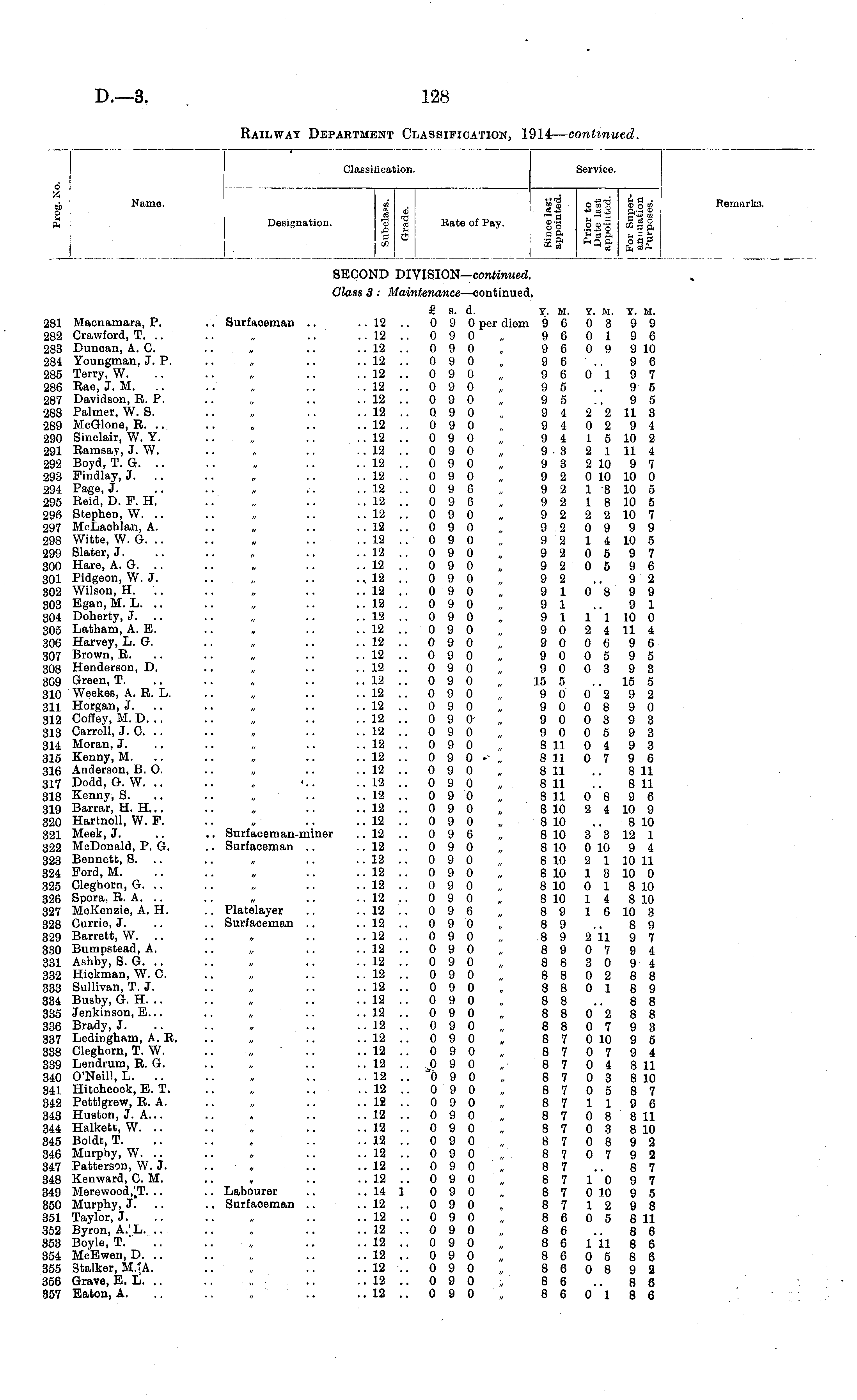 Classification. Service. ai Name. p Pμ c V. O Name. • mm a • S^ Designation. *o & Kate of Pay. **g o 5 .2 g [ I if isi I si °°1b, Remarks. SECOND DIVISION— continued. « Class 3 : Maintenance —continued. 281 Maenamara, P. 282 Crawford, T. .. 283 Duncan, A. C. 284 Yotmgman, J. P. 285 Terry, W. 286 Rae, J. M. 287 Davidson, R. P. 288 Palmer, W. S. 289 McGlone, B. .. 290 Sinclair, W. Y. 291 Ramsav, J. W. 292 Boyd,T. G. .. 293 Findlay, J. 294 Page, J. 295 Beid, D. F. H. 296 Stephen, W. .. 297 McLaohlan, A. 298 Witte, W. G. 299 Slater, J. 300 Hare, A. G. 301 Pidgeon, W. J. 302 Wilson, H. 303 Egan,M. L. .. 304 Doherty, J. .. 305 Latham, A. E. 306 Harvey, L. G. 307 Brown, E. 308 Henderson, D. 309 Green, T. 310 Weekes, A. R. L. 311 Horgan, J. .. 312 Cofiey, M. D. .. 313 Carroll, J. C. 314 Moran, J. 313 Kenny, M. 316 Anderson, B. O. 317 Dodd, G. W. .. 318 Kenny, S. 319 Barrar, H. H... 320 Hartnoll, W. F. 321 Meek, J. 322 McDonald, P. G. 323 Bennett, S. 324 Ford, M. 325 Cleghorn, G. .. 326 Spora, R. A. 327 MoKenzie, A. H. 328 Currie, J. 329 Barrett, W. .. 330 Bumpstead, A. 331 Ashby, S. G. 332 Hickman, W. C. 333 Sullivan, T. J. 334 Bueby, G. H. .. 335 Jenkinson, E... 336 Brady, J. 337 Ledingham, A. B. 338 Cleghorn, T. W. 339 Lendrum, R. G. 340 O'Neill, L. 341 Hitchcock, E. T. 342 Pettigrew, E. A. 343 Huston, J. A... 344 Halkett, W. .. 345 Boldt, T. 346 Murphy, W. .. 347 Patterson, W. J. 348 Kenward, C. M. 349 Merewood.'.T. .. 350 Murphy, J. 351 Taylor, J. 352 Byron, A.'L. .. 353 Boyle, T.' 354 McEwen, D. .. 355 Stalker, M.?A. 356 Grave, E. L. 357 Eaton, A. £ s. d. y. m. .. Surfaceman .. .. 12 .. 0 9 0 per diem 9 6 .. 12 .. 0 9 0 „ 9 6 .. 12 .. 0 9 0 „ 9 6 .. 12 .. 0 9 0 „ 9 6 .. 12 .. 0 9 0 , 9 6 .. 12 .. 0 9 0 „ 9 5 .. 12 .. 0 9 0 „ 9 5 .. 12 .. 0 9 0 „ 9 4 .. 12 .. 0 9 0 „ 9 4 .. 12 .. 0 9 0 „ 9 4 .. 12 .. 0 9 0 „ 9-3 .. 12 .. 0 9 0 „ 9 3 .. 12 .. 0 9 0 „ 9 2 .. 12 .. 0 9 6 „ 9 2 .. 12 .. 0 9 6 „ 9 2 .. 12 .. 0 9 0 „ 9 2 .. 12 .. 0 9 0 „ 9 2 .. 12 .. 0 9 0 „ 9 2 .. 12 .. 0 9 0 , 9 2 .. 12 .. 0 9 0 „ 9 2 . „ 12 .. 0 9 0 „ 9 2 .. 12 .. 0 9 0 „ 9 1 .. 12 .. 0 9 0 „ 9 1 .. 12 .. 0 9 0 „ 9 1 .. 12 .. 0 9 0 „ 9 0 .. 12 .. 0 9 0 „ 9 0 .. 12 .. 0 9 0 „ 9 0 .. 12 .. 0 9 0 „ 9 0 .. 12 .. 0 9 0 „ 15 5 .. 12 .. 0 9 0 „ 9 0 .. 12 .. 0 9 0 , 9 0 .. 12 .. 0 9 & „ 9 0 .. 12 .. 0 9 0 „ 9 0 .. 12 .. 0 9 0 „ 8 11 .. 12 .. 0 9 0 *■ „ 8 11 .. 12 .. 0 9 0 „ 8 11 .. 12 .. 0 9 0 „ 8 11 .. 12 .. 0 9 0 , 8 11 .. 12 .. 0 9 0 „ 8 10 .. 12 .. 0 9 0 „ 8 10 .. Surfaceman-miner .. 12 .. 0 9 6 „ 8 10 .. Surfaceman .. .. 12 .. 0 9 0 „ 8 10 .. 12 .. 0 9 0 „ 8 10 .. 12 .. 0 9 0 „ 8 10 .. 12 .. 0 9 0 „ 8 10 .. 12 .. 0 9 0 , 8 10 .. Platelayer .. .. 12 .. 0 9 6 „ 8 9 .. Surfaceman .. .. 12 .. 0 9 0 „ 8 9 .. 12 .. 0 9 0 „ 8 9 .. 12 .. 0 9 0 „ 8 9 .. 12 .. 0 9 0 „ 8 8 .. 12 .. 0 9 0 „ 8 8 .. 12 .. 0 9 0 „ 8 8 .. 12 .. 0 9 0 „ 8 8 .. 12 .. 0 9 0 , 8 8 .. 12 .. 0 9 0 „ 8 8 .. 12 .. 0 9 0 , 8 7 .. 12 .. 0 9 0 „ 8 7 .. 12 .. 0 9 0 „ 8 7 .. 12 .. "6 9 0 „ 8 7 .. 12 .. 0 9 0 , 8 7 .. 12 .. 0 9 0 „ 8 7 .. 12 .. 0 9 0 . 8 7 .. 12 .. 0 9 0 „ 8 7 .. 12 .. 0 9 0 „ 8 7 .. 12 .. 0 9 0 , 8 7 .. 12 .. 0 9 0 „ 8 7 .. 12 .. 0 9 0 „ 8 7 .. Labourer .. .. 14 1 0 9 0 „ 8 7 .. Surfaoeman .. ..12.. 090 , 87 .. 12 .. 0 9 0 „ 8 6 .. 12 .. 0 9 0 „ 8 6 .. 12 .. 0 9 0 „ 8 6 .. 12 .. 0 9 0 „ 8 6 .. 12 .. 0 9 0 „ 8 6 .. 12 .. 0 9 0 „ 8 6 .. 12 .. 0 9 0 „ 8 6 Y. M. Y. M. 0 3 9 9 0 19 6 0 9 9 10 9 6 0 19 7 9 5 9 5 2 2 11 3 0 2 9 4 1 5 10 2 2 1 11 4 2 10 9 7 0 10 10 0 1 3 10 5 1 8 10 5 2 2 10 7 0 9 9 9 1 4 10 5 0 5 9 7 0 5 9 6 9 2 0 8 9 9 9 1 1 1 10 0 2 4 11 4 0 6 9 6 0 5 9 5 0 3 9 3 .. 15 5 0 2 9 2 0 8 9 0 0 3 9 3 0 5 9 3 0 4 9 3 0 7 9 6 8 11 8 11 0 8 9 6 2 4 10 9 8 10 3 3 12 1 0 10 9 4 2 1 10 11 1 3 10 0 0 1 8 10 14 8 10 1 6 10 3 8 9 2 11 9 7 0 7 9 4 3 0 9 4 0 2 8 8 0 18 9 8 8 0 2 8 8 0 7 9 3 0 10 9 5 0 7 9 4 0 4 8 11 0 3 8 10 0 5 8 7 119 6 0 8 8 11 0 3 8 10 0 8 9 2 0 7 9 2 8 7 10 9 7 0 10 9 5 12 9 8 0 5 8 11 8 6 1 11 8 6 0 5 8 6 0 8 9 2 8 6 0 18 6