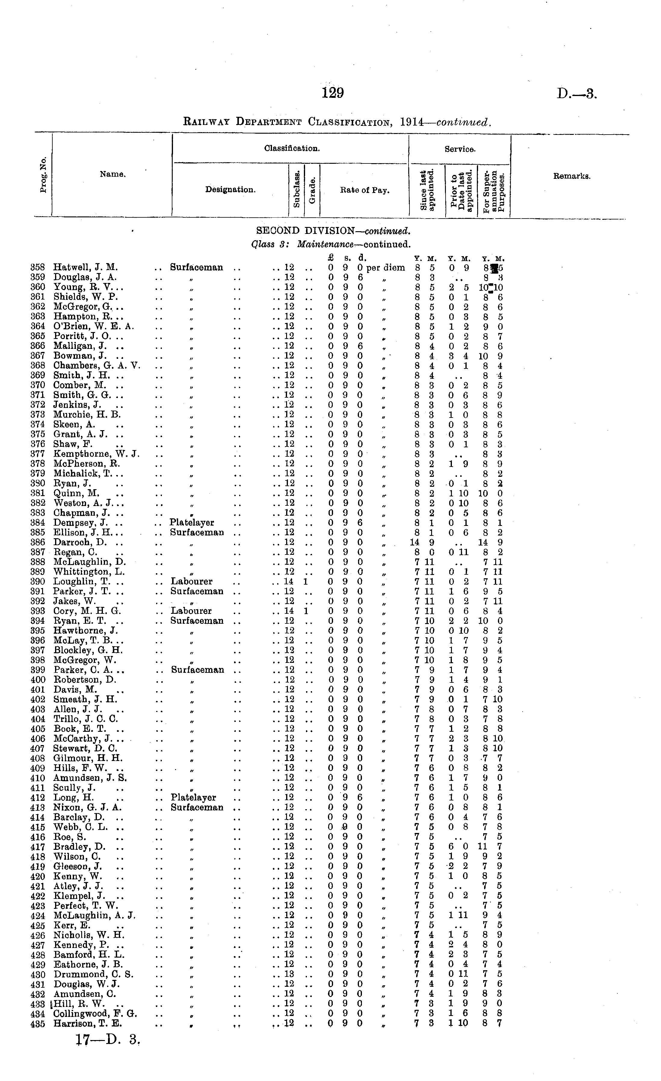 Classification. Service. S, Name. Designation. 3 4 & ° Kate of Pay. I? S P Hi So ,25'o m»ft j= a ntS a § a 3 Remarks. SECOND DIVISION— continued. Qlass 3: Maintenance —continued. 158 Hatwell, J. M. 559 Douglas, J. A. 560 Young, R. V... 561 Shields, W. P. 562 McGregor, G. .. 563 Hampton, R. .. 564 O'Brien, W. E. A. 565 Porritt, J. 0. 566 Malligan, J. .. 567 Bowman, J. .. 568 Chambers, G. A. V. 569 Smith, J. H. .. !70 Comber, M. .. 571 Smith, G. G. .. 572 Jenkins, J. 573 Murohie, H. B. 574 Skeen, A. 575 Grant, A. J. 576 Shaw, F. 577 Kempthorne, W. J. 578 McPherson, R. 579 Miohaliok, T. .. 5S0 Ryan, J. 581 Quinn, M. 582 Weston, A. J. .. 583 Chapman, J. .. 584 Dempsey, J. .. 585 Ellison, J. H... 586 Darrooh, D. .. 587 Regan, C. 588 MoLaughlin, D. 589 Whittington, L. 590 Loughlin, T. .. 591 Parker, J. T. .. (92 Jakes, W. 593 Cory, M. H. G. 594 Ryan, B. T. 595 Hawthorne, J. 596 MoLay, T. B. .. 597 Blookley, G. H. 598 McGregor, W. !99 Parker, C. A. .. LOO Robertson, D. 101 Davis, M. 102 Smeath, J. H. 103 Allen, J. J. .. L04 Trillo, J. C. C. L05 Bock, E. T. .. 106 McCarthy, J. .. 107 Stewart, D. C. 108 Gilmour, H. H. 109 Hills, F. W. 110 Amundsen, J. S. HI Scully, J. [12 Long, H. H3 Nixon, G. J. A. U4 Barclay, D. .. U5 Webb, C. L. .. U6 Roe, S. [17 Bradley, D. .. [18 Wilson, C. U9 Gleeson, J. 120 Kenny, W. .. 121 Atley, J. J. .. 122 Klempel, J. .. 123 Perfect, T. W. t24 McLaughlin, A. J. 125 Kerr, E. 126 Nioholls, W. H. 127 Kennedy, P. .. L28 Bamford, H. L. 129 Eatborne, J. B. 130 Drummond, C. S. 131 Douglas, W. J. 132 Amundsen, C. 133 SHill, R. W. .. 134 Collingwood, F. G. 135 Harrison, T. E. .. Surfaceman .. .. Platelayer .. Surfaceman .. .. Labourer .. Surfaceman .. .. Labourer .. Surfaceman .. .. Surfaceman .. . . Platelayer .. Surfaceman .. • • u • • * • * f T £ s. d. y. m. .. 12 .. 0 9 0 per diem 8 5 .. 12 .. 0 9 6 „ 8 3 .. 12 .. 0 9 0 „ 8 5 .. 12 .. 0 9 0 „ 8 5 .. 12 .. 0 9 0 „ 8 5 .. 12 .. 0 9 0 „ 8 5 .. 12 .. 0 9 0 „ 8 5 .. 12 .. 0 9 0 „ 8 5 .. 12 .. 0 9 6 „ 8 4 ..12.. 090 „■ 84 .. 12 .. 0 9 0 „ 8 4 .. 12 .. 0 9 0 . 8 4 .. 12 .. 0 9 0 . 8 3 .. 12 .. 0 9 0 „ 8 3 .. 12 .. 0 9 0 , 8 3 ..12.. 090 „ 83 .. 12 .. 0 9 0 „ 8 3 .. 12 .. 0 9 0 „ 8 3 .. 12 .. 0 9 0 „ 8 3 .. 12 .. 0 9 0 „ 8 3 .. 12 .. 0 9 0 „ 8 2 .. 12 .. 0 9 0 „ 8 2 .. 12 .. 0 9 0 , 8 2 .. 12 .. 0 9 0 „ 8 2 .. 12 .. 0 9 0 „ 8 2 .. 12 .. 0 9 0 „ 8 2 .. 12 .. 0 9 6 „ 8 1 .. 12 .. 0 9 0 „ 8 1 .. 12 .. 0 9 0 „ 14 9 .. 12 .. 0 9 0 „ 8 0 .. 12 .. 0 9 0 „ 7 11 .. 12 .. 0 9 0 „ 7 11 .. 14 1 0 9 0 „ 7 11 .. 12 .. 0 9 0 „ 7 11 .. 12 .. 0 9 0 „ 7 11 .. 14 1 0 9 0 „ 7 11 .. 12 .. 0 9 0 „ 7 10 .. 12 .. 0 9 0 . 7 10 .. 12 .. 0 9 0 „ 7 10 .. 12 .. 0 9 0 „ 7 10 .. 12 .. 0 9 0 „ 7 10 .. 12 .. 0 9 0 „ 7 9 .. 12 .. 0 9 0 „ 7 9 .. 12 .. 0 9 0 „ 7 9 .. 12 .. 0 9 0 „ 7 9 .. 12 .. 0 9 0 „ 7 8 .. 12 .. 0 9 0 „ 7 8 .. 12 .. 0 9 0 „ 7 7 .. 12 .. 0 9 0 „ 7 7 .. 12 .. 0 9 0 „ 7 7 .. 12 .. 0 9 0 . 7 7 .. 12 .. 0 9 0 „ 7 6 .. 12 .. 0 9 0 „ 7 6 .. 12 .. 0 9 0 „ 7 6 .. 12 .. 0 9 6 . 7 6 .. 12 .. 0 9 0 „ 7 6 .. 12 .. 0 9 0 „ 7 6 .. 12 .. 0 9 0 , 7 5 .. 12 .. 0 9 0 , 7 5 .. 12 .. 0 9 0 „ 7 5 .. 12 .. 0 9 0 „ 7 5 .. 12 .. 0 9 0 . 7 5 .. 12 .. 0 9 0 „ 7 5 .. 12 .. 0 9 0 „ 7 5 .. 12 .. 0 9 0 . 7 5 .. 12 .. 0 9 0 „ 7 5 .. 12 .. 0 9 0 „ 7 5 .. 12 .. 0 9 0 „ 7 5 .. 12 .. 0 9 0 , 7 4 .. 12 .. 0 9 0 „ 7 4 .. 12 .. 0 9 0 , 7 4 .. 12 .. 0 9 0 „ 7 4 .. 13 .. 0 9 0 „ 7 4 .. 12 .. 0 9 0 „ 7 4 .. 12 .. 0 9 0 „ 7 4 .. 12 .. 0 9 0 „ 7 3 .. 12 .. 0 9 0 „ 7 3 ,.IH ..090 „ 73 Y. M. Y. M. 0 9 8^5 8' M 2 5 HTIO 0 1 8 6 0 2 8 6 0 3 8 5 12 9 0 0 2 8 7 0 2 8 6 3 4 10 9 0 1 8 4 8 4 0 2 8 5 0 6 8 9 0 3 8 6 10 8 8 0 3 8 6 0 3 8 5 0 18 3 8 3 19 8 9 8 2 0 18 2 1 10 10 0 0 10 8 6 0 5 8 6 0 18 1 0 6 8 2 14 9 0 11 8 2 7 11 0 1 7 11 0 2 7 11 16 9 5 0 2 7 11 0 6 8 4 2 2 10 0 0 10 8 2 17 9 5 17 9 4 18 9 5 17 9 4 14 9 1 0 6 8 3 0 1 7 10 0 7 8 3 0 3 7 8 12 8 8 2 3 8 10 13 8 10 0 3 7 7 0 8 8 2 17 9 0 15 8 1 10 8 6 0 8 8 1 0 4 7 6 0 8 7 8 7 5 6 0 11 7 19 9 2 2 2 7 9 10 8 5 7 5 0 2 7 5 7 5 1 11 9 4 7 5 15 8 9 2 4 8 0 2 3 7 5 0 4 7 4 0 11 7 5 0 2 7 6 19 8 3 19 9 0 16 8 8 1 10 8 7