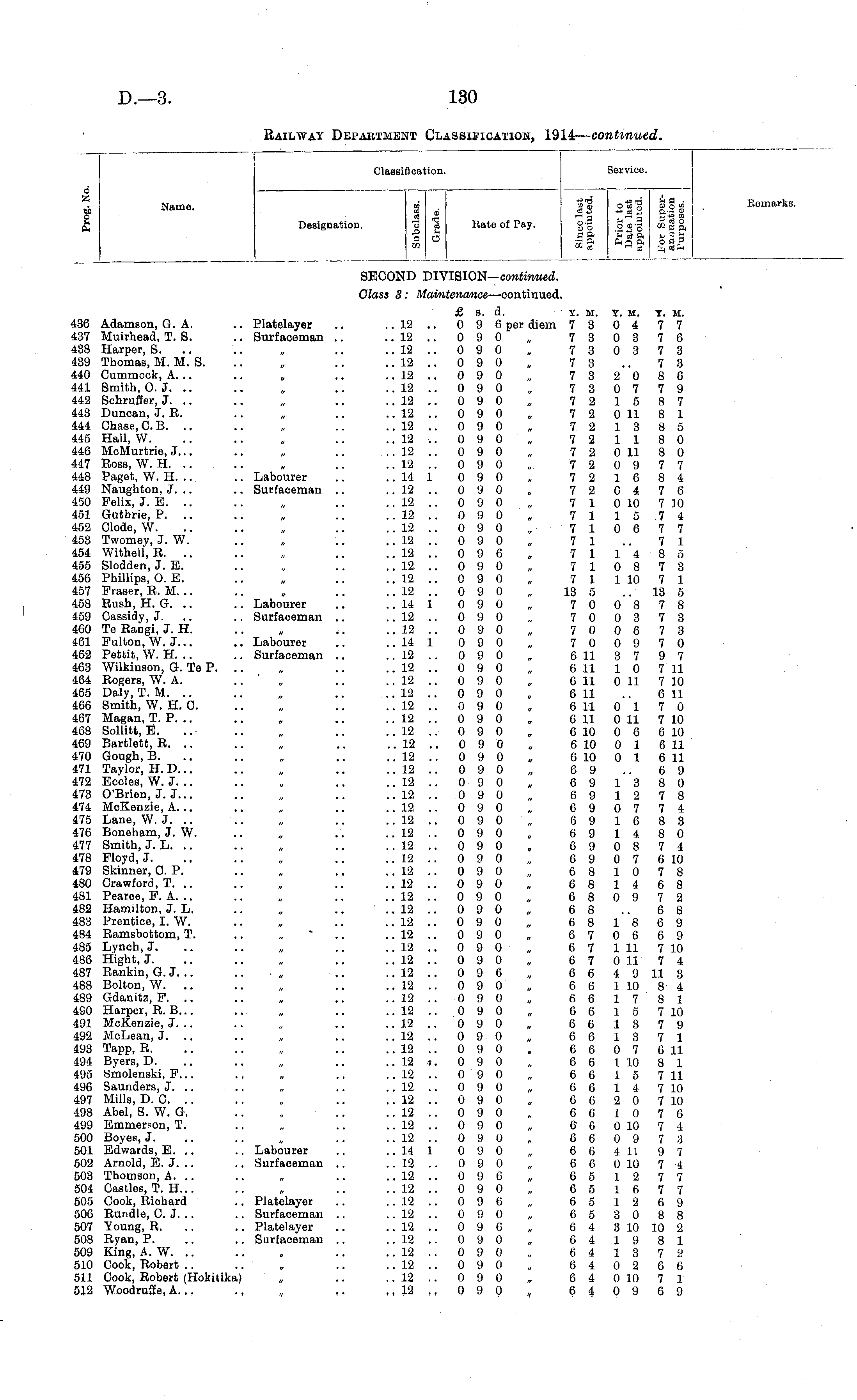 Classification. Service. d g »4 Name. Designation. o> Rate of Pay. -*=T3 C] • i 2 5 g ® S..2 o • -g h -S s|§ So 2S'o ffl = a || S|& Sal Kemarks. SECOND DIVISION— continued. Class 3: Maintenance —continued. 436 Adamson, G. A. .. Platelayer 437 Muirhead, T. S. .. Surfaceman .. 438 Harper, S. .. 439 Thomas, M. M. S. 440 Cummock, A. .. .. „ 441 Smith, 0. J. .. 442 Schrufler, J. .. 443 Duncan, J. R. 444 Chase, C. B. .. 445 Hall, W. 446 MeMurtrie, J. .. 447 Ross, W. H. .. 448 Paget, W. H. .. .. Labourer 449 Naughton, J. .. .. Surfaceman .. 450 Felix, J. E. .. 451 Guthrie, P. .. 452 Clode, W. .. 453 Twomey, J. W. 454 Withell, R. .. 455 Slodden, J. E. 456 Phillips, O. E. 457 Fraser, E. M. .. 458 Rash, H. G. .. .. Labourer 459 Cassidy, J. .. Surfaceman .. 460 Te Rangi, J. H. 461 Fulton, W.J... .. Labourer 462 Pettit, W. H. .. .. Surfaceman .. 463 Wilkinson, G. Te P. .. 464 Rogers, W. A. .. ' „ 465 Daly, T. M. .. 466 Smith, W. H. 0. 467 Magan, T. P. .. 468 Sollitt.E. 469 Bartlett, R. .. 470 Gough, B. .. 471 Taylor, H. D... 472 Eccles, W. J. .. 473 O'Brien, J. J... 474 MoKenzie, A... 475 Lane, W. J. .. 476 Boneham, J. W. 477 Smith, J. L. .. 478 Floyd, J. 479 Skinner, 0. P. 480 Crawford, T. .. 481 Pearce, F. A. .. 482 Hamilton, J. L. 483 Prentice, I. W. 484 Ramsbottom, T. .. „ * 485 Lynch, J. 486 Hight, J. 487 Rankin, G. 3. .. 488 Bolton, W. .. 489 Gdanitz, F. .. 490 Harper, R. B... 491 McKenzie, J. .. 492 McLean, J. .. 493 Tapp, R. 494 Byers, D. 495 Smolenski, F... 496 Saunders, J. .. 497 Mills, D. C. .. 498 Abel, S. W. G. .. „ • .. 499 Emmerson, T. 500 Boyes, J. 501 Edwards, E. .. .. Labourer 502 Arnold, E. J. .. .. Surfaceman .. 503 Thomson, A. .. 504 Castles, T. H... 505 Cook, Richard .. Platelayer 506 Rutidle, C. J. .. .. Surfaceman .. 507 Young, R. .. .. Platelayer 508 Ryan, P. .. .. Surfaceman .. 509 King, A. W. .. 510 Cook, Robert 511 Cook, Robert (Hokitika) 512 Woodruffe, A... £ s. d. y. m. .. 12 .. 0 9 6 per diem 7 3 .. 12 .. 0 9 0 „ 7 3 .. 12 .. 0 9 0 „ 7 3 .. 12 .. 0 9 0 „ 7 3 .. 12 .. 0 9 0 „ 7 3 .. 12 .. 0 9 0 „ 7 3 .. 12 .. 0 9 0 „ 7 2 .. 12 .. 0 9 0 , 7 2 .. 12 .. 0 9 0 „ 7 2 .. 12 .. 0 9 0 „ 7 2 .. 12 .. 0 9 0 „ 7 2 .. 12 .. 0 9 0 „ 7 2 .. 14 1 0 9 0 , 7 2 .. 12 .. 0 9 0 „ 7 2 .. 12 .. 0 9 0 „ 7 1 .. 12 .. 0 9 0 , 7 1 .. 12 .. 0 9 0 „ 7 1 .. 12 .. 0 9 0 „ 7 1 .. 12 .. 0 9 6 „ 7 1 .. 12 .. 0 9 0 „ 7 1 .. 12 .. 0 9 0 „ 7 1 .. 12 .. 0 9 0 „ 13 5 .. 14 1 0 9 0 „ 7 0 .. 12 .. 0 9 0 „ 7 0 .. 12 .. 0 9 0 „ 7 0 .. 14 1 0 9 0 „ 7 0 .. 12 .. 0 9 0 „ 6 11 .. 12 .. 0 9 0 , 6 11 .. 12 .. 0 9 0 „ 6 11 .. 12 .. 0 9 0 „ 6 11 .. 12 .. 0 9 0 „ 6 11 .. 12 .. 0 9 0 „ 6 11 .. 12 .. 0 9 0 „ 6 10 .. 12 .. 0 9 0 „ 6 10 .. 12 .. 0 9 0 „ 6 10 .. 12 .. 0 9 0 „ 6 9 .. 12 .. 0 9 0 „ 6 9 .. 12 .. 0 9 0 „ 6 9 .. 12 .. 0 9 0 „ 6 9 .. 12 .. 0 9 0 „ 6 9 .. 12 .. 0 9 0 „ 6 9 .. 12 .. 0 9 0 „ 6 9 .. 12 .. 0 9 0 . 6 9 .. 12 .. 0 9 0 „ 6 8 .. 12 .. 0 9 0 „ 6 8 .. 12 .. 0 9 0 „ 6 8 .. 12 .. 0 9 0 , 6 8 .. 12 .. 0 9 0 „ 6 8 .. 12 .. 0 9 0 „ 6 7 .. 12 .. 0 9 0 „ 6 7 .. 12 .. 0 9 0 „ 6 7 .. 12 .. 0 9 6 „ 6 6 .. 12 .. 0 9 0 „ 6 6 .. 12 .. 0 9 0 „ 6 6 .. 12 .. 0 9 0 „ 6 6 .. 12 .. 0 9 0 , 6 6 .. 12 .. 0 9 0 „ 6 6 .. 12 .. 0 9 0 „ 6 6 .. 12 ,. 0 9 0 „ 6 6 .. 12 .. 0 9 0 „ 6 6 .. 12 .. 0 9 0 „ 6 6 .. 12 .. 0 9 0 „ 6 6 .. 12 .. 0 9 0 „ 6 6 .. 12 .. 0 9 0 „ & 6 .. 12 .. 0 9 0 „ 6 6 .. 14 1 0 9 0 „ 6 6 .. 12 .. 0 9 0 „ 6 6 .. 12 .. 0 9 6 „ 6 5 .. 12 .. 0 9 0 „ 6 5 .. 12 .. 0 9 6 „ 6 5 .. 12 .. 0 9 0 „ 6 5 .. 12 .. 0 9 0 „ 6 4 .. 12 .. 0 9 0 „ 6 4 .. 12 .. 0 9 0 „ 6 4 .. 12 .. 0 9 0 „ 6 4 .. 12 .. 0 9 0 „ 6 4 ., 12 ,, 0 9 0 „ 6 4 y. m. y. m. 0 4 7 7 0 3 7 6 0 3 7 3 7 3 2 0 8 6 0 7 7 9 15 8 7 0 11 8 1 13 8 5 118 0 0 11 8 0 0 9 7 7 16 8 4 0 4 7 6 0 10 7 10 15 7 4 0 6 7 7 7 1 14 8 5 0 8 7 3 1 10 7 1 13 5 0 8 7 8 0 3 7 3 0 6 7 3 0 9 7 0 3 7 9 7 10 7 11 0 11 7 10 6 11 0 1 7 0 0 11 7 10 0 6 6 10 0 1 6 11 0 1 6 11 6 9 13 8 0 12 7 8 0 7 7 4 16 8 3 14 8 0 0 8 7 4 0 7 6 10 10 7 8 14 6 8 0 9 7 2 6 8 18 6 9 0 6 6 9 1 11 7 10 0 11 7 4 4 9 11 3 1 10 8 4 17 8 1 15 7 10 13 7 9 13 7 1 0 7 6 11 1 10 8 1 15 7 11 14 7 10 2 0 7 10 10 7 6 0 10 7 4 0 9 7 3 4 11 9 7 0 10 7 4 12 7 7 16 7 7 12 6 9 3 0 8 8 3 10 10 2 19 8 1 13 7 2 0 2 6 6 0 10 7 1 0 9 6 9