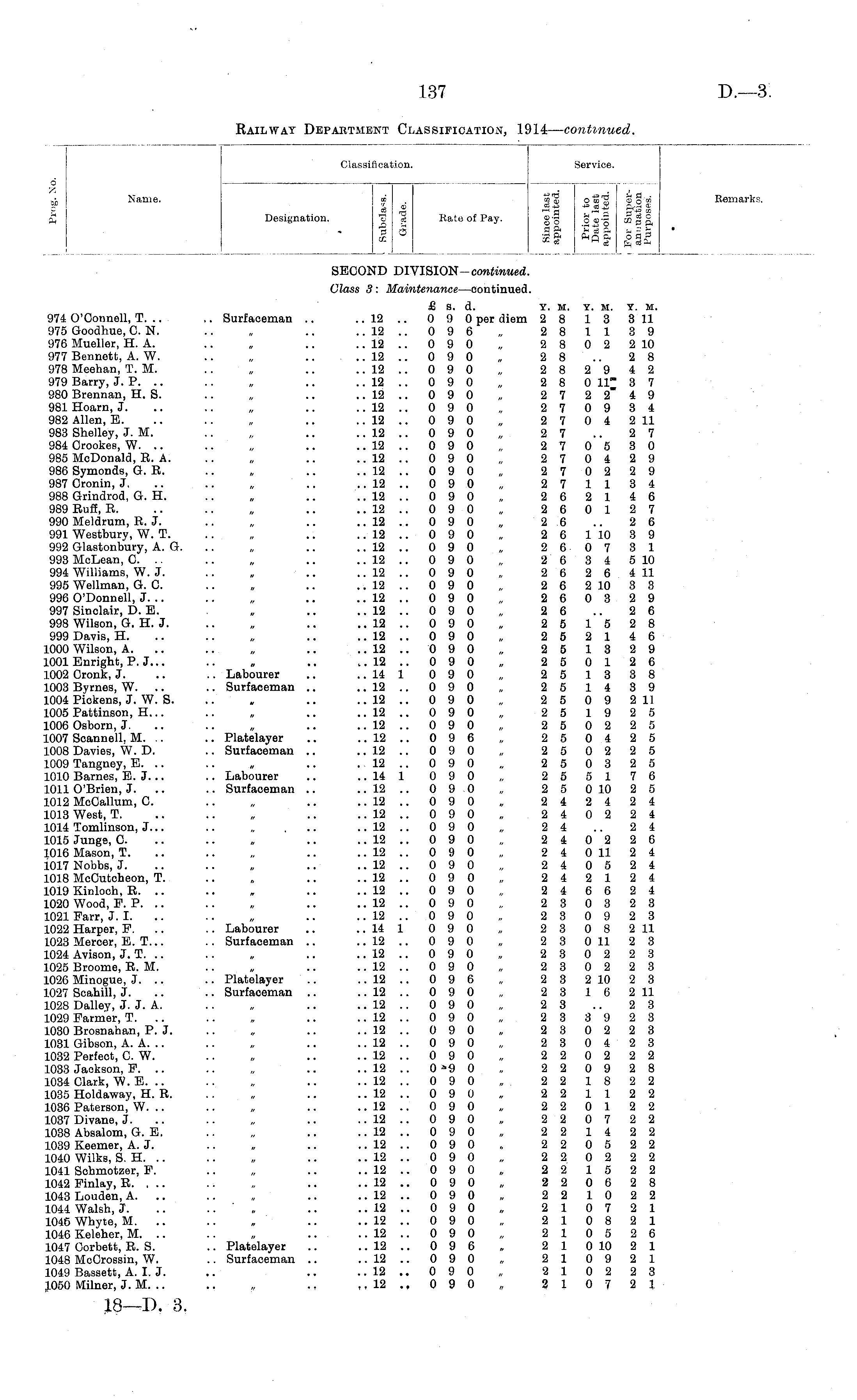 d Z si; Name. 3 ! Classification. Service. Designation. " s Rate of Pay. g-g o<o-~ M $ g, 1 S I! 2 a| ||| Classification. Remarks. SECOND DIVISION- continued. Class 3: Maintenance —continued. 974 O'Ootmell, T. .. 975 Goodhue, C. N. 976 Mueller, H. A. 977 Bennett, A. W. 978 Meehan, T. M. 979 Barry, J. P. 980 Brennan, H. S. 981 Hoarn, J. 982 Allen, E. 983 Shelley, J. M. 984 Orookes, W. .. 985 McDonald, B. A. 986 Symonds, G. E. 987 Cronin, J. 988 Grindrod, G. H. 989 Ruff, R. 990 Meldrum, R. J. 991 Westbury, W. T. 992 Glastonbury, A. G. 993 McLean, C. .. 994 Williams, W. J. 995 Wellman, G. C. 996 O'Donnell, J. .. 997 Sinclair, D. B. 998 Wilson, G. H. J. 999 Davis, H. 1000 Wilson, A. lOOlEnright, P. J... 1002 Cronk, J. 1003 Byrnes, W. .. 1004 Pickens, J. W. S. 1005 Pattinson, H... 1006 Osborn, J. 1007 Soannell. M. .. 1008 Davies, W. D. 1009 Tangney, E. .. 1010 Barnes, E.J... 1011 O'Brien, J. .. 1012 McOallum, C. 1013 West, T. 1014 Tomlinson, J. .. 1015 Jungs, C. 1016 Mason, T. 1017 Nobbs, J. 1018 McCutcheon, T. 1019 Kicloch, R. .. 1020 Wood, P. P. 1021 Farr, J.I. 1022 Harper, P. 1023 Mercer, E. T... 1024 Avison, J. T. 1025 Broome, R. M. 1026 Minogue, J. .. 1027 Scahill, J. 1028 Dalley, J. J. A. 1029 Farmer, T. 1030 Brosnahan, P. J. 1031 Gibson, A. A. .. 1032 Perfect, O. W. 1033 Jackson, F. .. 1034 Clark, W. E. .. 1035 Holdaway, H. R. 1036 Paterson, W. .. 1037 Divane, J. 1038 Absalom, G. E. 1039 Keemer, A. J. 1040 Wilks, S. H. 1041 Sohmotzer, P. 1042 Pinlay, R. . .. 1043 Louden, A. 1044 Walsh, J. 1045 Whyte, M. 1046 Keleher, M. .. 1047 Oorbett, R. S. 1048 McOrossin, W. 1049 Bassett, A. I. J. ,1050 Milner, J. M. .. £ s. d. Y. M. y. m. x. m. .. Surfaceman .. .. 12 .. 0 9 0 per diem 2 8 13 3 11 .. 12 .. 0 9 6 „ 2 8 113 9 ..1! ..090 „ 2 8 0 2 2 10 ..12 ..090 „ 28.. 28 .. 12 .. 0 9 0 „ 2 8 2 9 4 2 .. 12 .. 0 9 0 „ 2 8 0 11" 3 7 .. 12 .. 0 9 0 „ 2 7 2 2" i 9 .. 12 .. 0 9 0 „ 2 7 0 9 3 4 .. 12 .. 0 9 0 „ 2 7 0 i 2 11 .. 12 .. 0 9 0 „ 2 7 .. 2 7 .. 12 .. 0 9 0 „ 2 7 0 5 3 0 .. 12 .. 0 9 0 „ 2 7 0 4 2 9 .. 12 .. 0 9 0 „ 2 7 0 2 2 9 .. 12 .. 0 9 0 „ 2 7 113 4 .. 12 .. 0 9 0 „ 2 6 2 14 6 .. 12 .. 0 9 0 „ 2 6 0 12 7 .. 12 .. 0 9 0 „ 2 6 .. 2 6 .. 12 .. 0 9 0 „ 2 6 1 10 3 9 .. 12 .. 0 9 0 „ 2 6 0 7 3 1 .. 12 .. 0 9 0 „ 2 6 3 4 5 10 • .. .. 12 .. 0 9 0 „ 2 6 2 6 4 11 .. 12 .. 0 9 0 „ 2 6 2 10 3 3 .. 12 .. 0 9 0 „ 2 6 0 3 2 9 .. 12 .. 0 9 0 „ 2 6 .. 2 6 .. 12 .. 0 9 0 „ 2 5 15 2 8 .. 12 .. 0 9 0 „ 2 5 2 14 6 .. 12 .. 0 9 0 „ 2 5 13 2 9 .. 12 .. 0 9 0 „ 2 5 0 12 6 .. Labourer .. ..14 1 090 „ 25 13 38 .. Surfaceman .. ..12.. 090 „ 25 14 39 .. 12 .. 0 9 0 „ 2 5 0 9 2 11 .. 12 .. 0 9 0 „ 2 5 19 2 5 .. 12 .. 0 9 0 „ 2 5 0 2 2 5 .. Platelayer .. ..12.. 096 „ 25 04 25 .. Surfaceman .. .. 12 .. 0 9 0 „ 2 5 0 2 2 5 . 12 .. 0 9 0 „ 2 5 0 3 2 5 .. Labourer .. ..14 1 090 „ 25 5176 .. Surfaceman .. .. 12 .. 0 9 0 „ 2 5 0 10 2 5 .. 12 .. 0 9 0 „ 2 4 2 4 2 4 .. 12 .. 0 9 0 „ 2 4 0 2 2 4 .. 12 .. 0 9 0 „ 2 4 .. 2 4 ..12.. 090 „ 240226 .. 12 .. 0 9 0 „ 2 4 0 11 2 4 .. 12 .. 0 9 0 „ 2 4 0 5 2 4 .. 12 .. 0 9 0 „ 2 4 2 12 4 ..12.. 090 „ 246624 .. 12 .. 0 9 0 „ 2 3 0 3 2 3 .. 12 .. 0 9 0 „ 2 3 0 9 2 3 .. Labourer .. .. 14 1 0 9 0 „ 2 3 0 8 2 11 .. Surfaceman .. .. 12 .. 0 9 0 „ 2 3 0 11 2 3 .. 12 .. 0 9 0 „ 2 3 0 2 2 3 .. 12 .. 0 9 0 „ 2 3 0 2 2 3 .. Platelayer .. .. 12 .. 0 9 6 „ 2 3 2 10 2 3 .. Surfaceman .. .. 12 .. 0 9 0 „ 2 3 16 2 11 .. 12 .. 0 9 0 „ 2 3 .. 2 3 .. 12 .. 0 9 0 „ 2 3 3 9 2 3 .. 12 .. 0 9 0 „ 2 3 0 2 2 3 .. 12 .. 0 9 0 „ 2 3 0 4 2 3 .. 12 .. 0 9 0 „ 2 2 0 2 2 2 .. 12 .. 0 -9 0 „ 2 2 0 9 2 8 .. 12 .. 0 9 0 „ 2 2 18 2 2 .. 12 .. 0 9 0 „ 2 2 112 2 .. 12 .. 0 9 0 „ 2 2 0 12 2 .. 12 .. 0 9 0 „ 2 2 0 7 2 2 .. 12 .. 0 9 0 „ 2 2 14 2 2 .. 12 .. 0 9 0 „ 2 2 0 5 2 2 .. 12 .. 0 9 0 „ 2 2 0 2 2 2 .. 12 .. 0 9 0 „ 2 2 15 2 2 .. 12 .. 0 9 0 „ 2 2 0 6 2 8 .. 12 .. 0 9 0 „ 2 2 10 2 2 .. ' „ .. .. 12 .. 0 9 0 „ 2 10 7 2 1 ..12.. 090 „ 210821 .. 12 .. 0 9 0 „ 2 10 5 2 6 .. Platelayer .. .. 12 .. 0 9 6 „ 2 1 0 10 2 1 .. Surfaceman .. ..12.. 090 „ 21 09 21 ..12.. 090 „ 210223 ,, 12 ., 0 9 0 „ 2 10 7 2 1