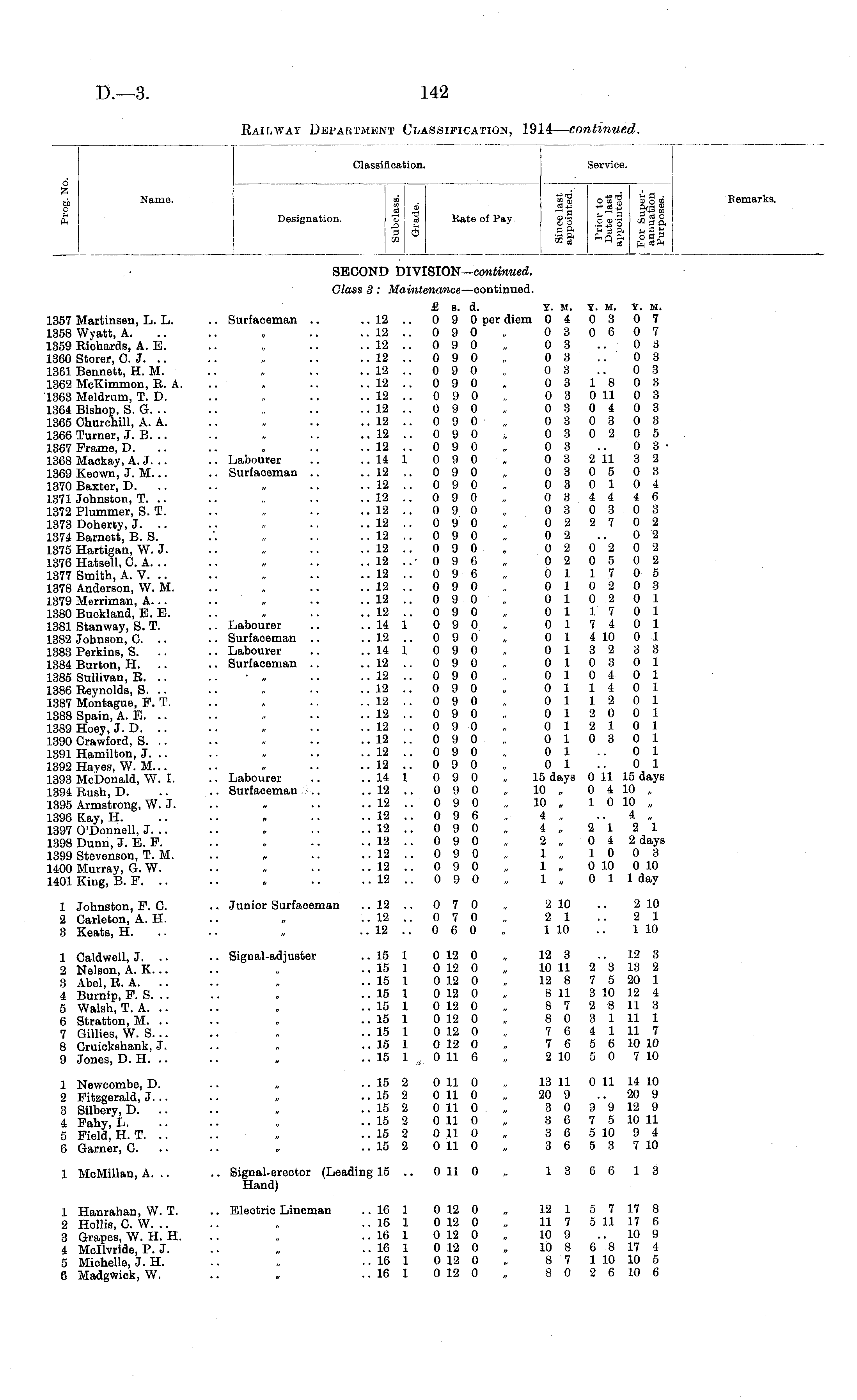 6 oi, Name. p Classification. Service. i w ' • ' a ' «? • i.£ O $ Designation. | « Kate of Pay. β-f g«-| || | SECOND DIVISION— continued. ° 3 of l≤1 «|| Service. Kemarks. Class S : Maintenance —continued. .357 Martinsen, L. L. .358 Wyatt, A. .359 Richards, A. E. .360 Storer, C.J. .361 Bennett, H. M. .362 MoKimmon, E. A. .363 Meldram, T. D. .364 Bishop, S. G. .. .365 Churchill, A. A. .366 Turner, J. B. .. .367 Frame, D. .368 Mackay, A. J. .. .369 Keown, J. M... .370 Baxter, D. .371 Johnston, T. .. .372 Plummer, S. T. .373 Doherty, J. .. .374 Barnett, B. S. .375 Hartigan, W. J. .376 Hatsell, C. A. .. .377 Smith, A. V. .378 Anderson, W. M. .379 Merriman, A... .380 Buckland, E. E. .381 Stanway, S. T. .382 Johnson, C. .. .383 Perkins, S. .384 Burton, H. .. .385 Sullivan, R. .. .386 Reynolds, S. .. l387 Montague, P. T. .388 Spain, A. E. .389 Hoey, J. D. .390 Crawford, S. .. .391 Hamilton, J. .. .392 Hayes, W. M... .393 McDonald, W. I. .394 Rush, D. l395 Armstrong, W. J. .396 Kay, H. 1397 O'Donnell, J. .. S9S Dunn, J. E. F. 399 Stevenson, T. M. L400 Murray, G. W. L401 King, B. F. & s. d. Y. M. Y. M. Y. M. .. Surfaceman .. .. 12 .. 0 9 0 per diem 0 4 0 3 0 7 .. 12 .. 0 9 0 „ 0 3 0 6 0 7 .. 12 .. 0 9 0 „ 0 3 .. 0 5 .. 12 .. 0 9 0 „ 0 3 .. 0 3 .. 12 .. 0 9 0 ., 0 3 .. 0 3 .. 12 .. 0 9 0 „ 0 3 18 0 3 .. 12 .. 0 9 0 „ 0 3 0 11 0 3 .. 12 .. 0 9 0 „ 0 3 0 4 0 3 .. 12 .. 0 9 0 „ 0 3 0 3 0 3 .. 12 .. 0 9 0 „ 0 3 0 2 0 5 .. 12 .. 0 9 0 „ 0 3 .. 0 3- .. Labourer .. .. 14 1 0 9 0 , 0 3 2 11 3 2 .. Surfaoeman .. ..12.. 090 „ 03 05 03 ., 12 .. 0 9 0 „ 0 3 0 10 4 .. 12 .. 0 9 0 „ 0 3 4 4 4 6 .. 12 .. 0 9 0 „ 0 3 0 3 0 3 ,.12 .. 0 9 0 „ 0 2 2 7 0 2 .. 12 .. 0 9 0 „ 0 2 .. 0 2 .. 12 .. 0 9 0 „ 0 2 0 2 0 2 .. 12 ..■ 0 9 6 „ 0 2 0 5 0 2 .. 12 .. 0 9 6 „ 0 117 0 5 ..12.. 090 „ 010203 ..12.. 090 » 010201 .. 12 .. 0 9 0 „ 0 117 0 1 .. Labourer .. ..14 1 090 „ 017401 .. Surfaceman .. .. 12 .. 0 9 0 „ 0 1 4 10 0 1 .. Labourer .. ..14 1 090 „ 0132 33 .. Surfaceman .. ..12.. 090 „ 0103 01 ..12.. 090 „ 010401 .. 12 .. 0 9 0 „ 0 114 0 1 ..12.. 090 „ 011201 .. 12 .. 0 9 0 „ 0 12 0 0 1 .. 12 .. 0 9 0 „ 0 12 10 1 .. 12 .. 0 9 0 „ 0 10 3 0 1 .. 12 .. 0 9 0 „ 0 1 .. 0 1 .. 12 .. 0 9 0 „ 0 1 .. 0 1 .. Labourer .. .. 14 1 0 9 0 „ 15 days 0 11 15 days .. Surfaoeman .. .. 12 .. 0 9 0 „ 10 „ 0 4 10 „ .. 12 .. 0 9 0 „ 10 „ 1 0 10 „ .. 12 .. 0 9 6 „ 4 „ .. 4 „ .. 12 .. 0 9 0 „ 4 „ 2 12 1 .. 12 .. 0 9 0 „ 2 „ 0 4 2 days .. 12 .. 0 9 0 „ 1 „ 10 0 3 .. 12 .. 0 9 0 „ 1 „ 0 10 0 10 .. 12 .. 0 9 0 „ 1 „ 0 1 1 day 1 Johnston, F. C. 2 Carleton, A. H. 3 Keats, H. .. Junior Surfaceman .. 12 .. 0 7 0 „ 2 10 .. 2 10 .. 12 .. 0 7 0 „ 2 1 .. 2 1 .. 12 .. 0 6 0 „ 1 10 .. 1 10 1 Caldwell, J. .. 2 Nelson, A. K. .. 3 Abel, R. A. 4 Burnip, F. S. .. 5 Walsh, T. A. 6 Stratton, M. .. 7 Gillies, W. S... 8 Cruiokshank, J. 9 Jones, D. H. .. Signal-adjuster .. 15 1 0 12 0 „ 12 3 .. 12 3 .. 15 1 0 12 0 „ 10 11 2 3 13 2 ..15 1 0 18 0 ■ 12 8 7 5 20 1 .. 15 1 0 12 0 „ 8 11 3 10 12 4 ..16 1 0 12 0 , 8 7 2 8 11 3 ,,15 1 018 0 , 8 0 3 1 11 1 ,.15 1 018 0 , 7 6 4 1 11 7 ,,15 1 018 0 , 7 6 5 6 10 10 .. 15 1 0 11 6 2 10 5 0 7 10 1 Newcombe, D. 2 Fitzgerald, J. .. 3 Silbery, D. .. i Fahy, L. 5 Field, H. T. 6 Garner, C. ,,15 8 0 11 0 , 13 11 0 11 14 10 .. 15 2 0 110 „ 20 9 20 9 .. 15 2 0 11 0 „ 3 0 9 9 12 9 .. 15 2 0 11 0 3 6 7 5 10 11 ,,15 2 0 11 0 , 3 6 5 10 9 4 ,,15 2 Oil 0 , 3 6 5 3 7 10 1 McMillan, A. .. .. Signal-erector (Leading 15 .. 0 11 0 „ 13 6 6 13 Hand) 1 Hanrahan, W. T. 2 Hollis, C. W. 3 Grapes, W. H. H. 4 Mcllvride, P. J. 5 Miohelle, J. H. 6 Madgwick, W. .. Electric Lineman .. 16 1 0 12 0 „ 12 1 5 7 17 8 .. 16 1 0 12 0 „ 11 7 5 11 17 6 .. 16 1 0 12 0 „ 10 9 .. 10 9 .. 16 1 0 12 0 10 8 6 8 17 4 .. 16 1 0 12 0 „ 8 7 1 10 10 5 ,,16 1 012 O , 8 0 2 6 10 6