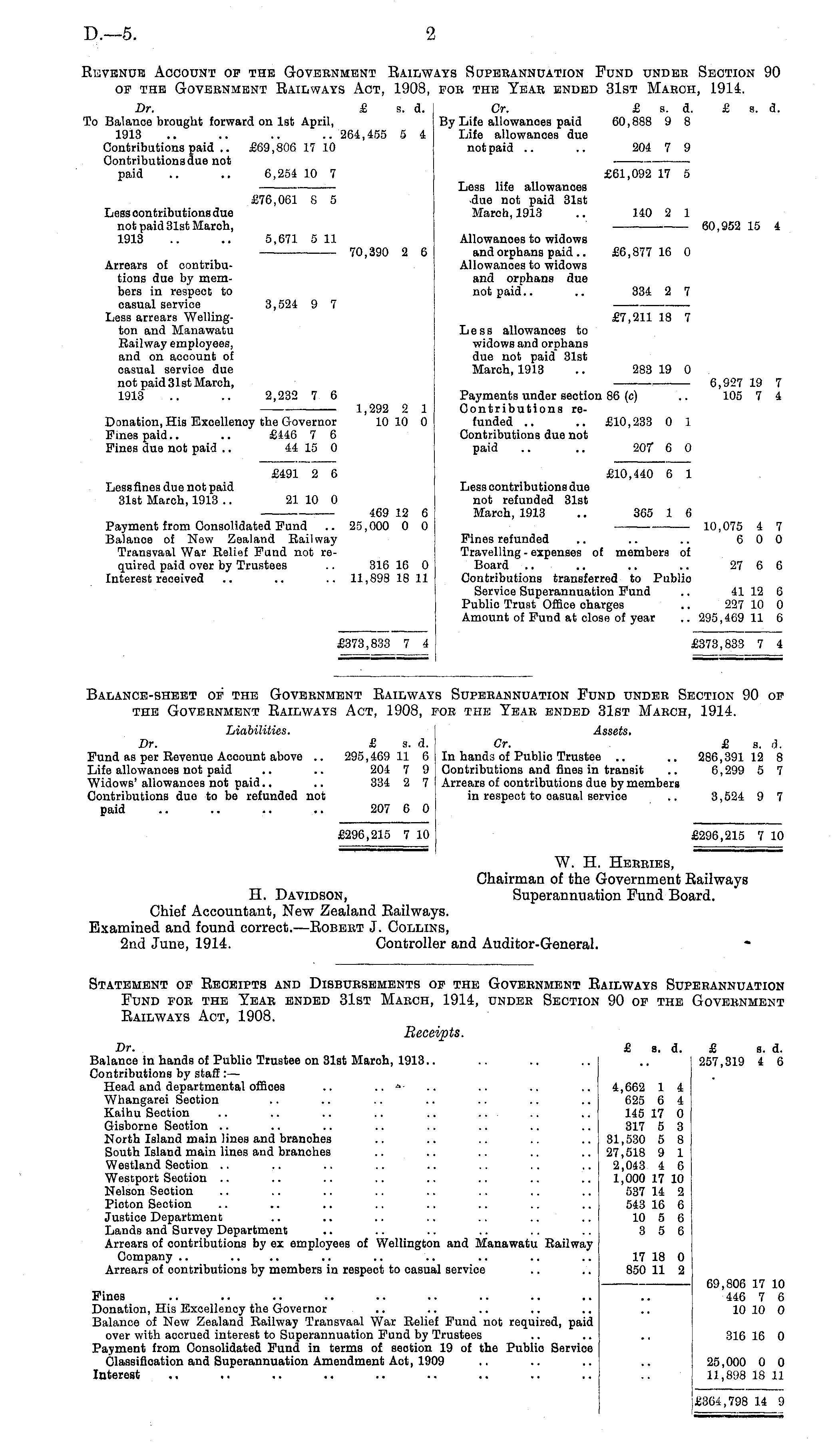Ravenue Account of the Goveenment Railways Supebannuation Fund undeb Section 90 of the Government Railways Act, 1908, foe the Yeae ended 31st Mabch, 1914. Dr. £ s. d. Or. £ s. d. £ s. d. To Balance brought forward on Ist April, By Life allowances paid 60,888 9 8 1913 .. .. .. .. 264,455 5 4 Life allowances due Contributions paid .. £69,806 17 10 not paid .. .. 204 7 9 Contributions due not paid .. .. 6,254 10 7 £61,092 17 5 —— Less life allowances £76,061 8 5 due not paid 31st Less contributions due March, 1913 .. 140 2 1 not paid 31st Maroh, 60,952 15 4 1913 .. .. 5,671 5 11 Allowances to widows 70,390 2 6 and orphans paid.. £6,877 16 0 Arrears of contribu- Allowances to widows tions due by mem- and orphans due bers in respect to not paid.. .. 334 2 7 casual service 3,524 9 7 Less arrears Welling- £7,211 18 7 ton and Manawatu Less allowances to Eailway employees, widows and orphans and on account of due not paid 31st oasual service due March, 1913 .. 283 19 0 not paid3lst March, 6,927 19 7 1913 .. .. 2,232 7 6 Payments under section 86 (c) .. 105 7 4 1,292 2 1 Contributions reDonation, His Excellency the Governor 10 10 0 funded .. .. £10,233 0 1 Fines paid.. .. £446 7 6 Contributions due not Fines due not paid .. 44 15 0 paid .. .. 207" 6 0 £491 2 6 £10,440 6 1 Lessfines due not paid Less contributions due 31st March, 1913 .. 21 10 0 not refunded 31st — 469 12 6 March, 1913 .. 365 1 6 Payment from Consolidated Fund .. 25,000 0 0 10,075 4 7 Balance of New Zealand Eailway Fines refunded .. .. .. 6 0 0 Transvaal War Relief Fund not re- Travelling - expenses of members of quired paid over by Trustees .. 316 16 0 Board .. .. .. .. 27 6 6 Interest received .. .. .. 11,898 18 11 Contributions transferred to Publio Service Superannuation Fund .. 41 12 6 Publio Trust Office charges .. 227 10 0 Amount of Fund at close of year .. 295,469 11 6 £373,833 7 4 £373,833 7 4 Balance-sheet of the Govebnment Railways Supebannuation Fund undeb Section 90 op the goveenment railways act, 1908, fob the yeab ended 31st maech, 1914. Liabilities. Assets. Dr. £ s. d. Gr. £ s. d. Fund as per Revenue Account above .. 295,469 11 6 In hands of Public Trustee .. .. 286,391 12 8 Life allowances not paid .. .. 204 7 9 Contributions and fines in transit .. 6,299 5 7 Widows' allowances not paid.. .. 334 2 7 Arrears of contributions due by members Contributions due to be refunded not in respect to oasual service .. 3,524 9 7 paid .. .. .. .. 207 6 0 £296,215 7 10 £296,215 7 10 W. H. Heebies, Chairman of the Government Railways H. Davidson, Superannuation Fund Board. Chief Accountant, New Zealand Railways. Examined and found correct. —Robeet J. Collins, 2nd June, 1914. Controller and Auditor-General. Statement of Receipts and Disbuesements of the Govebnment Railways Supeeannuation Fund foe the Yeae ended 31st Maech, 1914, undeb Section 90 of the Goveenment Railways Act, 1908. Receipts. Dr. £ s. d. £ s. d. Balance in hands of Publio Trustee on 31st Maroh, 1913.. .. .. .. .. 257,319 4 6 Contributions by staff: — Head and departmental offioes .. ..-■>• .. .. .. .. 4,662 1 4 Whangarei Seotion .. .. .. .. .. .. .. 625 6 4 Kaihu Section .. .. .. .. .. .. 145 17 0 Gisborne Section .. .. .. .. .. .. .. .. 317 5 3 North Island main lines and branohes .. .. .. .. .. 31,530 5 8 South Island main lines and branches .. .. .. .. .. 27,518 9 1 Westland Section .. .. .. .. .. .. .. .. 2,043 4 6 Westport Section .. .. .. .. .. .. .. .. 1,000 17 10 Nelson Seotion .. .. .. .. .. .. .. .. 537 14 2 Picton Section .. .. .. .. .. .. .. .. 543 16 6 Justice Department .. .. .. .. .. .. .. 10 5 6 Lands and Survey Department .. .. .. .. .. .. 356 Arrears of contributions by ex employees of Wellington and Manawatu Railway Company .. .. .. .. .. .. .. .. .. 17 18 0 Arrears of contributions by members in respect to casual service .. .. 850 11 2 69,806 17 10 Fines .. .. .. .. .. .. .. .. .. .. 446 7 6 Donation, His Excellency the Governor .. .. .. .. .. .. 10 10 0 Balance of New Zealand Railway Transvaal War Relief Fund not required, paid over with accrued interest to Superannuation Fund by Trustees .. .. .. 316 16 0 Payment from Consolidated Fund in terms of seotion 19 of the Publio Service Classification and Superannuation Amendment Aot, 1909 .. .. .. .. 25,000 0 0 Interest .. .. .. .. .. .. .. .. .. .. 11,898 18 11 14 9