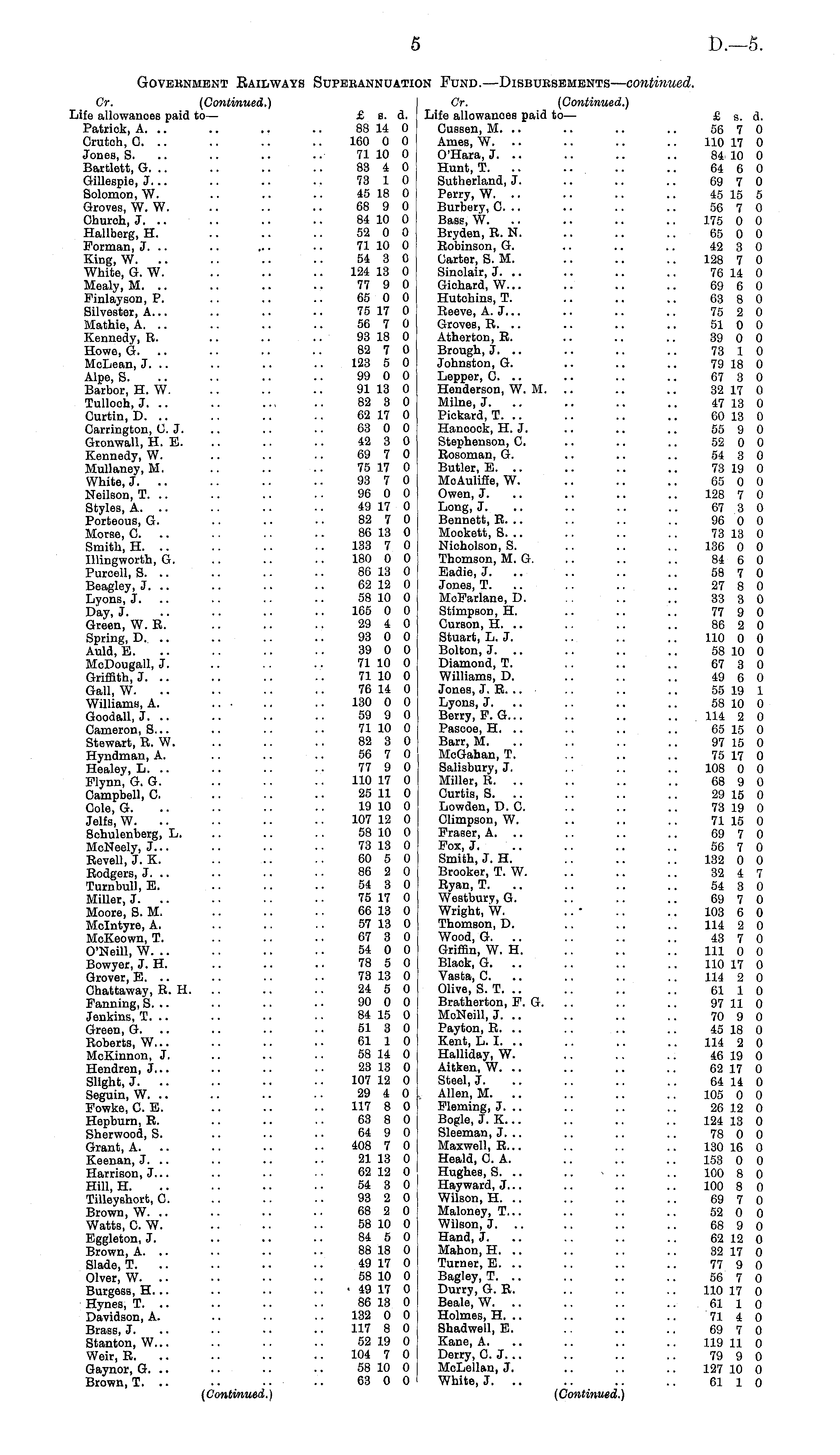 Cr. (Continued.) Gr. (Continued.) Life allowanoes paid to— £ s. d. Life allowanoea paid to— £ s. d. Patrick, A. .. .. .. .. 88 14 0 Cussen, M. .. .. .. .. 56 7 0 Crutch, C. .. .. .. .. 160 0 0 Ames, W. .. .. .. .. 110 17 0 Jones, S. .. .. .. .. 71 10 0 O'Hara, J. .. .. .. .. 84. 10 0 Bartlett, G. .. .. .. .. 83 4 0 Hunt, T. .. .. .. .. 64 6 0 Gillespie, J. .. .. .. .. 73 1 0 Sutherland, J. .. .. .. 69 7 0 Solomon, W. .. .. .. 45 18 0 Perry, W. .. .. .. .. 45 15 5 Groves, W. W. .. .. .. 68 9 0 Burbery, 0. .. .. .. .. 56 7 0 Ohuroh, J. .. .. .. .. 84 10 0 Bass, W. .. .. .. .. 175 0 0 Hallberg, H. .. .. .. 52 0 0 Bryden, B. N. .. .. .. 65 0 0 Forman, J. .. .. ... .. 71 10 0 Robinson, G. .. .. .. 42 3 0 King, W. .. .. .. .. 54 3 0 Carter, S. M. .. .. .. 128 7 0 White, G. W. .. .. .. 124 13 0 Sinolair, J. .. .. .. .. 76 14 0 Mealy, M. .. .. .. .. 77 9 0 Giohard, W... .. .. .. 69 6 0 Pinlayson, P. .. .. .. 65 0 0 Hutchins, T. .. .. .. 63 8 0 Silvester, A... .. .. .. 75 17 0 Eeeve, A. J. .. .. .. .. 75 2 0 Mathie, A. .. .. .. .. 56 7 0 Groves, R. .. .. .. .. 51 0 0 Kennedy, R. .. .. .. 93 18 0 Atherton, R. .. .. .. 39 0 0 Howe, G. .. .. .. .. 82 7 0 Brough, J. .. .. .. .. 73 1 0 McLean, J... .. .. .. 123 5 0 Johnston, G. .. .. .. 79 18 0 Alpe, S. .. .. • ■ • • 99 0 0 Lepper, C. .. .. .. .. 67 3 0 Barbor, H. W. .. .. .. 91 13 0 Henderson, W. M. .. .. .. 32 17 0 Tulloch.J. .. .. 82 3 0 Milne, J. .. .. .. .. 47 13 0 Curtin, D. .. .. .. .. 62 17 0 Pickard, T. .. .. .. .. 60 13 0 Carrington, C.J. .. .. .. 63 0 0 Hanoock, H. J. .. .. .. 55 9 0 Gronwall, H. E. .. .. .. 42 3 0 Stephenson, C. .. .. .. 52 0 0 Kennedy, W. .. •. .. 69 7 0 Rosoman, G. .. .. .. 54 3 0 Mullaney, M. .. .. •• 75 17 0 Butler, E. .. .. .. .. 73 19 0 White, J. .. .. .. .. 93 7 0 MoAulifie, W. .. .. .. 65 0 0 Neilson, T. .. .. .. . • 96 0 0 Owen, J. .. .. .. 128 7 0 Styles, A. .. .. .. .. 49 17 0 Long, J. .. .. .. .. 67 3 0 Porteous, G. .. .. • • 82 7 0 Bennett, R. .. .. .. .. 96 0 0 Morse, C. .. .. .. •. 86 13 0 Mookett, S. .. .. .. .-. 73 13 0 Smith, H. .. .. .. .. 133 7 0 Nicholson, S. .. .. .. 136 0 0 Illingworth, G. .. .. .. 180 0 0 Thomson, M. G. .. .. .. 84 6 0 Puroell, S. .. .. .. • • 86 13 0 Eadie, J. .. .. .. 58 7 0 Beagley, J. .. .. .. .. 62 12 0 Jones, T. .. .. .. .. 27 8 0 Lyons, J. .. .. .. .. 58 10 0 McFarlane, D. .. .. .. 33 3 0 Day, J. .. .. .. .. 165 0 0 Stimpson, H. .. .. .. 77 9 0 Green, W. R. .. .. .. 29 4 0 Curson, H. .. .. .. .. 86 2 0 Spring, D. .. .. .. .. 93 0 0 Stuart, L. J. .. .. .. 110 0 0 Auld, E. .. .. .. •■ 39 0 0 Bolton, J. .. .. .. .. 58 10 0 McDougall, J. .. .. .. 71 10 0 Diamond, T. .. .. .. 67 3 0 Griffith, J. .. .. .. .. 71 10 0 Williams, D. .. .. .. 49 6 0 Gall, W. .. .. • • 76 14 0 Jones, J. R. .. .. .. .. 55 19 1 "Williams, A. .. 130 0 0 Lyons, J. .. .. .. .. 58 10 0 Goodall, J. .. .. .. •• 59 9 0 Berry, F. G... .. .. .. 114 2 0 Cameron, 8... .. .. .. 71 10 0 Pascoe, H. .. .. .. .. 65 15 0 Stewart, R. W. .. .. .. 82 3 0 Barr, M. .. .. .. 97 15 0 Hyndman, A. .. .. .. 56 7 0 McGahan, T. .. .. .. 75 17 0 Healey, L. .. .. .. .. 77 9 0 Salisbury, J. .. .. .. 108 0 0 Flynn, G. G. .. .. .. 110 17 0 Miller, R. .. .. .. .. 68 9 0 Campbell, C. .. .. • • 25 11 0 Curtis, S. .. .. .. .. 29 15 0 Cole, G. .. ■• •• ■• 19 10 0 Lowden, D. C. .. .. .. 73 19 0 Jelfs, W. .. .. .. ■• 107 12 0 Olimpson, W. .. .. .. 71 15 0 Schulenberg, L. .. .. .. 58 10 0 Fraser, A. .. .. .. .. 69 7 0 McNeely, J... .. .. •• 73 13 0 Fox, J. .. .. .. .. 56 7 0 Revell, J. K. .. .. .. 60 5 0 Smith, J. H. .. .. .. 132 0 0 Rodgers, J. .. . • .. ■ • 86 2 0 Brooker, T. W. .. .. .. 32 4 7 Turnbull, E. .. .. .. 54 3 0 Ryan, T. .. .. .. .. 54 3 0 Miller, J. .. .. .. .. 75 17 0 Westbury, G. .. .. .. 69 7 0 Moore, S. M. .. .. •. 66 13 0 Wright, W. .. • .. .. 103 6 0 Mclntyre, A. .. .. .. 57 13 0 Thomson, D. .. .. .. 114 2 0 McKeown, T. .. .. .. 67 3 0 Wood, G. .. .. .. .. 43 7 0 O'Neill, W. .. .. .. ■ • 54 0 0 Griffin, W. H. .. .. .. Ill 0 0 Bowyer, J. H. .. .. .. 78 5 0 Blaok, G. .. .. .. .. 110 17 0 Grover, E. .. .. .. . • 73 13 0 Vasta, C. .. .. .. .. 114 2 0 Chattaway, R. H. .. .. .. 24 5 0 Olive, S. T. .. .. .. .. 61 1 0 Fanning, S. .. .. .. • • 90 0 0 Bratherton, F. G. .. .. .. 97 11 0 Jenkins, T. .. .. .. • • 84 15 0 McNeill, J. .. .. .. .. 70 9 0 Green, G. .. .. .. .. 51 3 0 Payton, R. .. .. .. .. 45 18 0 Roberts, W... .. •■ •• 61 1 0 Kent, L. I. .. .. .. .. 114 2 0 McKinnon, J. .. .. .. 58 14 0 Halliday, W. .. .. .. 46 19 0 Hendren, J... .. .. .. 23 13 0 Aitken, W. .. .. .. .. 62 17 0 Slight, J. .. .. .. • • 107 12 0 Steel, J. .. .. .. .. 64 14 0 Seguin, W. .. .. .. • • 29 4 0 Allen, M. .. .. .. .. 105 0 0 Fowke, C. E. .. .. .. 117 8 0 Fleming, J. .. .. .. .. 26 12 0 Hepburn, R. .. .. .. 63 8 0 Bogle, J. K... .. .. .. 124 13 0 Sherwood, S. .. .. • • 64 9 0 Sleeman, J. .. .. .. .. 78 0 0 Grant, A. .. .. .. •• 408 7 0 Maxwell, R... .. .. .. 130 16 0 Keenan, J. .. .. .. .. 21 13 0 Heald, C. A. .. .. .. 153 0 0 Harrison, J... .. .. •• 62 12 0 Hughes, S. .. .. > .. .. 100 8 0 Hill, H. .. .. .. • • 54 3 0 Hayward, J. .. .. .. .. 100 8 0 Tilleyshort, C. .. .. • • 93 2 0 Wilson, H. .. .. .. .. 69 7 0 Brown, W. .. .- •• •■ 68 2 0 Maloney, T... .. .. .. 52 0 0 Watts, C. W. .. . ■ • • 58 10 0 Wilson, J .. .. 68 9 0 Eggleton, J. .. .. .. 84 5 0 Hand, J. .. .. .. 62 12 0 Brown, A. .. .. .. .. 88 18 0 Mahon, H. .. .. .. .. 32 17 0 Slade, T. .. .. .. .. 49 17 0 Turner, E. .. .. .. .. 77 9 0 Olver, W. .. .. •• •• 58 10 0 Bagley, T. .. .. .. .. 56 7 0 Burgess, H... .. .. .. • 49 17 0 Durry, G. R. .. .. .. 110 17 0 Hynes, T. .. .. .. . - 86 13 0 Beale, W. .. .. .. .. 61 1 0 Davidson, A. .. .. .. 132 0 0 Holmes, H. .. .. .. .. 71 4 0 Brass, J. ■ ■ • • • • 117 8 0 Shadwell, E. .. .. .. 69 7 0 Stanton, W... .. .. .. 52 19 0 Kane, A. .. .. .. .. 119 11 0 Weir, R. .. .. .. .. 104 7 0 Derry, C.J..