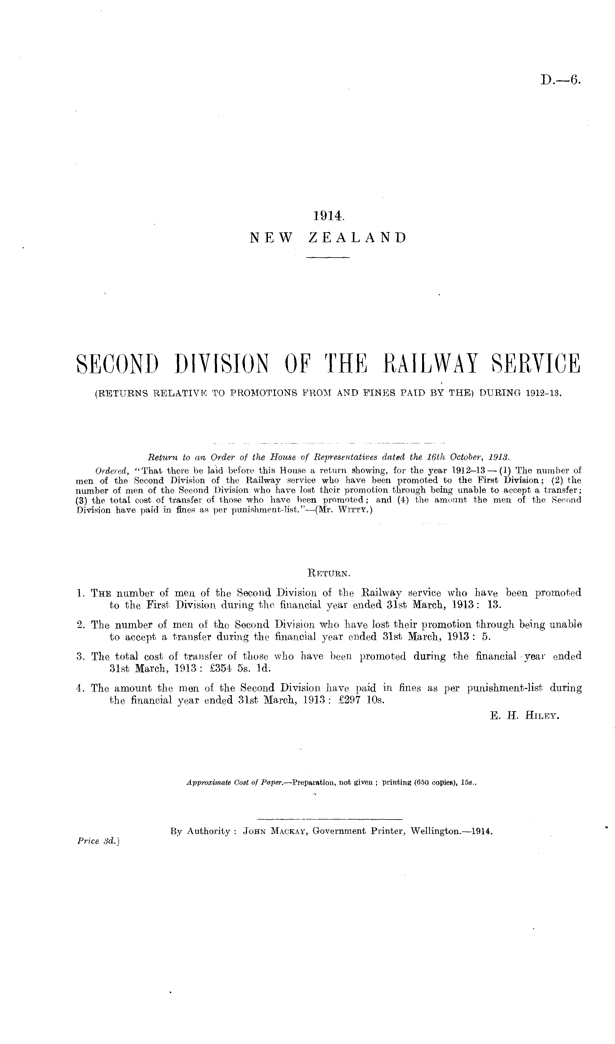 Return to an Order of the House of Representatives dated the 16th October, 1913. Ordered, "That there be laid before this House a return showing, for the year 1912—13 —(1) The number of men of the Second Division of the Railway service who have been promoted to the First Division; (2) the number of men of the Second 'Division who have lost their promotion through being unable to accept a transfer; (3) the total cost of transfer of those who have been promoted; and (4) the amount the men of the Second Division have paid in fines as per punishment-list."—(Mr. Wttty.) Betukn. 1. The number of men of the Second Division of the Railway service who have been promoted to the First Division during the financial year ended 31st March, 1913 : 13. 2. The number of men of the Second Division who have lost their promotion through being unable to accept a transfer during the financial year ended 31st March, 1913 : 5. 3. The total cost of transfer of those who have been promoted during the financial - year ended 31st March, 1913 : £354 ss. Id. 4. The amount the men of the Second Division have paid in fines as per punishment-list during the financial year ended 31st March, 1913 : £297 10s. B. H. Hilby.