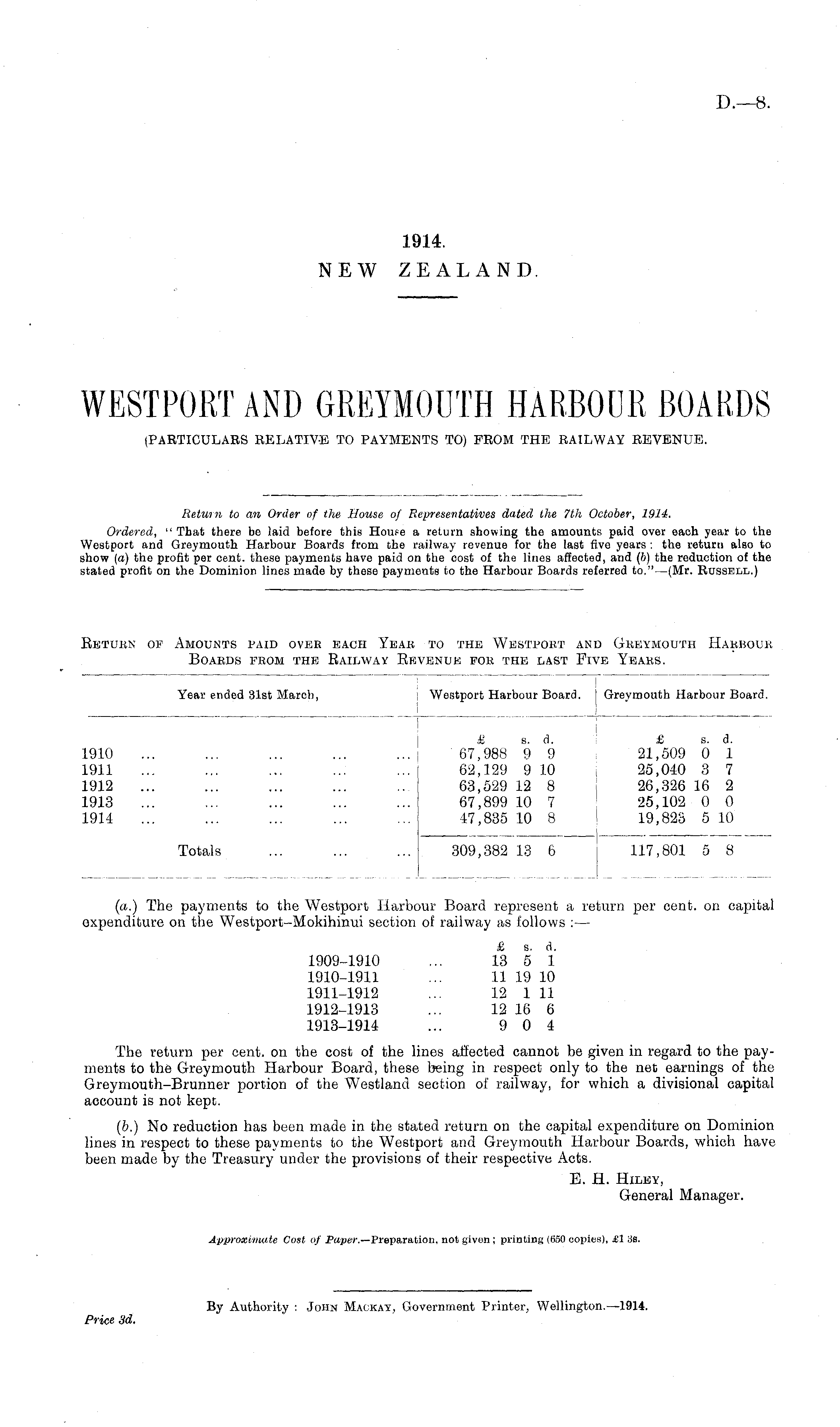 (a.) The payments to the Westport Harbour Board represent a return per cent, on capital expenditure on the Westport-Mokihinui section of railway as follows : — £ s. d. 1909-1910 ... 13 5 1 1910-1911 ... 11 19 10 1911-1912 ... 12 1 11 1912-1913 ... 12 16 6 1913-1914 ... 9 0 4 The return per cent, on the cost of the lines affected cannot be given in regard to the payments to the Greymouth Harbour Board, these being in respect only to the net earnings of the Greymouth-Brunner portion of the Westland section of railway, for which a divisional capital account is not kept. (b.) No reduction has been made in the stated return on the capital expenditure on Dominion lines in respect to these payments to the Westport and Greymouth Harbour Boards, which have been made by the Treasury under the provisions of their respective Acts. E. H. Hiley, General Manager. Approximate Cost of Paper. —Preparation, not given ; printing (650 copies), £1 3s.