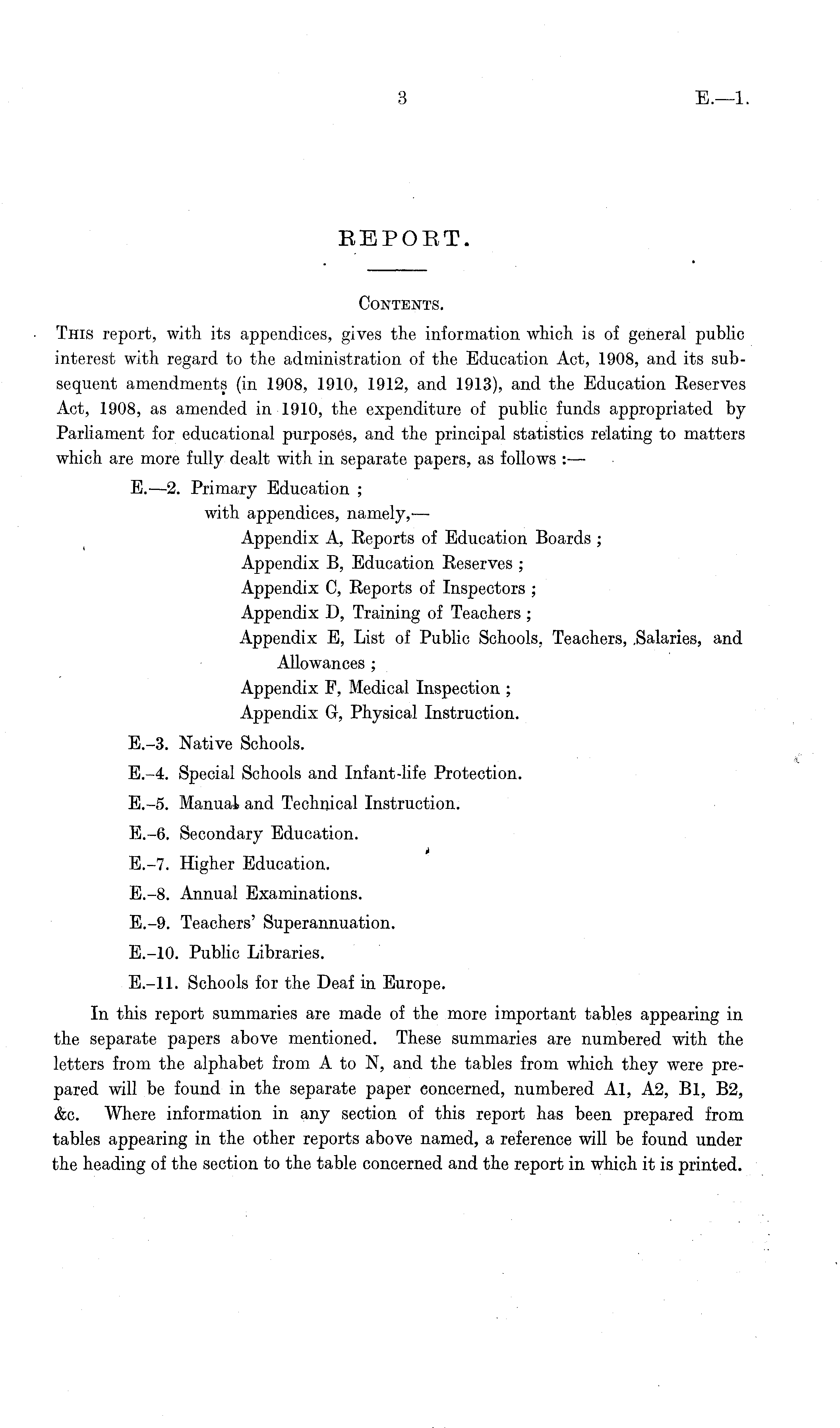 REPORT. Contents. This report, with its appendices, gives the information which is of general public interest with regard to the administration of the Education Act, 1908, and its subsequent amendments (in 1908, 1910, 1912, and 1913), and the Education Eeserves Act, 1908, as amended in 1910, the expenditure of public funds appropriated by Parliament for educational purposes, and the principal statistics relating to matters which are more fully dealt with in separate papers, as follows :— E.—2. Primary Education ; with appendices, namely,— Appendix A, Reports of Education Boards ; Appendix B, Education Reserves ; Appendix C, Reports of Inspectors ; Appendix D, Training of Teachers ; Appendix E, List of Public Schools, Teachers, .Salaries, and Allowances ; Appendix F, Medical Inspection ; Appendix G, Physical Instruction. E.-3. Native Schools. E.-4. Special Schools and Infant-life Protection. E.-5. Manual and Technical Instruction. E.-6. Secondary Education. E.-7. Higher Education. E.-8. Annual Examinations. E.-9. Teachers' Superannuation. E.-10. Public Libraries. E.-11. Schools for the Deaf in Europe. In this report summaries are made of the more important tables appearing in the separate papers above mentioned. These summaries are numbered with the letters from the alphabet from A to N, and the tables from which they were prepared will be found in the separate paper concerned, numbered Al, A 2, 81, 82, &c. Where information in any section of this report has been prepared from tables appearing in the other reports above named, a reference will be found under the heading of the section to the table concerned and the report in which it is printed.