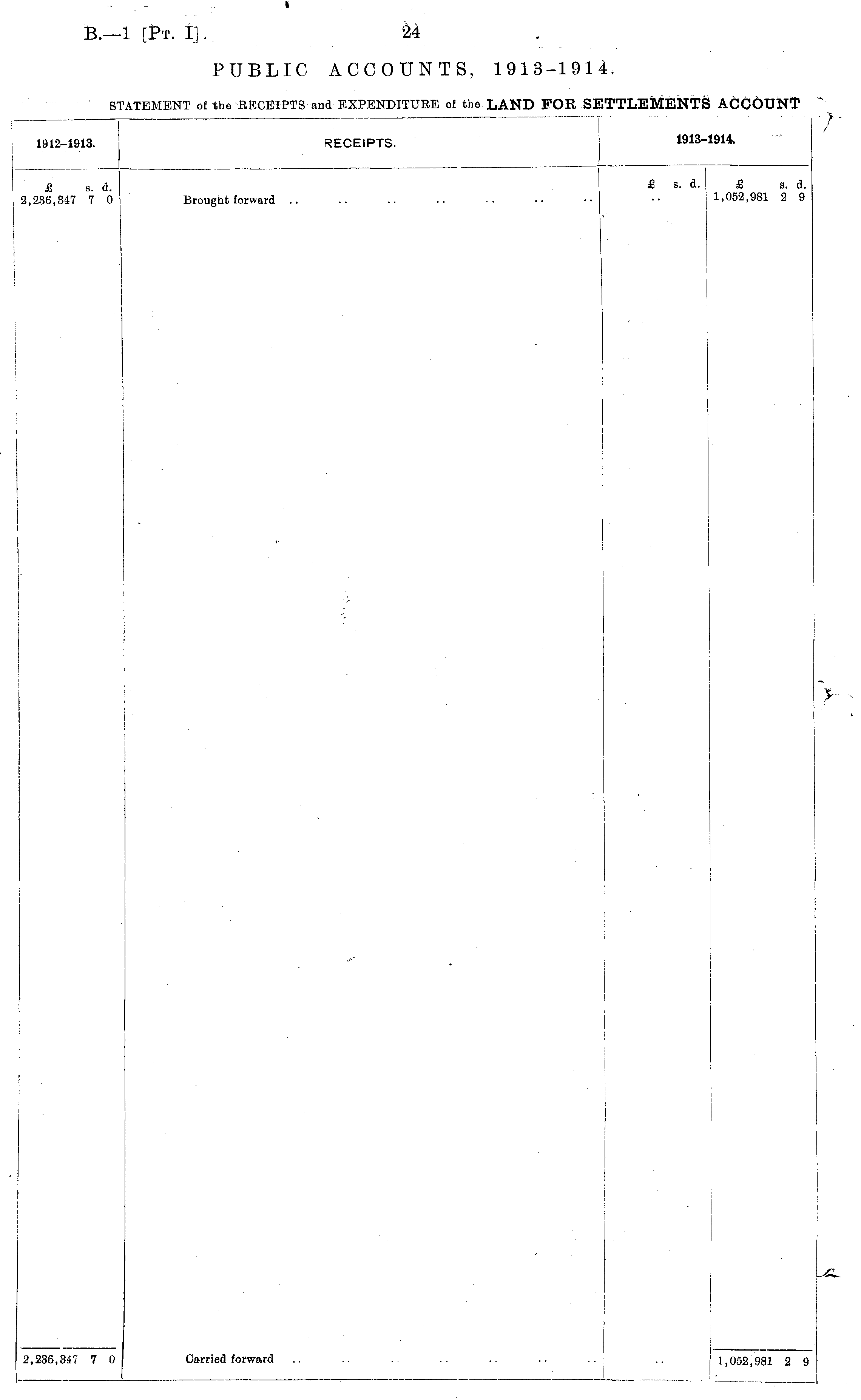 1912-1913. RECEIPTS. 1913-1914. £ s. d. ,236,347 7 0 £ s. a. £ s. d. 1,052,981 2 9 Brought forward ** 2,236,347 1 0 Carried forward 1,052,981 2 9