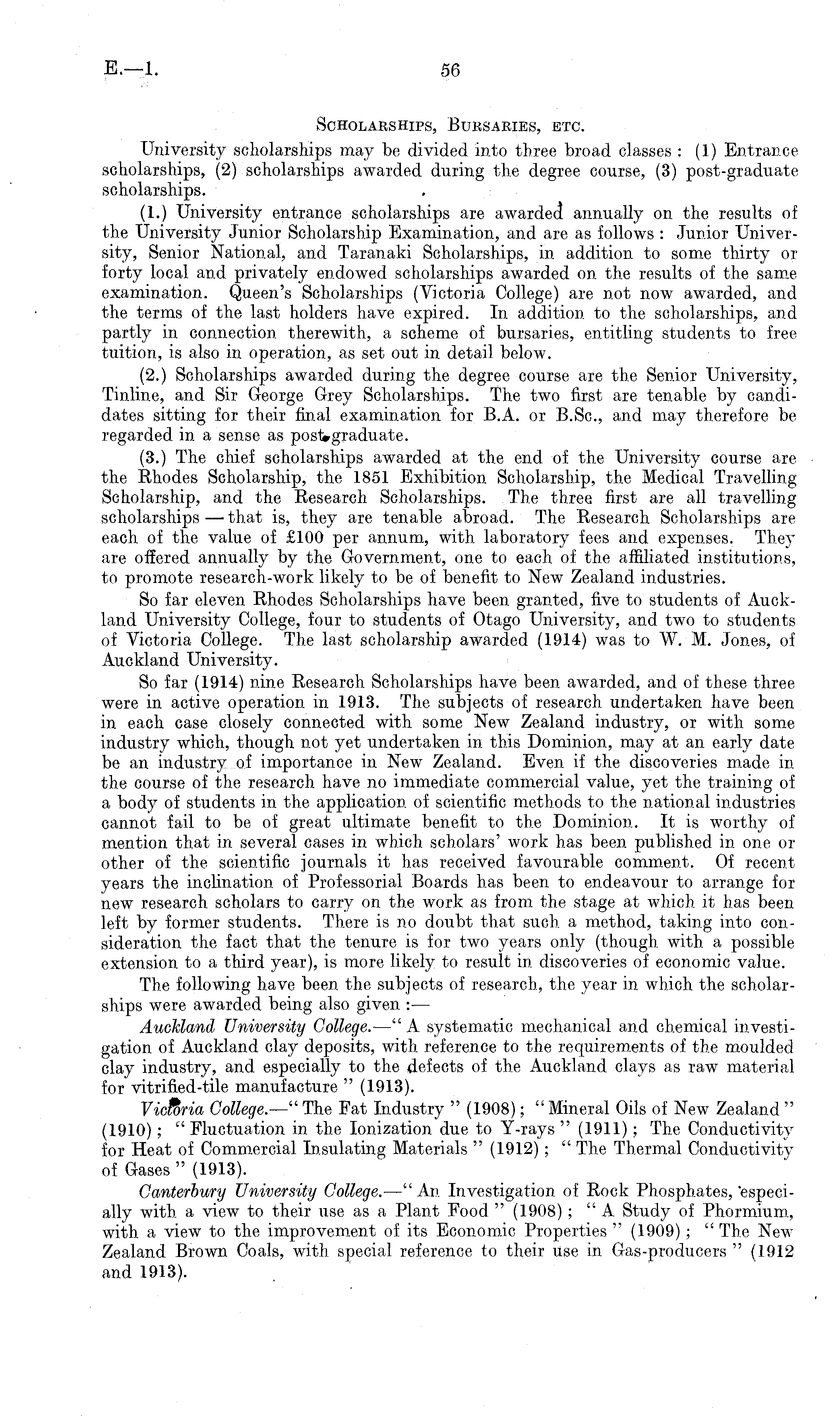 Scholarships, Bursaries, etc. University scholarships may be divided into three broad classes : (1) Entrance scholarships, (2) scholarships awarded during the degree course, (3) post-graduate scholarships. (1.) University entrance scholarships are awarded annually on the results of the University Junior Scholarship Examination, and are as follows : Junior University, Senior National, and Taranaki Scholarships, in addition to some thirty or forty local and privately endowed scholarships awarded on the results of the same examination. Queen's Scholarships (Victoria College) are not now awarded, and the terms of the last holders have expired. In addition to the scholarships, and partly in connection therewith, a scheme of bursaries, entitling students to free tuition, is also in operation, as set out in detail below. (2.) Scholarships awarded during the degree course are the Senior University, Tinline, and Sir George Grey Scholarships. The two first are tenable by candidates sitting for their final examination for B.A. or B.Sc, and may therefore be regarded in a sense as postgraduate. (3.) The chief scholarships awarded at the end of the University course are the Rhodes Scholarship, the 1851 Exhibition Scholarship, the Medical Travelling Scholarship, and the Research Scholarships. The three first are all travelling scholarships—that is, they are tenable abroad. The Research Scholarships are each of the value of £100 per annum, with laboratory fees and expenses. They are offered annually by the Government, one to each of the affiliated institutions, to promote research-work likely to be of benefit to New Zealand industries. So far eleven Rhodes Scholarships have been granted, five to students of Auckland University College, four to students of Otago University, and two to students of Victoria College. The last scholarship awarded (1914) was to W. M. Jones, of Auckland University. So far (1914) nine Research Scholarships have been awarded, and of these three were in active operation in 1913. The subjects of research undertaken have been in each case closely connected with some New Zealand industry, or with some industry which, though not yet undertaken in this Dominion, may at an early date be an industry of importance in New Zealand. Even if the discoveries made in the course of the research have no immediate commercial value, yet the training of a body of students in the application of scientific methods to the national industries cannot fail to be of great ultimate benefit to the Dominion. It is worthy of mention that in several cases in which scholars' work has been published in one or other of the scientific journals it has received favourable comment. Of recent years the inclination of Professorial Boards has been to endeavour to arrange for new research scholars to carry on the work as from the stage at which it has been left by former students. There is no doubt that such a method, taking into consideration the fact that the tenure is for two years only (though with a possible extension to a third year), is more likely to result in discoveries of economic value. The following have been the subjects of research, the year in which the scholarships were awarded being also given :— Auckland University College. —" A systematic mechanical and chemical investigation of Auckland clay deposits, with reference to the requirements of the moulded clay industry, and especially to the defects of the Auckland clays as raw material for vitrified-tile manufacture " (1913). Yicfbria College.— ' The Fat Industry " (1908); " Mineral Oils of New Zealand " (1910) ; " Fluctuation in the lonization due to Y-rays " (1911); The Conductivity for Heat of Commercial Insulating Materials " (1912) ; " The Thermal Conductivity of Gases " (1913). Canterbury University College. —" An Investigation of Rock Phosphates, 'especially with a view to their use as a Plant Food " (1908) ; " A Study of Phormium, with a view to the improvement of its Economic Properties " (1909) ; "The New Zealand Brown Coals, with special reference to their use in Gas-producers " (1912 and 1913).