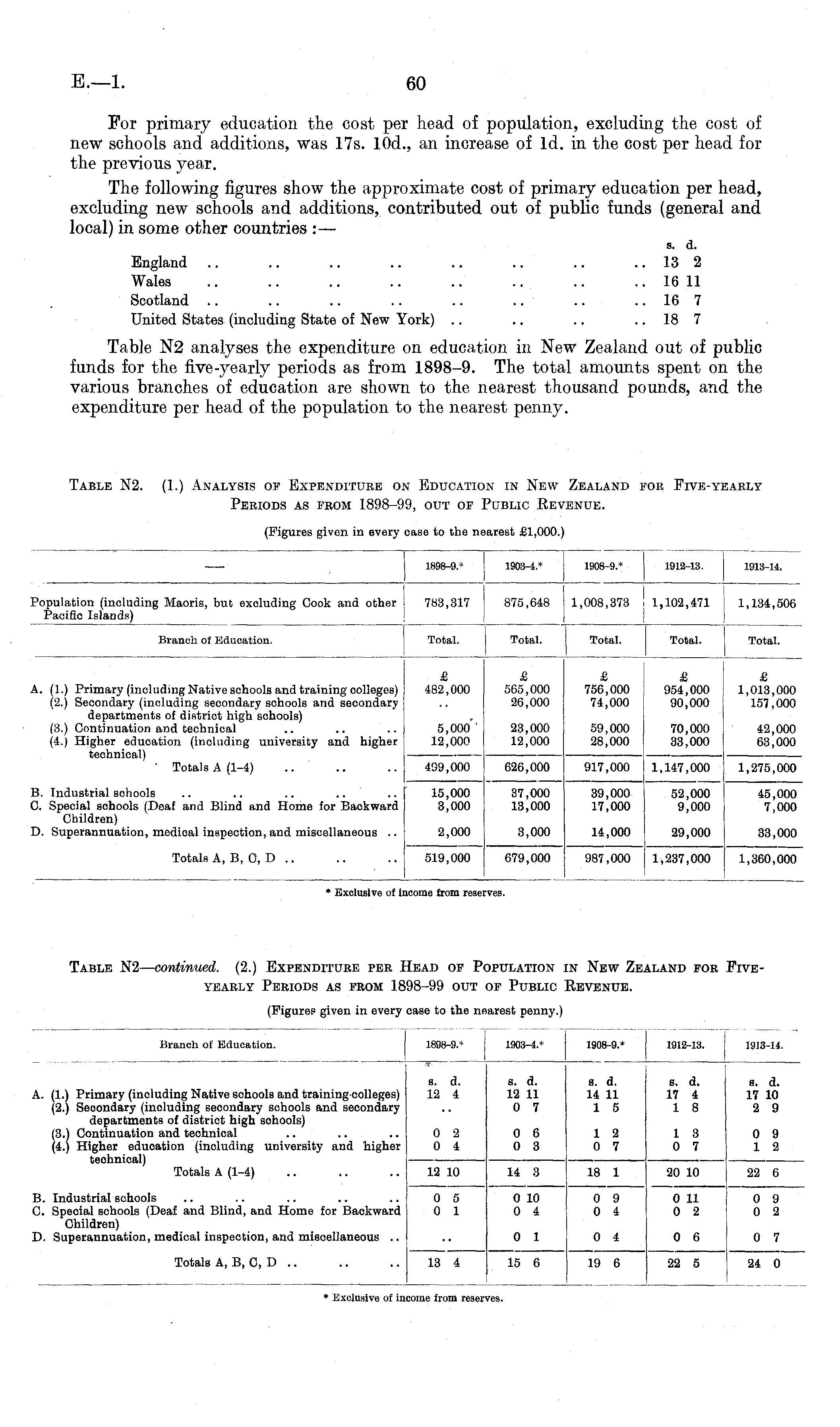 Table N2 — continued. (2.) Expenditure per Head of Population in New Zealand for Fiveyearly Periods as from 1898-99 out of Public Revenue. (Figures given in every case to the nearest penny.)